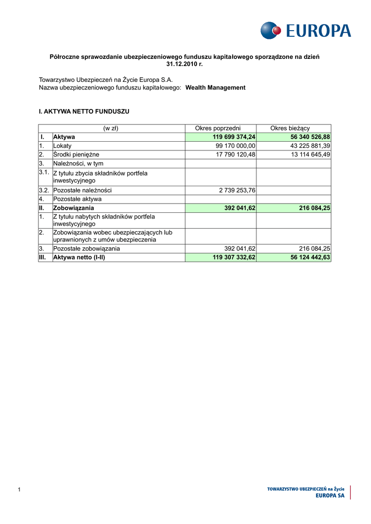 Półroczne sprawozdanie ubezpieczeniowego funduszu kapitałowego sporządzone na dzień 31.12.2010 r. Towarzystwo Ubezpieczeń na Życie Europa S.A. Nazwa ubezpieczeniowego funduszu kapitałowego: Wealth Management I. AKTYWA NETTO FUNDUSZU I. 1. 2. 3. 3.1. 3.2. 4. II. 1. 2. 3. III. 1 (w zł) Aktywa Lokaty Środki pieniężne Należności, w tym Okres poprzedni 119 699 374,24 99 170 000,00 17 790 120,48 Okres bieżący 56 340 526,88 43 225 881,39 13 114 645,49 Z tytułu zbycia składników portfela inwestycyjnego Pozostałe należności Pozostałe aktywa Zobowiązania Z tytułu nabytych składników portfela inwestycyjnego Zobowiązania wobec ubezpieczających lub uprawnionych z umów ubezpieczenia Pozostałe zobowiązania Aktywa netto (I-II) 2 739 253,76 392 041,62 216 084,25 392 041,62 119 307 332,62 216 084,25 56 124 442,63 Sprawozdanie ubezpieczeniowego funduszu kapitałowego sporządzone na dzień 31.12.2010 r. Towarzystwo Ubezpieczeń na Życie Europa S.A. Nazwa ubezpieczeniowego funduszu kapita łowego: Wealth Management II. ZMIANY AKTYWÓW NETTO FUNDUSZU A. B. I. 1. 2. 3. II. 1. 2. 3. 4. 5. 6. 7. (w zł) Aktywa netto funduszu na początek okresu Stan netto z działalności operacyjnej (I-II) Zwiększenia funduszu Tytułem składek zwiększających wartość funduszu Tytułem udzielonych gwarancji Pozostałe zwiększenia Zmniejszenia funduszu Tytułem wykupu Tytułem wypłat pozostałych świadczeń ubezpieczeniowych Tytułem opłaty za ryzyko ubezpieczeniowe oraz innych opłat potrącanych z fuduszu Tytułem zwrotu składek ubezpieczeniowych Tytułem prowizji od składek Tytułem pozostałych prowizji Tytułem opłat za zarządzanie funduszem oraz innych opłat tytułem administrowania funduszem 8. Tytułem udzielonych gwarancji 9. Pozostałe zmniejszenia C. Przychody netto z działalności inwestycyjnej (po potrąceniu kosztów) 1. z papierów wartościowych emitowanych, poręczonych lub gwarantowanych przez skarb państwa lub organizacje międzynarodowe, których członkiem jest Rzeczpospolita Polska 2. z listów zastawnych 5. z innych dłużnych papierów wartościowych o zmiennej stopie dochodu z akcji z udziałów z jednostek uczestnictwa lub certyfikatów inwestycyjnych w funduszach inwestycyjnych 9. 68 286 340,52 105 000,00 9 791 152,80 7 520 662,20 67 211 270,99 65 522 275,86 2270297,46 1 600 861,78 193,14 88 133,35 -5 674 089,82 7 113 600,84 -8 092 082,00 5 305 120,00 2 417 992,18 1 808 480,84 0,00 205 674,22 3 259 031,00 173 196,16 3 363 416,00 119 307 332,62 56 124 442,63 z innych dłużnych papierów wartościowych o stałej stopie dochodu z instrumentów pochodnych, o ile służą zmniejszeniu ryzyka związanego z innymi aktywami stanowiącymi pokrycie rezerw techniczno-ubezpieczeniowych 10. z innych papierów wartościowych o zmiennej stopie dochodu 11. z pożyczek 12. z nieruchomości 13. z depozytów bankowych 14. z lokat dokonanych za zezwoleniem organu nadzoru, zgodnie z art. 154 ust. 9 ustawy o działalności ubezpieczeniowej D. Pozostałe zwiększenia E. Pozostałe zmniejszenia F. Aktywa netto funduszu na koniec okresu sprawozdawczego 2 Okres bieżący 119 307 332,62 -67 106 270,99 105 000,00 z obligacji emitowanych lub por ęczonych przez jednostki samorządu terytorialnego lub związki jednostek samorządu terytorialnego 3. 4. 6. 7. 8. Okres poprzedni 69 539 591,50 58 495 187,72 68 286 340,52 Sprawozdanie ubezpieczeniowego funduszu kapitałowego sporządzone na dzień 31.12.2010 r. Towarzystwo Ubezpieczeń na Życie Europa S.A. Nazwa ubezpieczeniowego funduszu kapita łowego: Wealth Management III KOSZTY FUNDUSZU 1. 2. 3. 4. 5. 6. 7. 3 (w zł) Koszty prowadzenia i obsługi rachunków bankowych Koszty nabycia jednostek rozrachunkowych Koszty przechowywania aktywów funduszu Koszty transakcyjne Koszty zarządzania i administrowania funduszem Pozostałe koszty RAZEM koszty funduszu (suma poz. 1-6): Okres poprzedni Okres bieżący 0,00 0,00 Sprawozdanie ubezpieczeniowego funduszu kapitałowego sporządzone na dzień 31.12.2010 r. Towarzystwo Ubezpieczeń na Życie Europa S.A. Nazwa ubezpieczeniowego funduszu kapitałowego: Wealth Management IV LICZBA I WARTOŚĆ JEDNOSTEK ROZRACHUNKOWYCH (w zł) 1. Liczba jednostek rozrachunkowych 1.1 Liczba jednostek rozrachunkowych na początek okresu sprawozdawczego 1.2 Liczba jednostek rozrachunkowych na koniec okresu sprawozdawczego 2. Wartość jednostki rozrachunkowej (w zł) : 2.1 wartość jednostki rozrachunkowej na początek okresu sprawozdawczego Okres poprzedni Okres bieżący 648750,7370 1235577,1812 1235577,1812 558295,5648 107,19 96,56 95,43 92,78 109,05 102,43 96,56 100,53 2.2 minimalna wartość jednostki rozrachunkowej w okresie sprawozdawczym 2.3 maksymalna wartość jednostki rozrachunkowej w okresie sprawozdawczym 2.4 wartość jednostki rozliczeniowej na koniec okresu sprawozdawczego 4 Sprawozdanie ubezpieczeniowego funduszu kapita łowego sporządzone na dzień 31.12.2010 r. Towarzystwo Ubezpieczeń na Życie Europa S.A. Nazwa ubezpieczeniowego funduszu kapita łowego: Wealth Management V ZESTAWIENIE LOKAT FUNDUSZU - WARTOŚĆ (w zł) Papiery wartościowe emitowane, poręczone lub gwarantowane przez Skarb Państwa lub organizacje międzynarodowe, których członkiem jest Rzeczpospolita Polska : 1.1 Obligacje 1.2 Bony skarbowe 1.3 Inne Obligacje emitowane lub poręczone przez 2. jednostki samorządu terytorialnego lub związki jednostek samorządu terytorialnego 3. Listy zastawne 3.1 Dopuszczone do publicznego obrotu 3.1.1 Notowane na rynku regulowanym 3.1.2 Pozostałe 3.2 Niedopuszczone do publicznego obrotu Wartość bilansowa (w zł) Udział w aktywach funduszu (w %) 1. 0 0% 0 0% 0 0% 0 0% 0,00 0% 0 0% 0 0% 43 225 881,39 77% 43225881,39 43225881,39 77% 77% 4. Inne dłużne papiery wartościowe o stałej stopie dochodu 4.1 Notowane na rynku regulowanym 4.2 Pozostałe 5. Inne dłużne papiery wartościowe o zmiennej stopie dochodu 5.1 Dopuszczone do publicznego obrotu 5.1.1 Notowane na rynku regulowanym 5
