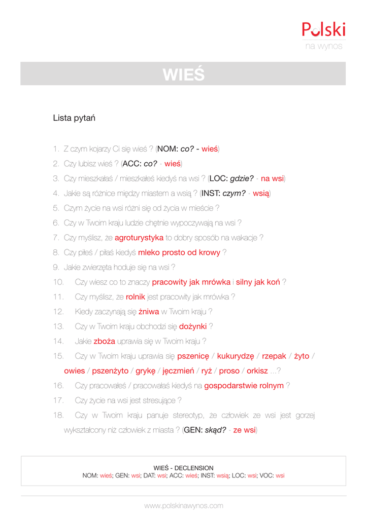 na wynos WIEŚ Lista pytań 1. Z czym kojarzy Ci się wieś ? (NOM: co? - wieś) 2. Czy lubisz wieś ? (ACC: co? - wieś) 3. Czy mieszkałaś / mieszkałeś kiedyś na wsi ? (LOC: gdzie? - na wsi) 4. Jakie są różnice między miastem a wsią ? (INST: czym? - wsią) 5. Czym życie na wsi różni się od życia w mieście ? 6. Czy w Twoim kraju ludzie chętnie wypoczywają na wsi ? 7. Czy myślisz, że agroturystyka to dobry sposób na wakacje ? 8. Czy piłeś / piłaś kiedyś mleko prosto od krowy ? 9. Jakie zwierzęta hoduje się na wsi ? 10. Czy wiesz co to znaczy pracowity jak mrówka i silny jak koń ? 11. Czy myślisz, że rolnik jest pracowity jak mrówka ? 12. Kiedy zaczynają się żniwa w Twoim kraju ? 13. Czy w Twoim kraju obchodzi się dożynki ? 14. Jakie zboża uprawia się w Twoim kraju ? 15. Czy w Twoim kraju uprawia się pszenicę / kukurydzę / rzepak / żyto / owies / pszenżyto / grykę / jęczmień / ryż / proso / orkisz ...? 16. Czy pracowałeś / pracowałaś kiedyś na gospodarstwie rolnym ? 17. Czy życie na wsi jest stresujące ? 18. Czy w Twoim kraju panuje stereotyp, że człowiek ze wsi jest gorzej wykształcony niż człowiek z miasta ? (GEN: skąd? - ze wsi) WIEŚ - DECLENSION NOM: wieś; GEN: wsi; DAT: wsi; ACC: wieś; INST: wsią; LOC: wsi; VOC: wsi www.polskinawynos.com