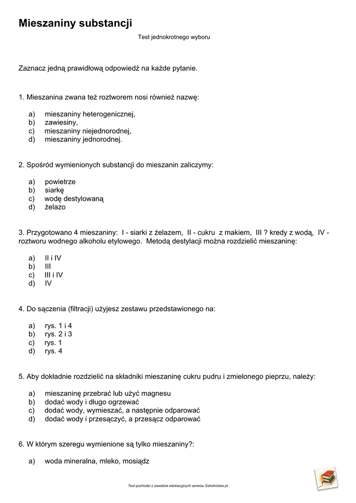 Mieszaniny substancji Test jednokrotnego wyboru Zaznacz jedną prawidłową odpowiedź na każde pytanie. 1. Mieszanina zwana też roztworem nosi również nazwę: a) b) c) d) mieszaniny heterogenicznej, zawiesiny, mieszaniny niejednorodnej, mieszaniny jednorodnej. 2. Spośród wymienionych substancji do mieszanin zaliczymy: a) b) c) d) powietrze siarkę wodę destylowaną żelazo 3. Przygotowano 4 mieszaniny: I - siarki z żelazem, II - cukru z makiem, III ? kredy z wodą, IV roztworu wodnego alkoholu etylowego. Metodą destylacji można rozdzielić mieszaninę: a) b) c) d) II i IV III III i IV IV 4. Do sączenia (filtracji) użyjesz zestawu przedstawionego na: a) b) c) d) rys. 1 i 4 rys. 2 i 3 rys. 1 rys. 4 5. Aby dokładnie rozdzielić na składniki mieszaninę cukru pudru i zmielonego pieprzu, należy: a) b) c) d) mieszaninę przebrać lub użyć magnesu dodać wody i długo ogrzewać dodać wody, wymieszać, a następnie odparować dodać wody i przesączyć, a przesącz odparować 6. W którym szeregu wymienione są tylko mieszaniny?: a) woda mineralna, mleko, mosiądz Test pochodzi z zasobów edukacyjnych serwisu Szkolnictwo.pl b) c) d) mleko, cukier, tlenek magnezu para wodna, mosiądz, sól kuchenna mleko, woda, magnez 7. Do rozdzielenia mieszaniny użyto metody sedymentacji. Na tej podstawie można stwierdzić, że mieszanina ta jest: a) b) c) d) mieszaniną niejednorodną substancji stałych mieszaniną niejednorodną substancji ciekłych mieszaniną niejednorodną substancji ciekłych i stałych mieszaniną jednorodną substancji ciekłych i stałych 8. Która z wymienionych niżej substancji jest mieszaniną?: a) b) c) d) żelazo, słodzona herbata, sól kuchenna, cukier 9. Opadanie cząsteczek ciała stałego w cieczy na dno naczynia pod wpływem siły przyciągania ziemskiego to: a) b) c) d) dekantacja, saturacja, sedymentacja, denaturacja. 10. Dym to mieszanina: a) b) c) d) drobin ciał stałych rozproszonych w fazie gazowej, pęcherzyków gazu rozproszonych w cieczy, drobin ciał stałych rozproszonych w cieczy, pęcherzyków gazu rozproszonych w ciele stałym. 11. Filtr do oczyszczania wody jest przykładem zastosowania: a) b) c) d) chromatografii, filtracji, krystalizacji, destylacji. 12. Naczynie przedstawione na służy do rozdzielania mieszanin przez: a) b) c) d) destylację, odparowanie, dekantację, sączenie. Test pochodzi z zasobów edukacyjnych serwisu Szkolnictwo.pl 13. Do rozdzielania mieszanin wykorzystuje się różnice we właściwościach fizycznych ich składników. Destylacja wykorzystuje: a) b) c) d) gęstość, temperaturę topnienia, rozpuszczalność w wodzie, temperaturę wrzenia. 14. Do rozdzielenia mieszaniny oleju z wodą użyjesz: a) b) c) d) parownicy, chłodnicy, lejka, rozdzielacza. 15. W zestawie do destylacji numerem 1 oznaczono: a) b) c) d) kolbę, termometr, chłodnicę, odbieralnik. Test pochodzi z zasobów edukacyjnych serwisu Szkolnictwo.pl
