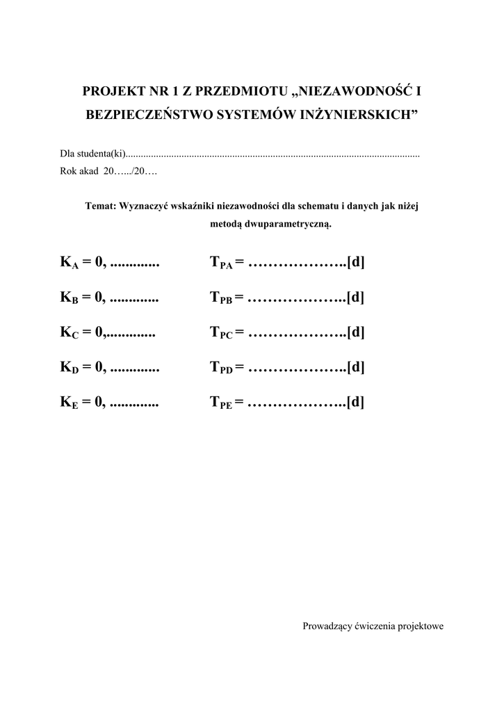 PROJEKT NR 1 Z PRZEDMIOTU ,,NIEZAWODNOŚĆ I BEZPIECZEŃSTWO SYSTEMÓW INŻYNIERSKICH” Dla studenta(ki).................................................................................................................... Rok akad 20….../20…. Temat: Wyznaczyć wskaźniki niezawodności dla schematu i danych jak niżej metodą dwuparametryczną. KA = 0, ............. TPA = ………………..[d] KB = 0, ............. TPB = ………………..[d] KC = 0,............. TPC = ………………..[d] KD = 0, ............. TPD = ………………..[d] KE = 0, ............. TPE = ………………..[d] Prowadzący ćwiczenia projektowe