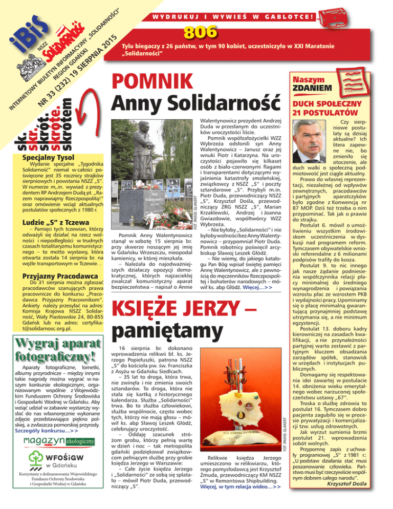 „S OL ID AR 20 NO 15 ŚC I” 806 Tylu biegaczy z 26 państw, w tym 90 kobiet, uczestniczyło w XXI Maratonie „Solidarności” POMNIK Anny Solidarność Specjalny Tysol FOT. PAWEŁ GLANERT Wydanie specjalne „Tygodnika Solidarność” niemal w całości poświęcone jest 35 rocznicy strajków sierpniowych i powstania NSZZ „S”. W numerze m,.in. wywiad z prezydentem RP Andrzejem Dudą pt. „Razem naprawiajmy Rzeczpospolitą!” oraz omówienie wciąż aktualnych postulatów społecznych z 1980 r. Ludzie „S” z Tczewa – Pamięci tych tczewian, którzy odważyli się działać na rzecz wolności i niepodległości w trudnych czasach totalitaryzmu komunistycznego – to motto wystawy, która otwarta została 14 sierpnia br. na węźle transportowym w Tczewie. . Przyjazny Pracodawca Do 31 sierpnia można zgłaszać pracodawców szanujących prawa pracownicze do konkursu „Pracodawca Przyjazny Pracownikom”. Ankiety należy przesyłać na adres: Komisja Krajowa NSZZ Solidarność, Wały Piastowskie 24, 80-855 Gdańsk lub na adres: certyfi[email protected]. Wygraj aparat fotograficzny! Aparaty fotograficzne, lornetki, albumy przyrodnicze – między innymi takie nagrody można wygrać w naszym konkursie ekologicznym, organizowanym wspólnie z Wojewódzkim Funduszem Ochrony Środowiska i Gospodarki Wodnej w Gdańsku. Aby wziąć udział w zabawie wystarczy wysłać do nas własnoręcznie wykonane zdjęcie przedstawiające piękno polskiej, a zwłaszcza pomorskiej przyrody. Szczegóły konkursu...>> ekologiczny PRAWO Korzystamy z do�nansowania Wojewódzkiego Funduszu Ochrony Środowiska i Gospodarki Wodnej w Gdańsku Pomnik Anny Walentynowicz stanął w sobotę 15 sierpnia br. przy skwerze noszącym jej imię w Gdańsku Wrzeszczu, nieopodal kamienicy, w której mieszkała. – Należała do najodważniejszych działaczy opozycji demokratycznej, których najzacieklej zwalczał komunistyczny aparat bezpieczeństwa – napisał o Annie Naszym ZDANIEM DUCH SPOŁECZNY 21 POSTULATÓW Walentynowicz prezydent Andrzej Duda w przesłanym do uczestników uroczystości liście. Pomnik współzałożycielki WZZ Wybrzeża odsłonili syn Anny Walentynowicz – Janusz oraz jej wnuki Piotr i Katarzyna. Na uroczystości pojawiło się kilkaset osób z biało-czerwonymi flagami i transparentami dotyczącymi wyjaśnienia katastrofy smoleńskiej, związkowcy z NSZZ „S” i poczty sztandarowe „S”. Przybyli m.in. Piotr Duda, przewodniczący NSZZ „S”, Krzysztof Dośla, przewodniczący ZRG NSZZ „S”, Marian Krzaklewski, Andrzej i Joanna Gwiazdowie, współtwórcy WZZ Wybrzeża. – Nie byłoby „Solidarności” i nie byłoby wolności bez Anny Walentynowicz – przypomniał Piotr Duda. Pomnik robotnicy poświęcił arcybiskup Sławoj Leszek Głódź. – Nie wiemy, do jakiego katalogu Pan Bóg wpisał świętej pamięci Annę Walentynowicz, ale z pewnością do męczenników Rzeczpospolitej i bohaterów narodowych – mówił ks. abp Głódź. Więcej…>> KSIĘŻE JERZY – pamiętamy 16 sierpnia br. dokonano wprowadzenia relikwii bł. ks. Jerzego Popiełuszki, patrona NSZZ „S” do kościoła pw. św. Franciszka z Asyżu w Gdańsku Siedlcach. – 35 lat to droga, która trwa, nie zwinęła i nie zmienia swoich sztandarów. To droga, która nie stała się kartką z historycznego kalendarza. Służba „Solidarności” trwa. Bo to służba człowiekowi, służba wspólnocie, często wobec tych, którzy nie mają głosu – mówił ks. abp Sławoj Leszek Głódź, celebrujący uroczystość. – Oddaję szacunek stróżom grobu, którzy pełnią wartę w dzień i noc – tak metropolita gdański podziękował związkowcom pełniącym służbę przy grobie księdza Jerzego w Warszawie: – Całe życie księdza Jerzego i „Solidarności” ze sobą się splatało – mówił Piotr Duda, przewodniczący „S”. FOT. PAWEŁ GLANERT PN IA BI NS UL ZZ ET YN RE GI INF ON O R GD MA C SI AŃS YJN ER KI Y iB iS sk. skr. NR skrót. 33 skróte. (232 skrótem ) 19 IN TE RN ET OW Y WYDRUKUJ I WYWIEŚ W GABLOTCE! Relikwie księdza Jerzego umieszczono w relikwiarzu, którego pomysłodawcą jest Krzysztof Żmuda, przewodniczący KM NSZZ „S” w Remontowa Shipbuilding. Więcej, w tym relacja wideo…>> Czy sierpniowe postulaty są dzisiaj aktualne? Ich litera zapewne nie, bo zmieniło się otoczenie, ale duch walki o społeczną podmiotowość jest ciągle aktualny. Prawo do własnej reprezentacji, niezależnej od wpływów zewnętrznych, pracodawców i partyjnych aparatczyków było zgodne z Konwencją nr 87 MOP. Dziś też trzeba o nim przypominać. Tak jak o prawie do strajku. Postulat 6. mówił o umożliwieniu wszystkim środowiskom uczestniczenia w dyskusji nad programem reform. Tymczasem obywatelskie wnioski referendalne z 6 milionami podpisów trafiły do kosza. Postulat 9. to nic innego jak nasze żądanie podniesienia współczynnika relacji płacy minimalnej do średniego wynagrodzenia i powiązania wzrostu płac ze wzrostem PKB i wydajności pracy. Upominamy się o płacę minimalną gwarantującą przynajmniej podstawę utrzymania się, a nie minimum egzystencji. Postulat 13. doboru kadry kierowniczej na zasadach kwalifikacji, a nie przynależności partyjnej warto zestawić z partyjnym kluczem obsadzania zarządów spółek, stanowisk w urzędach i instytucjach publicznych. Domagamy się respektowania idei zawartej w postulacie 14. obniżenia wieku emerytalnego wobec narzuconej społeczeństwu ustawy „67”. Troska o służbę zdrowia to postulat 16. Tymczasem dobro pacjenta zagubiło się w procesie prywatyzacji i komercjalizacji tzw. usług zdrowotnych. Jak wyrzut sumienia brzmi postulat 21. wprowadzenia sobót wolnych. Przypomnę zapis z uchwały programowej „S” z 1981 r.: „U podstaw działania stać musi poszanowanie człowieka. Państwo musi być rzeczywiście wspólnym dobrem całego narodu”. Krzysztof Dośla CYTAT tygodnia Dlaczego należę do „SOLIDARNOŚCI”? Z
