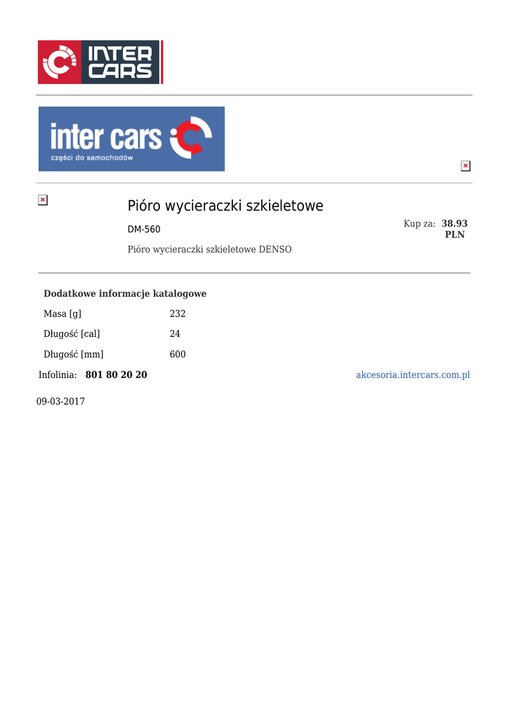 Pióro wycieraczki szkieletowe Kup za: 38.93 PLN DM-560 Pióro wycieraczki szkieletowe DENSO Dodatkowe informacje katalogowe Masa [g] 232 Długość [cal] 24 Długość [mm] 600 Infolinia: 801 80 20 20 09-03-2017 akcesoria.intercars.com.pl