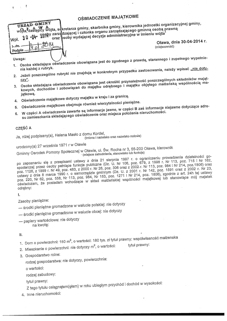 OSWIADCZENIE MAJATKOWE kretarza gminy, skarbnika gminy, kierownika jednostki organizacyjnej gminy, zarz^dzaja^cej i cztonka organu zarza_dzaja_cego gminna_ osoba. prawny oraz |soby wydaja^cej decyzje administracyjne w imieniu wojta1 OJawa, dnia 30-04-2014 r. (miejscowosc) Uwaga: 1. Osoba skiadaja^ca oswiadczenie obowia_zana jest do zgodnego z prawda,, starannego i zupemego wypelnienia kaidej z rubryk. 2. Jezeli poszczegolne rubryki nie znajduja^ w konkretnym przypadku zastosowania, nalezy wpisac ,,nle dotvczy". 3. Osoba sktadaja_ca oswiadczenie obowiazana jest okreslic przynaleznosc poszczegolnych sktadnikow majajtkowych, dochodow i zobowiazan do majajtku odr^bnego i majatku objetego matzeriska, wspolnoscia_ majatkowa,. 4. Oswiadczenie majajtkowe dotyczy majatku w kraju i za granicg_. 5. Oswiadczenie majatkowe obejmuje rowniezwierzytelnosci pieni^zne. 6. W cz^sci A oswiadczenia zawarte sa_ informacje jawne, w cz^sci B zas informacje niejawne dotycza_ce adresu zamieszkania sktadaja^cego oswiadczenie oraz miejsca potozenia nieruchomosci, CZ^SC A Ja, nizej podpisany(a), Helena Maslo z domu Kordel, (imiona i nazwisko oraz nazwisko rodowe) urodzony(a) 27 wrzesnia 1971 r w Olawie Gminny Osrodek Pomocy Spoleczne] w Otawie, ul. Sw. Rocha nr 3, 55-200 Olawa, kierownik • (mie]sce zatrudnienia, stanowisko lub funkoja) po zapoznaniu si§ z przepisami ustawy z dnia 21 sierpnia 1997 r. o ograniczeniu prowadzenia dzialalnosci gospodarczej przez osoby petnia_ce funkcje publiczne (Dz. U. Nr 106, poz. 679, z 1998 r. Nr 113, poz. 715 i Nr 162, poz. 1126, z 1999 r. Nr49, poz. 483, z 2000 r. Nr 26, poz. 306 oraz z 2002. r. Nr 113, poz. 984 i Nr214, poz.1806) oraz ustawy z dnia 8 marca 1990 r. o samorza_dzie gminnym (Dz, U. z 2001 r. Nr 142, poz. 1591 oraz z 2002 r. Nr 23, poz. 220, Nr 62, poz. 558, Nr 113, poz. 984, Nr 153, poz. 1271 i Nr 214, poz. 1806),'zgodnie z art. 24h tej ustawy oswiadczam, ze posiadam wchodza_ce w sktad mateenskiej wspolnosci majatkowej lub stanowia.ce moj majatek odr^bny: Zasoby pieni^zne: — srodki pieni^zne gromadzone w walucie poiskiej: nie dotyczy — srodki pieni^zne gromadzone w walucie obcej: nie dotyczy — papiery wartosciowe: nie dotyczy na kwote; II. 1. Dom o powierzchni: 150 m2, o wartosci: 180 tys. ~A tytul prawny: wspolwlasnosc malzenska 2. Mieszkanie o powierzchni: nie dotyczy m2, o wartosci: tytuJ prawny: 3. Gospodarstwo rolne: rodza] gospodarstwa: nie dotyczy, powierzchnia: o wartosci: rodzaj zabudowy: tytut prawny: Z tego tytulu osiqgnajem(ejam) w roku ubiegtym przychod i dochod w wysokosci: 4. Inne nieruchomosci: powierzchnia: 20 arow dzialka na ktorej stoi dom wymieniony w pkt 11-1 o wartosci: 60 tys. zl tytul prawny: wspolwlasnosc malzenska III. Posiadam udzialy w spolkach handlowych — nalezy podac liczb? i emitejita udzialow: nie dotyczy udziafy te stanowia_ pakiet wie.kszy niz 10% udzia!6w w sp6lce: Z tego tytulu osiajgnalem(ejam) w roku-ubieglym doch6d w wysokosci: IV. Posiadam akcje w spolkach handlowych — nalezy podac liczb? i emitenta akcji: nie dotyczy akcje te stanowia^ pakiet wi^kszy niz 10% akcji w sp6tee: Z tego tytulu osiqgnajem(ejam) w roku ubiegtym dochod w wysokosci: V. Nabytem(am) (nabyl moj matzonek, z wylaczeniem mienia przynaleznego do jego maja,tku odr^bnego) od Skarbu Panstwa, innej pahstwowej osoby prawnej, jednostek samorza_du terytorialnego, ich zwiazkow lub od komunalnej osoby prawnej naste.puja_ce mienie, kt6re podlegato zbyciu w drodze przetargu — nalezy podac opis mienia i dat§ nabycia, od kogo: nie dotyczy VI. 1. Prowadze. dziatelnosc gospodarcza,2 (nalezy podac form? prawny i przedmiot dzialalnosci): •— osobiscie nie dotyczy •— wspolnie z innymi osobami Z tego tytulu osiajgnajem(ejam) w roku ubiegtym przychod i dochod w wysokosci: 2. Zarza_dzam dziaialnoscia_ gospodarcza_ lub jestem przedstawicielem, petnomocnikiem takiej dzialalnosci (nalezy podac form? prawnaj przedmiot dziatalnosci): —• osobiscie nie dotyczy — wspolnie z innymi osobami Z tego tytulu osiajgnajem(§tem) w roku ubiegtym doch6d w wysokosci: VII. 1. W spolkach handlowych (nazwa, siedziba spolki): nie dotyczy — jestem czlonkiem zarzajdu (od kiedy): — jestem czlonkiem rady nadzorczej (od kiedy): — jestem czlonkiem komisji rewizyjnej (od kiedy): Z tego tytulu osiajgnalem(e_lam) w roku ubieglym doch6d w wysokosci: 2. W spoldzielniach: nie dotyczy — jestem czlonkiem zarzajdu (od kiedy): — jestem czlonkiem rady nadzorczej3 (od kiedy): — jestem czlonkiem komisji rewizyjnej (od kiedy): Z tego tytutu osiajgnajem(ejam) w roku ubieglym dochod w wysokosci: • *v<A/ fundacjach prowadza_cych dzialalnos6 gospodarczaj . nie dotyczy — jestem cztonkiem zarzajdu (od kiedy): — jestem czfonkiem rady nadzorczej (od kiedy): • — jestem czionkiem komisji rewizyjnej (od kiedy): Z tego tytulu osi3gnajem(ejam) w roku ubiegtym dochod w wysokosci: VIII. Inne dochody osiajgane z tytulu zatrudnienia lub innej dziatalnosci zarobkowej lub zaj§6, z podaniem kwot uzyskiwanych z kazdego tytuiu: z tytulu zatrudnienia z umowy o prace. - 82 352,22 zJ, z tytulu umowy zlecenie - 11 480,00 z\j Maslo z tytulu umowy o prac§ - 49 844,10 zt "XSkiadniki mienia ruchomego o wartosci powyzej 10 000 zlotych (w przypadku pojazdow mechanicznych nale±y poda6 marke., model i rok produkcji): nie dotyczy " X. Zobowiazania pieni^zne o wartosci powyzej 10 000 ztotych, w tym zaciajni^te kredyty i pozyczki oraz warunki, na jakich zostaty udzielone (wobec kogo, w zwiazku z jakim zdarzeniem, w jakiej wysokosci): '' Kredyt hipoteczny na budow§ domu udzielony Helenie i Andrzejowi Mask) saldo zadluzenia na dzien 31-12-2013r 64 800,00 zt CZ^SC B Powyzsze oswiadczenie sktadam swiadomy(a), iz na podstawie art. 233 § 1 Kodeksu karnego za podanie nieprawdy lub zatajenie prawdy grozi kara pozbawienia wolnosci. Otewa, 30-04-2014 (miejscowosc, data) (podpis) Niewtasciwe skreslic. Nie dotyczy dzialalnosci wytworczej w rolnictwie w zakresie produkcji roslinnej i zwierz§cej, w formie i zakresie 