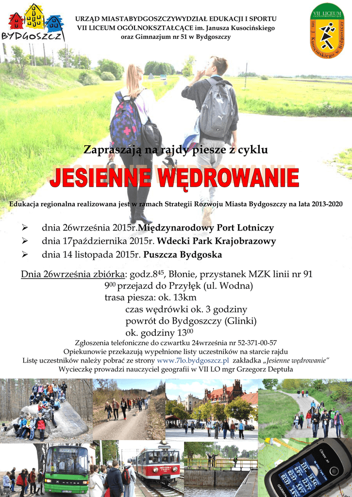 URZĄD MIASTABYDGOSZCZYWYDZIAŁ EDUKACJI I SPORTU VII LICEUM OGÓLNOKSZTAŁCĄCE im. Janusza Kusocińskiego oraz Gimnazjum nr 51 w Bydgoszczy Zapraszają na rajdy piesze z cyklu Edukacja regionalna realizowana jest w ramach Strategii Rozwoju Miasta Bydgoszczy na lata 2013-2020 dnia 26września 2015r.Międzynarodowy Port Lotniczy dnia 17października 2015r. Wdecki Park Krajobrazowy dnia 14 listopada 2015r. Puszcza Bydgoska Dnia 26września zbiórka: godz.845, Błonie, przystanek MZK linii nr 91 900 przejazd do Przyłęk (ul. Wodna) trasa piesza: ok. 13km czas wędrówki ok. 3 godziny powrót do Bydgoszczy (Glinki) ok. godziny 1300 Zgłoszenia telefoniczne do czwartku 24września nr 52-371-00-57 Opiekunowie przekazują wypełnione listy uczestników na starcie rajdu Listę uczestników należy pobrać ze strony www.7lo.bydgoszcz.pl zakładka „Jesienne wędrowanie” Wycieczkę prowadzi nauczyciel geografii w VII LO mgr Grzegorz Deptuła