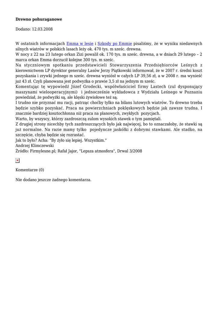 Drewno pohuraganowe Dodano: 12.03.2008 W ostatnich informacjach Emma w lesie i Szkody po Emmie pisaliśmy, że w wyniku niedawnych silnych wiatrów w polskich lasach leży ok. 470 tys. m sześc. drewna. W nocy z 22 na 23 lutego orkan Zizi powalił ok. 170 tys. m sześc. drewna, a w dniach 29 lutego – 2 marca orkan Emma dorzucił kolejne 300 tys. m sześc. Na styczniowym spotkaniu przedstawicieli Stowarzyszenia Przedsiębiorców Leśnych z kierownictwem LP dyrektor generalny Lasów Jerzy Piątkowski informował, że w 2007 r. średni koszt pozyskania i zrywki jednego m sześc. drewna wyniósł w całych LP 39,56 zł, a w 2008 r. ma wynieść już 43 zł. Czyli planowana jest podwyżka o prawie 3,5 zł na jednym m sześc. Komentując tę wypowiedź Józef Grodecki, współwłaściciel firmy Lastech (zul dysponujący maszynami wielooperacyjnymi) i jednocześnie wykładowca z Wydziału Leśnego w Poznaniu powiedział, że podwyżki są, ale klęski żywiołowe też są. I trudno nie przyznać mu racji, patrząc choćby tylko na bilans lutowych wiatrów. To drewno trzeba będzie szybko pozyskać. Praca na powierzchniach poklęskowych będzie jak zawsze trudna. I znacznie bardziej kosztochłonna niż praca na planowych, zwykłych pozycjach. Warto, by wszyscy, którzy zazdroszczą zulom wysokich stawek o tym pamiętali. Z drugiej strony nicechby tych zazdroszczących było jak najwięcej, bo to oznaczałoby, że stawki są już normalne. Na razie mamy tylko pojedyncze jaskółki z dobrymi stawkami. Ale stadko, na szczęście, chyba będzie się rozrastać. Jak to było? Acha: "By żyło się lepiej. Wszystkim." Andrzej Klimczewski Żródło: Firmylesne.pl; Rafał Jajor, "Lepsza atmosfera", Drwal 3/2008 Komentarze (0) Nie dodano jeszcze żadnego komentarza.