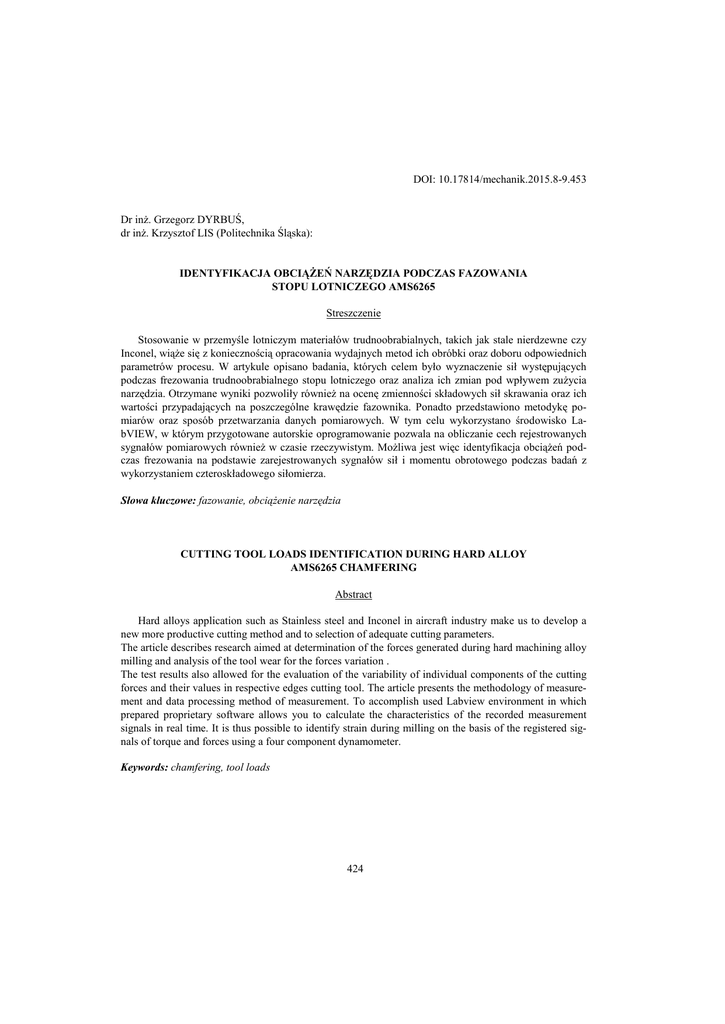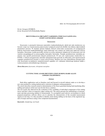 DOI: 10.17814/mechanik.2015.8-9.453 Dr inż. Grzegorz DYRBUŚ, dr inż. Krzysztof LIS (Politechnika Śląska): IDENTYFIKACJA OBCIĄŻEŃ NARZĘDZIA PODCZAS FAZOWANIA STOPU LOTNICZEGO AMS6265 Streszczenie Stosowanie w przemyśle lotniczym materiałów trudnoobrabialnych, takich jak stale nierdzewne czy Inconel, wiąże się z koniecznością opracowania wydajnych metod ich obróbki oraz doboru odpowiednich parametrów procesu. W artykule opisano badania, których celem było wyznaczenie sił występujących podczas frezowania trudnoobrabialnego stopu lotniczego oraz analiza ich zmian pod wpływem zużycia narzędzia. Otrzymane wyniki pozwoliły również na ocenę zmienności składowych sił skrawania oraz ich wartości przypadających na poszczególne krawędzie fazownika. Ponadto przedstawiono metodykę pomiarów oraz sposób przetwarzania danych pomiarowych. W tym celu wykorzystano środowisko LabVIEW, w którym przygotowane autorskie oprogramowanie pozwala na obliczanie cech rejestrowanych sygnałów pomiarowych również w czasie rzeczywistym. Możliwa jest więc identyfikacja obciążeń podczas frezowania na podstawie zarejestrowanych sygnałów sił i momentu obrotowego podczas badań z wykorzystaniem czteroskładowego siłomierza. Słowa kluczowe: fazowanie, obciążenie narzędzia CUTTING TOOL LOADS IDENTIFICATION DURING HARD ALLOY AMS6265 CHAMFERING Abstract Hard alloys application such as Stainless steel and Inconel in aircraft industry make us to develop a new more productive cutting method and to selection of adequate cutting parameters. The article describes research aimed at determination of the forces generated during hard machining alloy milling and analysis of the tool wear for the forces variation . The test results also allowed for the evaluation of the variability of individual components of the cutting forces and their values in respective edges cutting tool. The article presents the methodology of measurement and data processing method of measurement. To accomplish used Labview environment in which prepared proprietary software allows you to calculate the characteristics of the recorded measurement signals in real time. It is thus possible to identify strain during milling on the basis of the registered signals of torque and forces using a four component dynamometer. Keywords: chamfering, tool loads 424 IDENTYFIKACJA OBCIĄŻEŃ NARZĘDZIA PODCZAS FAZOWANIA STOPU LOTNICZEGO AMS6265 Grzegorz DYRBUŚ1, Krzysztof LIS 1 WPROWADZENIE Stosowanie materiałów trudnoobrabialnych w przemyśle lotniczym takich jak stale nierdzewne oraz Inconel sprawia, iż konieczne staje się opracowanie wydajnych metod oraz dobór odpowiednich parametrów ich obróbki. W artykule opisano badania, których celem było wyznaczenie sił występujących podczas frezowania trudnoobrabialnego stopu lotniczego oraz analiza ich zmian pod wpływem zużycia narzędzia. Wyniki badań pozwoliły również na ocenę zmienności poszczególnych składowych sił skrawania oraz ich wartości przypadających na poszczególne krawędzie fazownika. 2 BADANIA TRWAŁOŚCI ORAZ OBCIĄŻENIA NARZĘDZIA Podczas obróbki materiałów trudnoobrabialnych, niejednokrotnie problem stanowi nie tylko sam proces skrawania, dobór narzędzi i parametrów obróbki. Z uwagi na koszt procesu i wytwarzanych elementów, przed narzędziem staje również problem niezawodności i trwałości. Dlatego w ramach prowadzonych badań skupiono się na dwóch problemach dotyczących eksploatacji narzędzi. Przeprowadzono badanie trwałości narzędzia, podczas którego dokonywano pomiaru sił działających na narzędzie. Dzięki temu, o analizie wyników można było określić wpływ zużycia narzędzia na siły podczas obróbki. Badania przeprowadzono w Laboratorium Obrabiarek i Obróbki Skrawaniem, Katedry Budowy Maszyn. W skład stanowiska pomiarowego wchodziły: 1 Politechnika Śląska, Katedra Budowy Maszyn, Gliwice, Konarskiego 18C 425 Pionowe centrum frezarskie DMU60 monoblock Siłomierz wiertarski Kistler 9272 Wzmacniacz ładunku Kistler 5070 Karty analogowo cyfrowa National Instruments USB 6009 Komputer klasy PC wraz z oprogramowaniem LabView Badaniom poddano frez ECF D-4/45-4C10 firmy ISCAR (Rys. 1) przeznaczony do wykonywania faz oraz pogłębień stożkowych. Frez wykonany był z węglika spiekanego o oznaczeniu IC900. Materiał ten przeznaczony jest do obróbki stopów żaroodpornych, twardych stali stopowych oraz węglowych ze średnimi oraz wysokimi prędkościami skrawania. W tabeli 1 zestawiono parametry geometryczne narzędzia [2]. Rys. 1 Badane narzędzie frez ECF D-4/45-4C10 [12] D5[mm] 2 Tabela 1. Wymiary narzędzia d[mm] 10 ap[mm] 4 L[mm] 72 ilość ostrzy 4 Materiał, z jakiego wykonana została próbka to stal o oznaczeniu AMS6265, skład materiału przedstawiono w tabeli 2. Wymiary próbki wynosiły 122x10x60 mm. Stal ta stosowana jest zazwyczaj na elementy przekładni oraz elementy samolotów. Stop ten odznacza się bardzo dobrymi właściwościami wytrzymałościowymi oraz odpornością na zużycie. Posiada bardzo dobrą ciągliwość zarówno w stanie zahartowanym jak i odpuszczonym. Nadaje się do nawęglania oraz hartowania powierzchniowego [1]. Badaniom był poddany materiał w stanie miękkim, o twardości ok 40 HRC. Tabela 2. Skład chemiczny stopu AMS 6265 % C Si Mn P S Cr Mo Ni B Cu Min 0,07 0,15 0,4 1 0,08 3 - 426 Max 0,13 0,35 0,7 0,015 0,015 1,4 0,15 3,5 0,001 0,35 Próbka została zamocowana w imadle maszynowym przytwierdzonym do płyty górnej siłomierza tak, aby środek płytki pokrywał się z osią siłomierza. Siłomierz został przymocowany do stołu obrabiarki tak, aby osie pomiaru sił były równoległe do osi obrabiarki. Fx Fy Fz Rys. 2. Siłomierz wraz z zamocowanym imadłem Na rysunku 2 oznaczono kierunki oraz zwroty osi, w których mierzone były siły i moment działający na próbkę, wynikający ze skrawania poza osią pionową siłomierza. Parametry zastosowanego siłomierza p