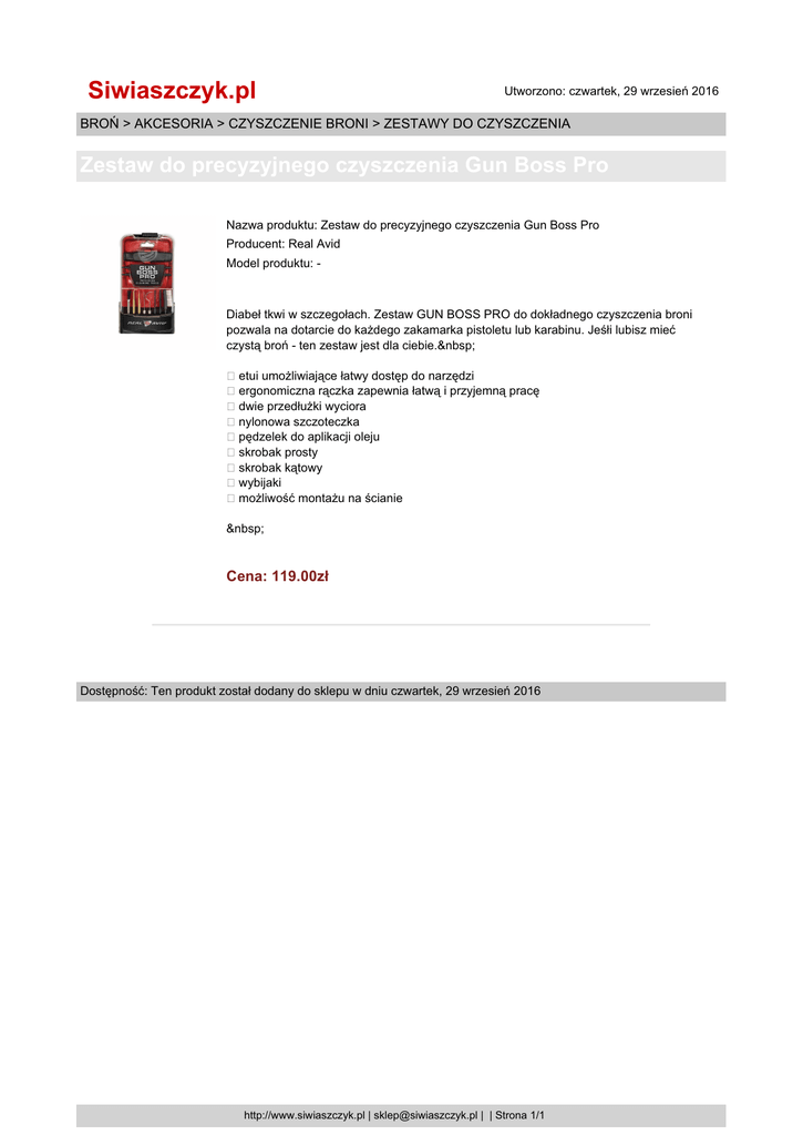 Siwiaszczyk.pl Utworzono: czwartek, 29 wrzesień 2016 BROŃ > AKCESORIA > CZYSZCZENIE BRONI > ZESTAWY DO CZYSZCZENIA Zestaw do precyzyjnego czyszczenia Gun Boss Pro Nazwa produktu: Zestaw do precyzyjnego czyszczenia Gun Boss Pro Producent: Real Avid Model produktu: - Diabeł tkwi w szczegołach. Zestaw GUN BOSS PRO do dokładnego czyszczenia broni pozwala na dotarcie do każdego zakamarka pistoletu lub karabinu. Jeśłi lubisz mieć czystą broń - ten zestaw jest dla ciebie. etui umożliwiające łatwy dostęp do narzędzi ergonomiczna rączka zapewnia łatwą i przyjemną pracę dwie przedłużki wyciora nylonowa szczoteczka pędzelek do aplikacji oleju skrobak prosty skrobak kątowy wybijaki możliwość montażu na ścianie Cena: 119.00zł Dostępność: Ten produkt został dodany do sklepu w dniu czwartek, 29 wrzesień 2016 http://www.siwiaszczyk.pl | [email protected] | | Strona 1/1