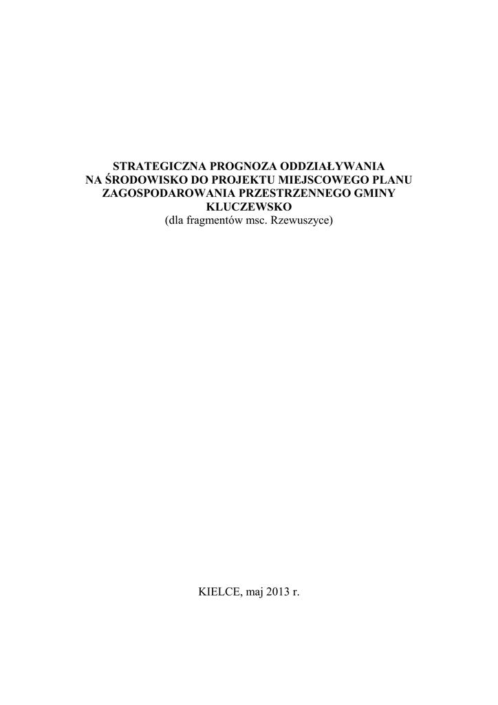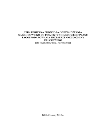 STRATEGICZNA PROGNOZA ODDZIAŁYWANIA NA ŚRODOWISKO DO PROJEKTU MIEJSCOWEGO PLANU ZAGOSPODAROWANIA PRZESTRZENNEGO GMINY KLUCZEWSKO (dla fragmentów msc. Rzewuszyce) KIELCE, maj 2013 r. SPIS TREŚCI I Część ogólna 4 II Zakres prognozy 6 III Metody zastosowane przy sporządzaniu prognozy 7 IV Przewidywane metody analizy skutków realizacji postanowień projektowanego 7 dokumentu oraz częstotliwości jego przeprowadzenia V Informacje o transgranicznym oddziaływaniu na środowisko 8 VI Istniejący stan środowiska 8 VI.1 VI.2 VI.3 VI.4 VI.5 VI.6 Zagospodarowanie terenu Rzeźba terenu Budowa geologiczna ZłoŜa Warunki wodne Warunki aerosanitarne, akustyczne 8 9 9 10 11 14 VI.7 Warunki klimatyczne 16 VI.8 Gospodarka odpadami 16 VI.9 Warunki glebowe i szata roślinna 17 VI.10 Formy ochrony przyrody VII Prognozowane zmiany stanu środowiska w przypadku zaniechania realizacji mpzp VIII Stan środowiska na obszarach objętych przewidywanym znaczącym oddziaływaniem Problemy ochrony środowiska istotne dla realizacji planu w szczególności dotyczące obszarów podlegających ochronie na podstawie Ustawy z dnia 16 kwietnia 2004 r. o ochronie przyrody. Cele ochrony środowiska ustanowione na szczeblu międzynarodowym, wspólnotowym i krajowym, istotne z punktu widzenia projektowanego dokumentu oraz sposoby, w jakich te cele i inne problemy środowiska zostały uwzględnione podczas opracowania dokumentu. Przewidywane znaczne oddziaływania, w tym oddziaływania bezpośrednie, pośrednie, wtórne, skumulowane, krótkoterminowe, średnioterminowe i długoterminowe, stałe i chwilowe oraz pozytywne i negatywne, na cele i przedmiot ochrony obszarów mających znaczenia dla Wspólnoty oraz integralność tego obszaru, a takŜe na środowisko. Rozwiązania mające na celu zapobieganie, ograniczanie lub kompensację przyrodniczą negatywnych oddziaływań na środowisko, mogących być rezultatem realizacji projektowanego dokumentu, w szczególności na cele i przedmiot ochrony obszarów mających znaczenia dla Wspólnoty oraz integralność tego obszaru. IX X XI XII 17 19 21 22 23 25 28 2 XIII Rozwiązania alternatywne 29 XIV Streszczenie 29 3 I. Część ogólna Przedmiotem niniejszego opracowania jest Prognoza Oddziaływania na Środowisko (zwana dalej Prognozą) projektu Miejscowego Planu Zagospodarowania Przestrzennego terenów eksploatacji złóŜ piasków „Rzewuszyce” w obrębie wsi Rzewuszyce na obszarze Gminy Kluczewsko. Miejscowy plan zagospodarowania przestrzennego gminy stanowi dokument, o którym mowa w art. 46 ust. 1 ustawy z dnia 3 października 2008 r. o udostępnianiu informacji o środowisku i jego ochronie, udziale społeczeństwa w ochronie środowiska oraz o ocenach oddziaływania na środowisko (Dz. U. Nr 199, poz. 1227 ze zm.), wymagający przeprowadzenia strategicznej oceny oddziaływania na środowisko i sporządzenia prognozy oddziaływania na środowisko (art. 51, ust.1). Prognoza oddziaływania na środowisko dotycząca projektu miejscowego planu zagospodarowania przestrzennego gminy jest załącznikiem do projektu mpzp gminy i stanowi materiał pomocniczy ułatwiający interpretację i realizację planu. Celem niniejszego opracowania jest określenie i ocena skutków realizacji ustaleń projektu miejscowego planu na środowisko i walory kulturowe obszaru objętego planem oraz wskazanie, w jaki sposób rozwiązania przyjęte w projekcie mpzp przekształcą środowisko, na ile pozwolą na zachowanie istniejących wartości lub ich wzbogacenie oraz czy mogą spowodować zagroŜenie dla środowiska. Głównym celem rozwoju zagospodarowania przestrzennego gminy Kluczewsko, zgodnie ze „Strategią rozwoju województwa świętokrzyskiego” jest poprawa warunków Ŝycia ludności na terenie gminy oraz jej zrównowaŜony rozwój oparty o ład przestrzenny. W planie została zastosowana zasada zrównowaŜonego rozwoju gminy Kluczewsko, która prowadzi do zagospodarowania przestrzennego gminy jako atrakcyjnego, przyjaznego miejsca zamieszkania, pracy i wypoczynku. Podstawę formalną sporządzenia prognozy i ustalenia jej zakresu stanowią: • • • • • • Ustawa z dnia 3 października 2008 r. o udostępnianiu informacji o środowisku i jego ochronie, udziale społeczeństwa w ochronie środowiska oraz o ocenach oddziaływania na środowisko (Dz. U. Nr 199, poz. 1227 ze zm.), Ustawa z dnia 27 marca 2003 r. o planowaniu i zagospodarowaniu przestrzennym, (Dz. U. z 2012 r. poz. 647 ze zm.), Rozporządzenia: Rozporządzenie Rady Ministrów w sprawie określenia rodzajów przedsięwzięć mogących znacząco oddziaływać na środowisko z dnia 9 listopada 2010 r. (Dz. U. nr 213, poz. 1397), Rozporządzenie Ministra Środowiska z 14.06.2007 r. w sprawie dopuszczalnych poziomów hałasu w środowisku (Dz. U. Nr 120, poz. 826 ze zm), Rozporządzenie Ministra Środowiska z dnia 24 sierpnia 2012 r. (Dz. U. 2012 poz. 1031), w sprawie poziomu niektórych substancji w powietrzu; Rozporządzenie Ministra Środowiska z dnia 30 października 2003 r. w sprawie poziomów pól elektromagnetycznych w środowisku oraz sposobów sprawdzania dotrzymania tych poziomów. (Dz. U. nr 192, poz. 1883). 4 Prognozę opracowano na podstawie danych i opracowań instytucji regionalnych związanych z działalnością w zakresie ochrony środowiska oraz innych materiałów. Podstawą opracowania prognozy stanowią równieŜ materiały archiwalne dot. walorów przyrodniczych i kulturowych oraz stanu środowiska obszaru objętego planem. Prognoza składa się z części tekstowej i graficznej. Część graficzną opracowania stanowi mapa w skali: 1 : 20 000 Zakres ustaleń planu miejscowego dla którego sporządzono prognozę oddziaływania na środowisko: • Przedmiotem projektu miejscowego planu zagospodarowania przestrzennego gminy jest fragment msc. Rzewuszyce w gminie Kluczewsko, w tym teren eksploatacji złóŜ piasków „Rzewuszyce”. Ustalenia planu obejmują: -przeznaczenie terenów oraz lini