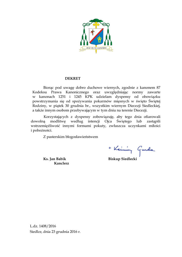 DEKRET Biorąc pod uwagę dobro duchowe wiernych, zgodnie z kanonem 87 Kodeksu Prawa Kanonicznego oraz uwzględniając normy zawarte w kanonach 1251 i 1245 KPK udzielam dyspensy od obowiązku powstrzymania się od spożywania pokarmów mięsnych w święto Świętej Rodziny, w piątek 30 grudnia br., wszystkim wiernym Diecezji Siedleckiej, a także innym osobom przebywającym w tym dniu na terenie Diecezji. Korzystających z dyspensy zobowiązuję, aby tego dnia ofiarowali dowolną modlitwę według intencji Ojca Świętego lub zastąpili wstrzemięźliwość innymi formami pokuty, zwłaszcza uczynkami miłości i pobożności. Z pasterskim błogosławieństwem Ks. Jan Babik Kanclerz L.dz. 1408/2016 Siedlce, dnia 23 grudnia 2016 r. Biskup Siedlecki