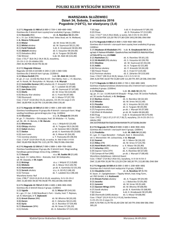 POLSKI KLUB WYŚCIGÓW KONNYCH WARSZAWA SŁUŻEWIEC Dzień 34, Sobota, 3 września 2016 Pogodnie (+24°C), tor elastyczny (3,4) 1 (271) Nagroda 11 900 zł (6 800–2 720–1 360–680–340) Gonitwa dla 3-letnich koni czystej krwi arabskiej II grupy. (1600m) 1 (5) Danaida (RU) dż. A. Reznikov 56 (81,90) kl. s. 3 l. (ur. 9.04) Dahess – Daliia, hod. Veles Stud, wł. N. Melbard, tr A. Nieora-Tchkuaseli 2 (3) Matar dż. M. Srnec 58 (11,40) 3 (2) Mirlet okulary dż. W. Szymczuk 58 (11,30) 4 (1) Farid Talatash k.dż. K. Grzybowski 58 (81,90) 5 (4) Abduhl okulary dż. S. Vasyutov 58 (34,40) 6 (7) Dekadens (RU) dż. A. Turgaev 58 (50,40) 7 (6) Winner k.dż. M. Abík 58 (131,00) Czas: 1'53,7" (8,6-34,2-34,4-36,5), wysyłany, 1½-1½-1-11-1¼-daleko (35) ZWC 81,90 PDK 49,50 TRJ 82,50 2 (272) Nagroda Vilniusa Nagroda 18 550 zł (10 600–4 240–2 120–1 060–530) Gonitwa dla 2-letnich koni I grupy. (1200m) 1 (4) Mona Kerbili (FR) k.dż. M. Abík 56 (18,00) kl. gn. 2 l. (ur. 22.03) No Risk At All – Star Bahia, hod. L. i H. Boscher, wł. A. Kozak, W. Raszyńska i A. Wyrzyk, tr A. Wyrzyk 2 (2) Invincible Gunner (IRE) okulary dż. P. Krowicki 57 (9,60) 3 (7) Dylayla okulary dż. T. Lukášek 56 (47,80) 4 (1) Jam Duke (GB) dż. W. Szymczuk 57 (47,80) 5 (3) Dżefa dż. M. Srnec 56 (124,40) 6 (5) Beauty Star okulary dż. C. Fraisl 56 (47,80) 7 (6) Dżumandi dż. S. Mazur 57 (37,70) Czas: 1'13,5" (13,8-28,2-31,5), pewnie, 1¼-3½-1¼-szyja-3-1¾ ZWC 18,00 PDK 14,30 TRJ 114,40 DBL-DWJ 235,40 3 (273) Nagroda 10 500 zł (6 000–2 400–1 200–600–300) Gonitwa handikapowa IV grupy dla 4-letnich i starszych koni. Wagi według handikapu generalnego plus 5 kg. (1200m) 1 (4) Dżusticja st.u. A. Chopyk 61 (59,60) kl. gn. 7 l. Roulette – Dżiuseppa, hod. SK Widzów – K. Tyszko, wł. M., M. i K. Boruta, tr M. Boruta 2 (5) Monterey st.u. I. Wójcik 62 (13,40) 3 (6) Chirpy okulary dż. A. Turgaev 59,5 (26,50) 4 (2) Sobol okulary u. M. Sommer 60,5 (30,60) 5 (7) Stefan pr.dż. K. Kamińska 60 (19,80) 6 (3) Juan Luoo dż. S. Mazur 61 (54,20) 7 (1) Junclow okulary u. T. Pastuszka 65 (38,50) Czas: 1'14,9" (13,9-29,4-31,6), w walce, kr. łeb-5-łeb-1-4-5½ ZWC 59,60 PDK 98,00 TRJ 1121,20 TPL 768,70 DBL-DWJ BW 4 (274) Nagroda 12 250 zł (7 000–2 800–1 400–700–350) Gonitwa handikapowa III grupy dla 3-letnich koni. Wagi według handikapu generalnego minus 6 kg. (2000m) 1 (7) Kaszub st.u. M. Szabla 58 (21,60) og. kaszt. 3 l. Safety Wire – Konsola, hod. SK Golejewko, wł. M. Zawada, tr M. Łojek 2 (2) Brisingr st.u. I. Wójcik 57,5 (9,80) 3 (6) Miskela dż. S. Mazur 54,5 (20,70) 4 (4) Hammamet pr.dż. K. Kamińska 52 (51,50) 5 (3) Serock okulary st.u. A. Gil 45,5 (48,10) 6 (1) Temaxa dż. T. Lukášek 55,5 (48,10) Wycofane konie: Naf Czas: 2'08,7" (33,9-31,8-31,4-31,6), wysyłany, ¾-½-1¼-1¼-2 ZWC 21,60 DWJ 49,50 TRJ 49,00 TPL 942,40 DBL-DWJ BW 5 (275) Nagroda 15 750 zł (9 000–3 600–1 800–900–450) Gonitwa dla 2-letnich klaczy II grupy. (1200m) 1 (3) Ugoda dż. S. Mazur 57 (143,50) kl. c.gn. 2 l. (ur. 2.04) Needham's Fort – Usalia, hod. T. Rejman, wł. R. Mamajek, tr T. Dębowski 2 (5) Great Chance (IRE) dż. M. Březina 58 (10,10) 3 (8) Karen dż. E. Zahariev 58 (13,20) 4 (6) Syria dż. A. Reznikov 57 (54,40) 5 (7) Shantaram (SPA) dż. M. Srnec 57 (35,10) 6 (1) Kolada dż. A. Kabardov 57 (121,50) Wydział Spraw Hodowlano-Wyścigowych 7 (4) Joga k.dż. K. Grzybowski 57 (83,10) 8 (2) Elisaa dż. D. Petryakov 57 (112,80) Czas: 1'14,7" (14,3-29,6-30,8), w walce, łeb-3-3½-¾-1¾-20-8 ZWC 143,50 PDK 123,20 TRJ 577,80 CZW 2452,90 DBL-DWJ BW 6 (276) Nagroda 8 400 zł (4 800–1 920–960–480–240) Gonitwa dla 4-letnich i starszych koni czystej krwi arabskiej III grupy. (1400m) 1 (7) Shadwan Al Khalediah (FR) k.dż. K. Grzybowski 58 (8,30) og. kaszt. 4 l. Nashwan Al Khalidiah – Quesche du Paon, hod. Khalid B.S.B. Abdul Aziz Al Saud, wł. Polska AKF Sp. z o.o., tr A. Walicki 2 (2) Nachshon (IL) dż. A. Reznikov 59 (41,10) 3 (3) SS Mothill (FR) okulary dż. S. Vasyutov 62 (39,70) 4 (5) Wasilew dż. W. Szymczuk 62 (34,10) 5 (4) Addis dż. A. Turgaev 62 (51,80) 6 (6) Narcyz okulary dż. P. Krowicki 59 (44,20) 7 (8) Flower Power dż. C. Fraisl 57 (119,30) 8 (1) Portman okulary dż. E. Zahariev 59 (132,60) Czas: 1'34,5" (28-31,6-34,9), łatwo, 5-4-1-½-5-12-11 ZWC 8,30 PDK 18,50 TRJ 53,80 CZW 111,90 TPL 997,20 DBL-DWJ BW 7 (277) Nagroda 11 900 zł (6 800–2 720–1 360–680–340) Gonitwa międzynarodowa eksterierowa dla 3-letnich koni czystej krwi arabskiej II grupy. (2200m) 1 (1) Pistolero k.dż. M. Abík 58 (29,70) og. gn. 3 l. (ur. 11.04) Kahil Al Shaqab – Pinga, hod. SK Janów Podlaski, wł. SK Janów Podlaski, tr B. Strójwąs 2 (2) Bachus okulary dż. A. Reznikov 58 (32,50) 3 (3) Wioska dż. M. Srnec 56 (12,40) 4 (5) Pasados dż. S. Vasyutov 58 (22,10) 5 (8) Esidon okulary dż. A. Turgaev 58 (35,90) 6 (7) Forgissima okulary pr.dż. J. Wyrzyk 56 (57,80) 7 (4) Efekt Al Khalediah pr.dż. M. Szabla 58 (65,00) 8 (6) Elsag k.dż. K. Grzybowski 58 (173,50) Czas: 2'45,1" (16,5-37,2-37-37,7-36,7), wysyłany, 2½-¾-2½-3½-5-1daleko (36) ZWC 29,70 PDK 89,00 TRJ 473,60 CZW BW KWN BW TPL 2477,50 DBL-DWJ BW 8 (278) Nagroda 15 750 zł (9 000–3 600–1 800–900–450) Gonitwa dla 3-letnich i starszych koni II grupy. (1600m) 1 (1) Finalistka k.dż. M. Abík 54 (22,80) kl. c.gn. 3 l. Cape Benedict – Fallujah, hod. S. Weresiński, wł. S. Weresiński i M. Lichocińska, tr A. Wyrzyk 2 (6) Szamet dż. S. Mazur 56 (16,10) 3 (2) Nikus (FR) dż. M. Srnec 57 (19,70) 4 (8) Hard Work (IRE) okulary u. K. Mazur 56 (32,90) 5 (7) Inheritor (IRE) dż. T. Lukášek 60 (35,50) 6 (4) Sopran Tamo (ITY) dż. A. Reznikov 60 (37,00) 7 (3) Campo di Fiori (IRE) pr.dż. J. Wyrzyk 57 (68,40) Wycofane dodatkowo: Admiral Quest Czas: 1'38,6" (7,8-30,2-29,6-31), wysyłany, ½-3-1¼-¾-5½-2 ZWC 22,80 PDK 35,90 TRJ 123,20 CZW 360,30 TPL 215,80 DBL-DWJ BW 9 (279) Nagroda 10 500 zł (6 000–2 400–1 200–600–300) Gonitwa dla