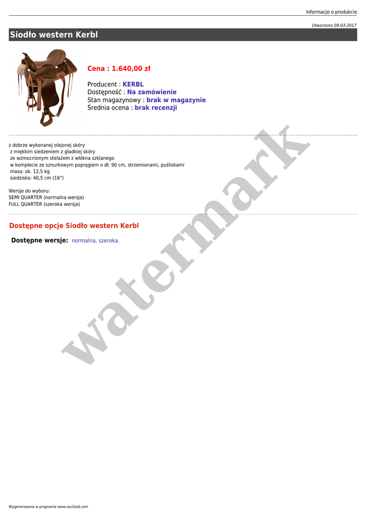 Informacje o produkcie Utworzono 09-03-2017 Siodło western Kerbl Cena : 1.640,00 zł Producent : KERBL Dostępność : Na zamówienie Stan magazynowy : brak w magazynie Średnia ocena : brak recenzji Wersje do wyboru: SEMI QUARTER (normalna wersja) FULL QUARTER (szeroka wersja) er m ar k z dobrze wykonanej olejonej skóry z miękkim siedzeniem z gładkiej skóry ze wzmocnionym stelażem z włókna szklanego w komplecie ze sznurkowym popręgiem o dł. 90 cm, strzemionami, puśliskami masa: ok. 12,5 kg siedzisko: 40,5 cm (16") Dostępne opcje Siodło western Kerbl w at Dostępne wersje: normalna, szeroka. Wygenerowano w programie www.oscGold.com