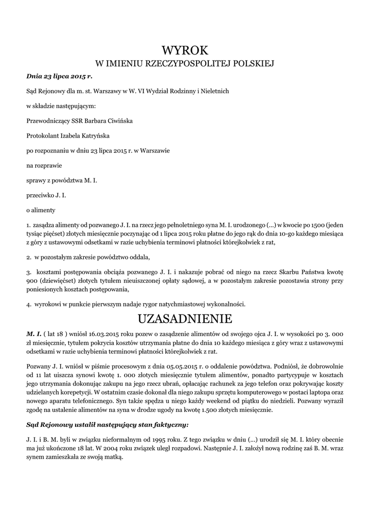 WYROK W IMIENIU RZECZYPOSPOLITEJ POLSKIEJ Dnia 23 lipca 2015 r. Sąd Rejonowy dla m. st. Warszawy w W. VI Wydział Rodzinny i Nieletnich w składzie następującym: Przewodniczący SSR Barbara Ciwińska Protokolant Izabela Katryńska po rozpoznaniu w dniu 23 lipca 2015 r. w Warszawie na rozprawie sprawy z powództwa M. I. przeciwko J. I. o alimenty 1. zasądza alimenty od pozwanego J. I. na rzecz jego pełnoletniego syna M. I. urodzonego (...) w kwocie po 1500 (jeden tysiąc pięćset) złotych miesięcznie poczynając od 1 lipca 2015 roku płatne do jego rąk do dnia 10-go każdego miesiąca z góry z ustawowymi odsetkami w razie uchybienia terminowi płatności którejkolwiek z rat, 2. w pozostałym zakresie powództwo oddala, 3. kosztami postępowania obciąża pozwanego J. I. i nakazuje pobrać od niego na rzecz Skarbu Państwa kwotę 900 (dziewięćset) złotych tytułem nieuiszczonej opłaty sądowej, a w pozostałym zakresie pozostawia strony przy poniesionych kosztach postępowania, 4. wyrokowi w punkcie pierwszym nadaje rygor natychmiastowej wykonalności. UZASADNIENIE M. I. ( lat 18 ) wniósł 16.03.2015 roku pozew o zasądzenie alimentów od swojego ojca J. I. w wysokości po 3. 000 zł miesięcznie, tytułem pokrycia kosztów utrzymania płatne do dnia 10 każdego miesiąca z góry wraz z ustawowymi odsetkami w razie uchybienia terminowi płatności którejkolwiek z rat. Pozwany J. I. wniósł w piśmie procesowym z dnia 05.05.2015 r. o oddalenie powództwa. Podniósł, że dobrowolnie od 11 lat uiszcza synowi kwotę 1. 000 złotych miesięcznie tytułem alimentów, ponadto partycypuje w kosztach jego utrzymania dokonując zakupu na jego rzecz ubrań, opłacając rachunek za jego telefon oraz pokrywając koszty udzielanych korepetycji. W ostatnim czasie dokonał dla niego zakupu sprzętu komputerowego w postaci laptopa oraz nowego aparatu telefonicznego. Syn także spędza u niego każdy weekend od piątku do niedzieli. Pozwany wyraził zgodę na ustalenie alimentów na syna w drodze ugody na kwotę 1.500 złotych miesięcznie. Sąd Rejonowy ustalił następujący stan faktyczny: J. I. i B. M. byli w związku nieformalnym od 1995 roku. Z tego związku w dniu (...) urodził się M. I. który obecnie ma już ukończone 18 lat. W 2004 roku związek uległ rozpadowi. Następnie J. I. założył nową rodzinę zaś B. M. wraz synem zamieszkała ze swoją matką. J. I., lat 53 posiada wykształcenie średnie, ukończył technikum budowlane. Prowadzi działalność budowlaną, z której w 2014 r. uzyskał dochód w kwocie 216 .170 zł brutto. W dniu 21 stycznia 2009 roku zawarł związek małżeński z E. K., pozostają w ustroju rozdzielności majątkowej ( ksero odpisu skróconego aktu małżeństwa k. 141). Z tego związku ma trójkę dzieci : I. I.((...)W. I.(ur. (...)) i Z. I.(ur. (...)). E. I.przebywa obecnie na urlopie macierzyńskim. Pozwany mieszka wraz z rodziną w domu jednorodzinnym o powierzchni 180 mkw w H.. Na budowę tego domu pozwany zaciągnął kredyt, w wysokości 1 000 000 zł., który spłaca w kwocie 8 000 zł miesięcznie. Pozwany posiada nieruchomość w S., którą wybudował w celu wynajmu. Jest to budynek o powierzchni 1080 mkw. W celu wybudowania tego budynku pozwany zaciągnął kredyt w kwocie 3 400 000 zł., który spłaca w nieregularnych ratach wynoszących około 30 000 zł. Miesięczny dochód z wynajmu po odliczeniu raty kredytowej to 17 000 zł. Dla celów prowadzenia działalności gospodarczej jest w posiadaniu nieruchomości zabudowanej w L.. Działka ma powierzchnie 2200 mkw, tam znajdują się maszyny budowlane. Oprócz tego ma domek wypoczynkowy w górach. W związku z prowadzoną działalnością posiada 2 samochody dostawcze, 3 ciężarowe, dostawcze, T.z 2008 roku oraz M. (...)z 2003 roku. Jest ubezpieczony w (...) S.A.na kwotę 31 848, natomiast osobami uposażonymi są I. W.oraz I. M.(k. 161). Przez dwa lata opłacał czynsz najmu mieszkania, w którym mieszkał M. I.i jego matka. Obecnie nie jest to możliwe, gdyż jak twierdzi z uwagi na kryzys na rynku budowlanym ma ograniczone możliwości finansowe. Dobrowolnie uiszcza na rzecz syna tytułem alimentów kwotę 1000 zł (przekaz pocztowy- potwierdzenie k. 101-103). Ostatnimi czasy kupił synowi laptopa, nowy aparat telefoniczny. J. I.finansował też korepetycje dla syna (k. 104, k. 105), wizyty stomatologiczne, dwukrotnie organizował mu urodziny w swoim domu. M. I.spędza u ojca każdy weekend, od piątku do niedzieli, gdzie ojciec zapewnia mu wyżywienie i zaspokaja inne potrzeby. Z okazji 18 urodzin opłacił dla syna kurs prawa jazdy (potwierdzenie przelewu k. 106). J. I.na rozprawie w dniu 23 lipca 2015 r. zgodził się na alimenty w wysokości 1500 zł. Nie godzi się na alimenty w wyższej wysokości, ponieważ jego zdaniem doprowadzi to do uzyskania dodatkowego źródła utrzymania przez B. M., a nie do rzeczywistej alimentacji jego syna. B. M., lat 57 posiada wykształcenie podstawowe. Oprócz M. ma jeszcze dorosłą, 32 letnią córkę. Mieszka wraz z synem w wynajmowanym mieszkaniu, za co płaci 800 złotych miesięcznie ( umowa najmu lokalu k. 13) plus media, od października kwota ta będzie wyższa z uwagi na okres grzewczy. B. M. nie pracuje, otrzymuje tylko świadczenie przedemerytalne w kwocie 875 złotych ( decyzja o przyznaniu wypłaty świadczenia przedemerytalnego k. 215) oraz świadczenie pielęgnacyjne w kwocie 153 zł, z uwagi na orzeczony umiarkowany stopień niepełnosprawności (decyzja o przyznaniu świadczenia rodzinno- opiekuńczego k. 55). Wcześniej podejmowała pracę jako ekspedientka w sklepie. Twierdzi, że z powodu na brak środków finansowych zmuszona jest pożyczać pieniądze od znajomych. M. I. ma lat 18 uczęszcza do Zespołu Szkół nr (...) Technikum Budowlane nr (...) w W. w systemie dziennym. Jest w klasie o profilu budowlanym. W szkole do nauki oprócz podręczników potrzebuje specjalistycznych pomocy i przyborów naukowych. Ma wrod