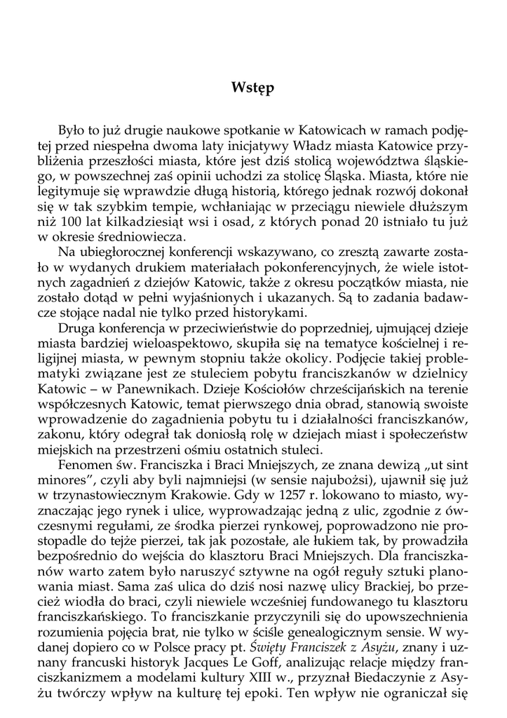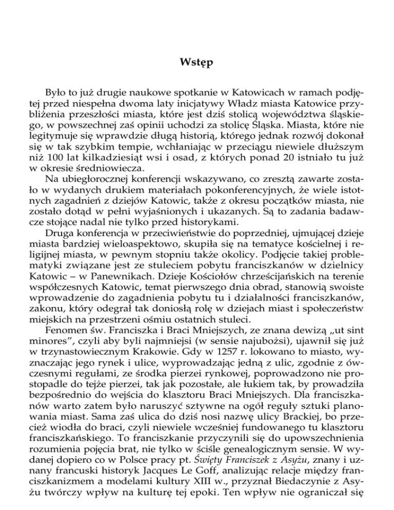 Wstęp Było to już drugie naukowe spotkanie w Katowicach w ramach podjętej przed niespełna dwoma laty inicjatywy Władz miasta Katowice przybliżenia przeszłości miasta, które jest dziś stolicą województwa śląskiego, w powszechnej zaś opinii uchodzi za stolicę Śląska. Miasta, które nie legitymuje się wprawdzie długą historią, którego jednak rozwój dokonał się w tak szybkim tempie, wchłaniając w przeciągu niewiele dłuższym niż 100 lat kilkadziesiąt wsi i osad, z których ponad 20 istniało tu już w okresie średniowiecza. Na ubiegłorocznej konferencji wskazywano, co zresztą zawarte zostało w wydanych drukiem materiałach pokonferencyjnych, że wiele istotnych zagadnień z dziejów Katowic, także z okresu początków miasta, nie zostało dotąd w pełni wyjaśnionych i ukazanych. Są to zadania badawcze stojące nadal nie tylko przed historykami. Druga konferencja w przeciwieństwie do poprzedniej, ujmującej dzieje miasta bardziej wieloaspektowo, skupiła się na tematyce kościelnej i religijnej miasta, w pewnym stopniu także okolicy. Podjęcie takiej problematyki związane jest ze stuleciem pobytu franciszkanów w dzielnicy Katowic – w Panewnikach. Dzieje Kościołów chrześcijańskich na terenie współczesnych Katowic, temat pierwszego dnia obrad, stanowią swoiste wprowadzenie do zagadnienia pobytu tu i działalności franciszkanów, zakonu, który odegrał tak doniosłą rolę w dziejach miast i społeczeństw miejskich na przestrzeni ośmiu ostatnich stuleci. Fenomen św. Franciszka i Braci Mniejszych, ze znana dewizą „ut sint minores”, czyli aby byli najmniejsi (w sensie najubożsi), ujawnił się już w trzynastowiecznym Krakowie. Gdy w 1257 r. lokowano to miasto, wyznaczając jego rynek i ulice, wyprowadzając jedną z ulic, zgodnie z ówczesnymi regułami, ze środka pierzei rynkowej, poprowadzono nie prostopadle do tejże pierzei, tak jak pozostałe, ale łukiem tak, by prowadziła bezpośrednio do wejścia do klasztoru Braci Mniejszych. Dla franciszkanów warto zatem było naruszyć sztywne na ogół reguły sztuki planowania miast. Sama zaś ulica do dziś nosi nazwę ulicy Brackiej, bo przecież wiodła do braci, czyli niewiele wcześniej fundowanego tu klasztoru franciszkańskiego. To franciszkanie przyczynili się do upowszechnienia rozumienia pojęcia brat, nie tylko w ściśle genealogicznym sensie. W wydanej dopiero co w Polsce pracy pt. Święty Franciszek z Asyżu, znany i uznany francuski historyk Jacques Le Goff, analizując relacje między franciszkanizmem a modelami kultury XIII w., przyznał Biedaczynie z Asyżu twórczy wpływ na kulturę tej epoki. Ten wpływ nie ograniczał się 2 Program konferencji jednak do XIII w., bo św. Franciszek, jak pisze francuski historyk, to „po dziś dzień jedna z najbardziej znaczących postaci swego czasu i średniowiecznej historii” (s. 5). Niewielu przecież osobom udaje się zająć miejsce w historii, a jedynie nielicznym tak poczesne. Franciszkańska koncepcja człowieka, jego nierozłączny związek z przyrodą, doprowadziły do tego, że ów święty stał się dziś patronem ekologów. Słowo i przykład Franciszkowy, czyniony przy tym z żarem serca i bezwzględnym oddaniem, dają rezultat również dziś po wielu wiekach. Owa „sancta novitas”, cytując tu określenie Tomasza z Celano, nie straciła na aktualności. Ten fenomen franciszkański wycisnął silne, ciągle mało rozpoznane piętno również na Śląsku, w tym także w Katowicach. Panewnicka bazylika od stu już lat jest znaczącym centrum życia religijnego dla całej okolicy. Któż nie słyszał np. o słynnej szopce z Panewnik, o różnych formach kultu religijnego. Czym była panewnicka bazylika wraz z kalwarią i całym otoczeniem dla mieszkańców Katowic, ale także o jej początkach i dziejach – o tym wszystkim usłyszeliśmy, a także dyskutowaliśmy w drugim dniu naszej konferencji. Cieszyliśmy się z obecności wśród nas przedstawicieli kilku dyscyplin, głównie historycznych. Jedynie interdyscyplinarne spojrzenie ma dziś sens bytu. Nasze konferencje od początku mają naukowy charakter. Takie są ich założenia. Ma to być spojrzenie okiem i doświadczeniem badacza na problemy przeszłości miasta i okolicy. Referaty i komunikaty winny nie tylko ugruntować, ale także poszerzyć naszą wiedzę i wzbogacić ją o nowe nieznane nam informacje. Winny przybliżyć dalsze szczegóły i fakty z przeszłości. Ma to służyć umacnianiu świadomości historycznej naszej małej ojczyzny. Zadaniem historyka jest dostarczanie pewnych, sprawdzonych informacji, poddanych przy tym interpretacji na użytek ogółu. Naukowe dociekania mają przynosić rzetelną i sprawdzoną wiedzę o przeszłości. Zadanie przybliżania i wyjaśniania tego, co było i jak było, przyświeca koncepcji naszych spotkań. Oddawana czytelnikom książka zawiera wszystkie zapowiedziane i wygłoszone na konferencji referaty i komunikaty. Zawiera dodatkowo wygłoszony referat ks. prof. Antoniego Kiełbasy oraz artykuł mgr Barbary Ćwiklińskiej o cennym a nierozpoznanym dotąd relikwiarzu z bazyliki panewnickiej. Upowszechnianie dorobku badawczego to zadanie działaczy kultury. To w ogóle pole działalności kulturalnej. Należy żywić nadzieję, że to, co zostało powiedziane na katowickich konferencjach naukowych, przełożone i przeniesione zostanie na potrzeby przede wszystkim młodzieży. Służyć winno także wszystkim mieszkańcom. 3 Program konferencji Ostatnio, tu na Górnym Śląsku, obserwujemy żywy związek i sojusz samorządów z nauką. Wyrazem tego są konferencje naukowe np. w Zabrzu, odbywane pod ogólnym, jakże wymownym tytułem „Kultura Europy Środkowej”, ale są także katowickie konferencje. Możemy być wdzięczni, może być wdzięczne środowisko naukowe, za zrozumienie potrzeby badań naukowych. Za poparcie dla takich badań. Wdzięczni jesteśmy wszyscy Panu Prezydentowi Piotrowi U