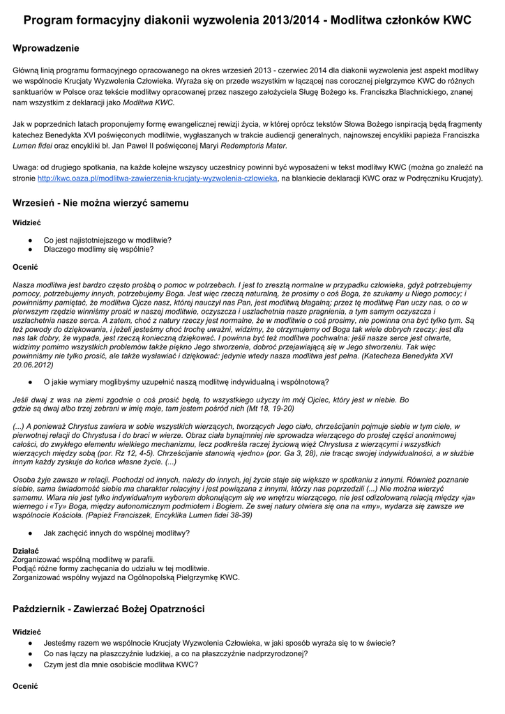 Program formacyjny diakonii wyzwolenia 2013/2014 Modlitwa członków KWC Wprowadzenie Główną linią programu formacyjnego opracowanego na okres wrzesień 2013 czerwiec 2014 dla diakonii wyzwolenia jest aspekt modlitwy we wspólnocie Krucjaty Wyzwolenia Człowieka. Wyraża się on przede wszystkim w łączącej nas corocznej pielgrzymce KWC do różnych sanktuariów w Polsce oraz tekście modlitwy opracowanej przez naszego założyciela Sługę Bożego ks. Franciszka Blachnickiego, znanej nam wszystkim z deklaracji jako Modlitwa KWC. Jak w poprzednich latach proponujemy formę ewangelicznej rewizji życia, w której oprócz tekstów Słowa Bożego isnpiracją będą fragmenty katechez Benedykta XVI poświęconych modlitwie, wygłaszanych w trakcie audiencji generalnych, najnowszej encykliki papieża Franciszka Lumen fidei oraz encykliki bł. Jan Paweł II poświęconej Maryi Redemptoris Mater. Uwaga: od drugiego spotkania, na każde kolejne wszyscy uczestnicy powinni być wyposażeni w tekst modlitwy KWC (można go znaleźć na stronie http://kwc.oaza.pl/modlitwazawierzeniakrucjatywyzwoleniaczlowieka, na blankiecie deklaracji KWC oraz w Podręczniku Krucjaty). Wrzesień Nie można wierzyć samemu Widzieć ● ● Co jest najistotniejszego w modlitwie? Dlaczego modlimy się wspólnie? Ocenić Nasza modlitwa jest bardzo często prośbą o pomoc w potrzebach. I jest to zresztą normalne w przypadku człowieka, gdyż potrzebujemy pomocy, potrzebujemy innych, potrzebujemy Boga. Jest więc rzeczą naturalną, że prosimy o coś Boga, że szukamy u Niego pomocy; i powinniśmy pamiętać, że modlitwa Ojcze nasz, której nauczył nas Pan, jest modlitwą błagalną; przez tę modlitwę Pan uczy nas, o co w pierwszym rzędzie winniśmy prosić w naszej modlitwie, oczyszcza i uszlachetnia nasze pragnienia, a tym samym oczyszcza i uszlachetnia nasze serca. A zatem, choć z natury rzeczy jest normalne, że w modlitwie o coś prosimy, nie powinna ona być tylko tym. Są też powody do dziękowania, i jeżeli jesteśmy choć trochę uważni, widzimy, że otrzymujemy od Boga tak wiele dobrych rzeczy: jest dla nas tak dobry, że wypada, jest rzeczą konieczną dziękować. I powinna być też modlitwa pochwalna: jeśli nasze serce jest otwarte, widzimy pomimo wszystkich problemów także piękno Jego stworzenia, dobroć przejawiającą się w Jego stworzeniu. Tak więc powinniśmy nie tylko prosić, ale także wysławiać i dziękować: jedynie wtedy nasza modlitwa jest pełna. (Katecheza Benedykta XVI 20.06.2012) ● O jakie wymiary moglibyśmy uzupełnić naszą modlitwę indywidualną i wspólnotową? Jeśli dwaj z was na ziemi zgodnie o coś prosić będą, to wszystkiego użyczy im mój Ojciec, który jest w niebie. Bo gdzie są dwaj albo trzej zebrani w imię moje, tam jestem pośród nich (Mt 18, 1920) (...) A ponieważ Chrystus zawiera w sobie wszystkich wierzących, tworzących Jego ciało, chrześcijanin pojmuje siebie w tym ciele, w pierwotnej relacji do Chrystusa i do braci w wierze. Obraz ciała bynajmniej nie sprowadza wierzącego do prostej części anonimowej całości, do zwykłego elementu wielkiego mechanizmu, lecz podkreśla raczej życiową więź Chrystusa z wierzącymi i wszystkich wierzących między sobą (por. Rz 12, 45). Chrześcijanie stanowią «jedno» (por. Ga 3, 28), nie tracąc swojej indywidualności, a w służbie innym każdy zyskuje do końca własne życie. (...) Osoba żyje zawsze w relacji. Pochodzi od innych, należy do innych, jej życie staje się większe w spotkaniu z innymi. Również poznanie siebie, sama świadomość siebie ma charakter relacyjny i jest powiązana z innymi, którzy nas poprzedzili (...) Nie można wierzyć samemu. Wiara nie jest tylko indywidualnym wyborem dokonującym się we wnętrzu wierzącego, nie jest odizolowaną relacją między «ja» wiernego i «Ty» Boga, między autonomicznym podmiotem i Bogiem. Ze swej natury otwiera się ona na «my», wydarza się zawsze we wspólnocie Kościoła. (Papież Franciszek, Encyklika Lumen fidei 3839) ● Jak zachęcić innych do wspólnej modlitwy? Działać Zorganizować wspólną modlitwę w parafii. Podjąć różne formy zachęcania do udziału w tej modlitwie. Zorganizować wspólny wyjazd na Ogólnopolską Pielgrzymkę KWC. Październik Zawierzać Bożej Opatrzności Widzieć ● Jesteśmy razem we wspólnocie Krucjaty Wyzwolenia Człowieka, w jaki sposób wyraża się to w świecie? ● Co nas łączy na płaszczyźnie ludzkiej, a co na płaszczyźnie nadprzyrodzonej? ● Czym jest dla mnie osobiście modlitwa KWC? Ocenić Wszyscy oni trwali jednomyślnie na modlitwie razem z niewiastami, Maryją, Matką Jezusa, i braćmi Jego. (Dz 1,4). II Sobór Watykański chciał w sposób szczególny podkreślić tę więź, ukazującą się widzialnie we wspólnej modlitwie Maryi wraz z Apostołami, w tym samym miejscu, w oczekiwaniu na Ducha Świętego. W konstytucji dogmatycznej „Lumen gentium” o Kościele czytamy: „Kiedy zaś spodobało się Bogu uroczyście objawić tajemnice ludzkiego zbawienia nie wcześniej, niż ześle obiecanego przez Chrystusa Ducha, widzimy Apostołów przed dniem Pięćdziesiątnicy «trwających jednomyślnie na modlitwie wraz z niewiastami i z Maryją Matką Jezusa i z braćmi Jego» (Dz 1,14), a także Maryję błagającą modlitwami o dar Ducha, który okrył ją już cieniem podczas zwiastowania” (n. 59). Uprzywilejowanym miejscem Maryi jest Kościół, gdzie jest „najznakomitszym i całkiem szczególnym członkiem Kościoła oraz jego typicznym wyobrażeniem i najdoskonalszym wzorem w wierze i miłości” (Lumen gentium n. 53). Czcić Matkę Jezusa w Kościele oznacza więc uczyć się od Niej być wspólnotą, która się modli: to jedna z podstawowych cech pierwszego opisu wspólnoty chrześcijańskiej nakreślonego w Dziejach Apostolskich (por. 2,42). Modlitwa często podyktowana jest sytuacjami trudnymi, problemami osobistymi, które prowadzą do z