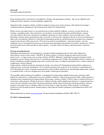 newss.pl Gwarancja udanych połowów Kraje skandynawskie to prawdziwy raj wędkarski, oferujący niezapomniane wrażenia - aby nic nie zakłóciło tych urokliwych chwil, musimy wszystko dokładnie zaplanować. Zakwaterowanie, transport i drobne wydatki na miejscu to proza życia, którą możemy sobie ułatwić korzystając z szybkich przekazów pieniężnych, oferowanych przez firmę LCC International. Późna wiosna i początek jesieni to czas prawdziwego exodusu polskich wędkarzy za morze, na łono niczym nie skalanej, szwedzkiej natury. Otoczenie jezior, przywodzące na myśl pierwotną naturę polskich Mazur, a ponad wszystko obfitość zdrowych i dorodnych szczupaków sprawiają, że wielu wędkarzy wraca tam kilka razy w roku. Prawdziwi weterani sportu preferują prywatne wycieczki w towarzystwie znajomych. Koszty są wówczas rozłożone na kilka osób, zaś atmosfery połowów w prawdziwie kameralnym gronie nie sposób porównać do grupowych wyjazdów, organizowanych przez biura turystyczne. W Szwecji na ogół nie ma problemów z zakwaterowaniem - ten kraj wędkarski szczyci się bogatą bazą turystyczną, przygotowaną specjalnie pod potrzeby fascynatów rybołówstwa. Wbrew pozorom każdy może sobie pozwolić na taką wyprawę - wszystko zależy od miejsca zakwaterowania i właściwej organizacji. Szwecja na każdą kieszeń Najbardziej ekonomicznym rozwiązaniem jest wynajęcie domku kempingowego tuż nad wodą. Najprostsza, dwuosobowa wersja to koszt około 1.300 PLN. W trakcie pobytu w Szwecji czekają nas także koszty licencji połowowych - w ciągu sezonu ceny oscylują od 80 do 100 PLN. Miłośnicy wędkarskich przygód narzekają na brak dostępnych cenowo metod rozliczania się ze szwedzkimi usługodawcami z Polski. Dla przykładu, przelew walutowy na konto szwedzkiego ośrodka kempingowego może wynieść tyle samo, co zakup licencji połowowej i zwykle cechuje się wydłużonym czasem realizacji. Usługi tanich i szybkich przelewów pieniężnych oferuje, m.in. firma LCC International, która pobiera najniższe na rynku prowizje, wynoszące standardowo 3% od wartości przekazu (nie mniej niż 35 zł). Przelewy za pośrednictwem LCC International to tania i wygodna metoda przekazywania środków finansowych, umożliwiająca planowanie wypadu w ostatniej chwili, co nie jest osiągalne przy korzystaniu z tradycyjnych sposobów. W przypadku nieprzewidzianych wydatków, wymagających zwiększonego nakładu finansowego, jesteśmy zdani jedynie na serdeczność i wypłacalność towarzyszy podróży. Ratunek z opresji mogą przynieść tylko szybkie przelewy z automatycznym, bezpłatnym przewalutowaniem. Korzystając z pomocy rodziny w Polsce, która w każdej chwili jest w stanie łatwo nadać przelew z Polski do Szwecji, wędkarze dostają szybkie doładowanie finansowe i mogą bezstresowo wracać do bicia rekordów łowieckich. Dyspozycję przelewu można zlecić telefonicznie lub drogą mailową. Adresat przelewu otrzymuje kwotę w lokalnej walucie na swoje konto w ciągu 48 godzin. Wielu amatorów szwedzkiego rybołówstwa już doceniło pewność i bezpieczeństwo, jakie dają im transfery pieniężne za pośrednictwem firmy LCC International. Więcej informacji na stronie www.lccmt.com lub pod numerem bezpłatnej infolinii: 0801 308 217 E.C.H.O. Communications strona 1 / 1