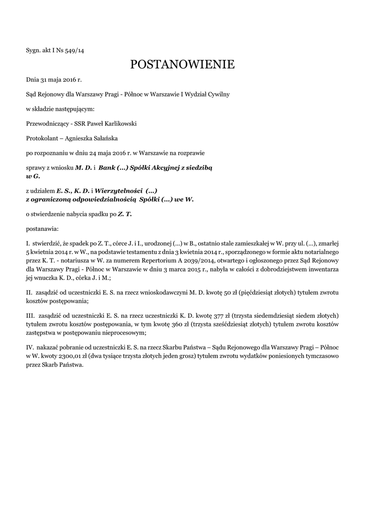 Sygn. akt I Ns 549/14 POSTANOWIENIE Dnia 31 maja 2016 r. Sąd Rejonowy dla Warszawy Pragi - Północ w Warszawie I Wydział Cywilny w składzie następującym: Przewodniczący - SSR Paweł Karlikowski Protokolant – Agnieszka Sałańska po rozpoznaniu w dniu 24 maja 2016 r. w Warszawie na rozprawie sprawy z wniosku M. D. i Bank (...) Spółki Akcyjnej z siedzibą w G. z udziałem E. S., K. D. i Wierzytelności (...) z ograniczoną odpowiedzialnością Spółki (...) we W. o stwierdzenie nabycia spadku po Z. T. postanawia: I. stwierdzić, że spadek po Z. T., córce J. i I., urodzonej (...) w B., ostatnio stale zamieszkałej w W. przy ul. (...), zmarłej 5 kwietnia 2014 r. w W., na podstawie testamentu z dnia 3 kwietnia 2014 r., sporządzonego w formie aktu notarialnego przez K. T. - notariusza w W. za numerem Repertorium A 2039/2014, otwartego i ogłoszonego przez Sąd Rejonowy dla Warszawy Pragi - Północ w Warszawie w dniu 3 marca 2015 r., nabyła w całości z dobrodziejstwem inwentarza jej wnuczka K. D., córka J. i M.; II. zasądzić od uczestniczki E. S. na rzecz wnioskodawczyni M. D. kwotę 50 zł (pięćdziesiąt złotych) tytułem zwrotu kosztów postępowania; III. zasądzić od uczestniczki E. S. na rzecz uczestniczki K. D. kwotę 377 zł (trzysta siedemdziesiąt siedem złotych) tytułem zwrotu kosztów postępowania, w tym kwotę 360 zł (trzysta sześćdziesiąt złotych) tytułem zwrotu kosztów zastępstwa w postępowaniu nieprocesowym; IV. nakazać pobranie od uczestniczki E. S. na rzecz Skarbu Państwa – Sądu Rejonowego dla Warszawy Pragi – Północ w W. kwoty 2300,01 zł (dwa tysiące trzysta złotych jeden grosz) tytułem zwrotu wydatków poniesionych tymczasowo przez Skarb Państwa.