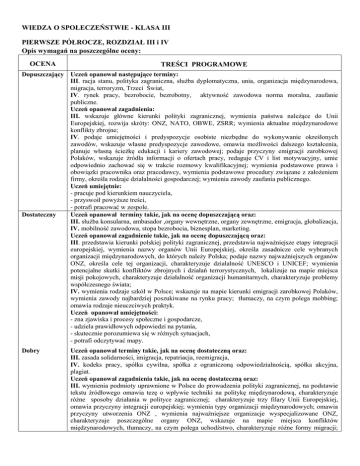WIEDZA O SPOŁECZEŃSTWIE - KLASA III PIERWSZE PÓŁROCZE, ROZDZIAŁ III i IV Opis wymagań na poszczególne oceny: OCENA TREŚCI PROGRAMOWE Dopuszczający Uczeń opanował następujące terminy: III. racja stanu, polityka zagraniczna, służba dyplomatyczna, unia, organizacja międzynarodowa, migracja, terroryzm, Trzeci Świat, IV. rynek pracy, bezrobocie, bezrobotny, aktywność zawodowa norma moralna, zaufanie publiczne. Uczeń opanował zagadnienia: III. wskazuje główne kierunki polityki zagranicznej, wymienia państwa należące do Unii Europejskiej, rozwija skróty: ONZ, NATO, OBWE, ZSRR; wymienia aktualne międzynarodowe konflikty zbrojne; IV. podaje umiejętności i predyspozycje osobiste niezbędne do wykonywanie określonych zawodów, wskazuje własne predyspozycje zawodowe, omawia możliwości dalszego kształcenia, planuje własną ścieżkę edukacji i kariery zawodowej; podaje przyczyny emigracji zarobkowej Polaków, wskazuje źródła informacji o ofertach pracy, redaguje CV i list motywacyjny, umie odpowiednio zachować się w trakcie rozmowy kwalifikacyjnej; wymienia podstawowe prawa i obowiązki pracownika oraz pracodawcy, wymienia podstawowe procedury związane z założeniem firmy, określa rodzaje działalności gospodarczej; wymienia zawody zaufania publicznego. Uczeń umiejętnie: - pracuje pod kierunkiem nauczyciela, - przyswoił powyższe treści, - potrafi pracować w zespole. Dostateczny Uczeń opanował terminy takie, jak na ocenę dopuszczającą oraz: III. służba konsularna, ambasador ,organy wewnętrzne, organy zewnętrzne, emigracja, globalizacja, IV. mobilność zawodowa, stopa bezrobocia, biznesplan, marketing. Uczeń opanował zagadnienie takie, jak na ocenę dopuszczającą oraz: III. przedstawia kierunki polskiej polityki zagranicznej, przedstawia najważniejsze etapy integracji europejskiej, wymienia nazwy organów Unii Europejskiej, określa zasadnicze cele wybranych organizacji międzynarodowych, do których należy Polska; podaje nazwy najważniejszych organów ONZ, określa cele tej organizacji, charakteryzuje działalność UNESCO i UNICEF; wymienia potencjalne skutki konfliktów zbrojnych i działań terrorystycznych, lokalizuje na mapie miejsca misji pokojowych, charakteryzuje działalność organizacji humanitarnych, charakteryzuje problemy współczesnego świata; IV. wymienia rodzaje szkół w Polsce; wskazuje na mapie kierunki emigracji zarobkowej Polaków, wymienia zawody najbardziej poszukiwane na rynku pracy; tłumaczy, na czym polega mobbing; omawia rodzaje nieuczciwych praktyk. Uczeń opanował umiejętności: - zna zjawiska i procesy społeczne i gospodarcze, - udziela prawidłowych odpowiedzi na pytania, - skutecznie porozumiewa się w różnych sytuacjach, - potrafi odczytywać mapy. Dobry Uczeń opanował terminy takie, jak na ocenę dostateczną oraz: III. zasada solidarności, imigracja, repatriacja, reemigracja, IV. kodeks pracy, spółka cywilna, spółka z ograniczoną odpowiedzialnością, spółka akcyjna, plagiat. Uczeń opanował zagadnienia takie, jak na ocenę dostateczną oraz: III. wymienia podmioty uprawnione w Polsce do prowadzenia polityki zagranicznej, na podstawie tekstu źródłowego omawia tezę o wpływie techniki na politykę międzynarodową, charakteryzuje różne sposoby działania w polityce zagranicznej; charakteryzuje trzy filary Unii Europejskiej, omawia przyczyny integracji europejskiej; wymienia typy organizacji międzynarodowych; omawia przyczyny utworzenia ONZ , wymienia najważniejsze organizacje wyspecjalizowane ONZ, charakteryzuje poszczególne organy ONZ, wskazuje na mapie miejsca konfliktów międzynarodowych, tłumaczy, na czym polega uchodźstwo, charakteryzuje różne formy migracji; Bardzo dobry Celujący wskazuje na mapie kraje bogatej Północy i biednego Południa, uzasadnia konieczność niesienia pomocy humanitarnej w wybranych rejonach świata; IV. na podstawie tekstu źródłowego wyjaśnia ideę zmian w polskim systemie kształcenia, wskazuje zalety i wady wykonywania określonych zawodów, wymienia sposoby pozyskiwania informacji dotyczących dalszego kształcenia; omawia działania instytucji wpływających na rynek pracy, wskazuje przyczyny i skutki bezrobocia; odszukuje w internecie wzory CV i listu motywacyjnego; na podstawie tekstu źródłowego określa obowiązki pracodawcy zatrudniającego osobę niepełnoletnią, opisuje rolę NSZZ „Solidarność” w walce o prawa pracownicze; wymienia korzyści i zagrożenia związane z założeniem własnej firmy, charakteryzuje różne rodzaje działalności gospodarczej; odszukuje informacje o kodeksach etyki zawodowej. Uczeń umiejętnie: - rozwiązuje problemy i wyciąga wnioski, - zna zjawiska i procesy społeczne i gospodarcze, - interpretuje źródła, - udziela prawidłowych odpowiedzi na pytania, - skutecznie porozumiewa się w różnych sytuacjach. Uczeń opanował terminy, takie, jak na ocenę dobrą. Uczeń opanował zagadnienia takie, jak na ocenę dobrą oraz: wymienia zadania polskiej dyplomacji, na podstawie mapy przedstawia kierunki polskiej polityki zagranicznej w Europie i na świecie, uzasadnia konieczność współpracy międzynarodowej; charakteryzuje organy Unii Europejskiej, wskazuje korzyści i zagrożenia wynikające z integracji Polski z Unią Europejską; przedstawia genezę ONZ, ocenia skuteczność działań podejmowanych przez ONZ; odszukuje informacje na temat najważniejszych konfliktów zbrojnych na świecie, opisuje wybrane zamachy terrorystyczne w XXI wieku; przedstawia sposoby rozwiązywania problemów współczesnego świata; uzasadnia dokonany przez siebie wybór dalszej ścieżki edukacyjnej i kariery zawodowej; określa stopę bezrobocia w powiecie, województwie i kraju; ocenia skuteczność różnych form poszukiwania pracy; podaje nazwy instytucji, do których można zwrócić się o pomoc w przypadku łamania praw pracowniczych i mobbingu; omawia zasady marketingu i zarządzania; wymie