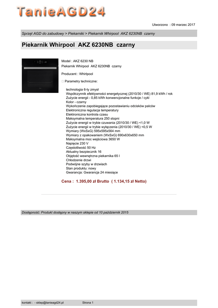 Utworzono : 09 marzec 2017 Sprzęt AGD do zabudowy > Piekarniki > Piekarnik Whirpool AKZ 6230NB czarny Piekarnik Whirpool AKZ 6230NB czarny Model : AKZ 6230 NB Piekarnik Whirpool AKZ 6230NB czarny Producent : Whirlpool �Parametry techniczne: technologia 6-ty zmysł Współczynnik efektywności energetycznej (2010/30 / WE) 81,9 kWh / rok Zużycie energii - 0,85 kWh konwencjonalne funkcje / cykl Kolor - czarny Wykończenie zapobiegające pozostawianiu odcisków palców Elektroniczna regulacja temperatury Elektroniczna kontrola czasu Maksymalna temperatura 250 stopni Zużycie energii w trybie czuwania (2010/30 / WE) <1,0 W Zużycie energii w trybie wyłączenia (2010/30 / WE) <0,5 W Wymiary (WxSxG) 595x595x564 mm Wymiary z opakowaniem (WxSxG) 690x630x650 mm Maksymalna moc wejściowa 3650 W Napięcie 230 V Częstotliwość 50 Hz Aktualny bezpiecznik 16 Objętość wewnętrzna piekarnika 65 l Chłodzenie drzwi Podwójne szyby w drzwiach Stan produktu: nowy Gwarancja: Gwarancja 24 miesiące Cena : 1.395,00 zł Brutto ( 1.134,15 zł Netto) Dostępność: Produkt dostępny w naszym sklepie od 10 październik 2015 kontakt : - [email protected] Strona 1