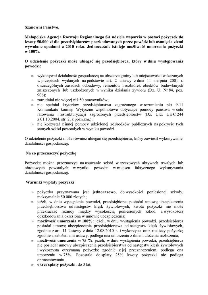 Szanowni Państwo, Małopolska Agencja Rozwoju Regionalnego SA udziela wsparcia w postaci pożyczek do kwoty 50.000 zł dla przedsiębiorców poszkodowanych przez powódź lub osunięcia ziemi wywołane opadami w 2010 roku. Jednocześnie istnieje możliwość umorzenia pożyczki w 100%. O udzielenie pożyczki może ubiegać się przedsiębiorca, który w dniu występowania powodzi: • • • • wykonywał działalność gospodarczą na obszarze gminy lub miejscowości wskazanych w przepisach wydanych na podstawie art. 2 ustawy z dnia 11 sierpnia 2001 r. o szczególnych zasadach odbudowy, remontów i rozbiórek obiektów budowlanych zniszczonych lub uszkodzonych w wyniku działania żywiołu (Dz. U. Nr 84, poz. 906); zatrudniał nie więcej niż 50 pracowników; nie spełniał kryteriów przedsiębiorstwa zagrożonego w rozumieniu pkt 9-11 Komunikatu komisji Wytyczne wspólnotowe dotyczące pomocy państwa w celu ratowania i restrukturyzacji zagrożonych przedsiębiorstw (Dz. Urz. UE C 244 z 01.10.2004, str. 2, z późn.zm.); nie korzystał z innej pomocy udzielonej ze środków publicznych na pokrycie tych samych szkód powstałych w wyniku powodzi. O udzielenie pożyczki może również ubiegać się przedsiębiorca, który zawiesił wykonywanie działalności gospodarczej. Na co przeznaczyć pożyczkę Pożyczkę można przeznaczyć na usuwanie szkód w rzeczowych aktywach trwałych lub obrotowych powstałych w wyniku powodzi w miejscu faktycznego wykonywania działalności gospodarczej. Warunki wypłaty pożyczki • • • • • pożyczka przyznawana jest jednorazowo, do wysokości poniesionej szkody, maksymalnie 50.000 złotych; jeżeli, w dniu wystąpienia powodzi, przedsiębiorca posiadał umowę ubezpieczenia przedsiębiorstwa od następstw klęsk żywiołowych, kwota pożyczki nie może przekraczać różnicy między wysokością poniesionych szkód, a wysokością odszkodowania określoną w umowie ubezpieczenia; możliwość umorzenia w 100%: jeżeli, w dniu wystąpienia powodzi, przedsiębiorca posiadał umowę ubezpieczenia przedsiębiorstwa od następstw klęsk żywiołowych, zgodnie z art. 11 Ustawy z dnia 12.08.2010 r. i wykorzysta oraz rozliczy pożyczkę zgodnie z założeniami ustawy, podlega ona umorzeniu z dniem złożenia rozliczenia; możliwość umorzenia w 75 %: jeżeli, w dniu wystąpienia powodzi, przedsiębiorca nie posiadał umowy ubezpieczenia przedsiębiorstwa od następstw klęsk żywiołowych i wykorzysta otrzymaną pożyczkę zgodnie z jej przeznaczeniem, podlega ona umorzeniu w 75%. Pozostałe do spłaty 25% kwoty pożyczki nie podlega oprocentowaniu. okres spłaty pożyczki: do 3 lat; • okres karencji w spłacie pożyczki: do 9 miesięcy. Uwaga: Przedsiębiorcy mogą składać wnioski o przyznanie pożyczki do 13 lutego 2011 r. Jeżeli w Państwa Gminie są przedsiębiorcy zainteresowani takim wsparciem, proponujemy zorganizowanie spotkania we wskazanym przez Państwa miejscu. Nasi konsultanci udzielą wszelkich informacji oraz pomogą wypełnić wniosek o przyznanie pożyczki. W celu umówienia spotkania prosimy o kontakt z panią Alicją Smaruj pod nr tel. 12 617 66 69 lub panią Beatą Marciniec pod nr tel 12 417 74 14 lub o kontakt e-mailowy: • • [email protected] [email protected] Do Państwa dyspozycji są również nasi konsultanci w wymienionych poniżej punktach obsługi klienta. Punkty obsługi klienta: Kraków Siedziba MARR ul. Kordylewskiego 11; 31-542 Kraków tel., 12 617 66 69, 12 417 74 14 poniedziałek – piątek: 8.00 - 16.00 Nowy Sącz Punkt Konsultacyjny MARR ul. Jagiellońska 18; 33-300 Nowy Sącz tel. 18 444 21 31 e-mail: [email protected] poniedziałek 8.00 - 18.00, wtorek - piątek 8.00 - 16.00 Bochnia Powiatowy Urząd Pracy ul. Wojska Polskiego 3;32-700 Bochnia tel. 18 444 21 31 e-mail: [email protected] każdy poniedziałek miesiąca w godzinach: 10.00 - 14.00 Gorlice Gorlicki Ośrodek Wspierania Przedsiębiorczości ul. Michalusa 4; 38-300 Gorlice tel. 18 444 21 31 e-mail: [email protected] każdy piątek miesiąca w godzinach: 10.00 - 14.00 Limanowa Urząd Miasta Limanowa ul. Jana Pawła II 9; 34-600 Limanowa tel. 018 444 21 31 e-mail: [email protected]żdy czwartek miesiąca w godzinach: 10.00 - 14.00 Miechów Starostwo Powiatowe w Miechowie ul. Racławicka 12; 32-200 Miechów tel. 41 382 11 22 każda czwarta środa miesiąca w godzinach: 10.00 - 15.00 Olkusz Urząd Miasta i Gminy Olkusz Rynek 1; 32-300 Olkusz tel. 32 626 01 84 każdy drugi i trzeci piątek miesiąca w godzinach: 9.00 - 15.00 Proszowice Lokalne Centrum Biznesu ul. Krakowska 11; 32-100 Proszowice tel. 12 386 42 11 każdy czwarty wtorek miesiąca w godzinach: 10.00 - 16.00 Skawina Podkrakowska Izba Gospodarcza Rynek 12; 32-050 Skawina 12 391 26 10 każdy drugi czwartek miesiąca w godzinach: 10.00 - 16.00 Wieliczka Powiatowy Cech Rzemieślników i Przedsiębiorców ul. Limanowskiego 11; 32-020 Wieliczka tel. 12 278 42 41 każdy trzeci poniedziałek miesiąca w godzinach: 10.00 - 16.00 Zakopane Tatrzańska Izba Gospodarcza ul. Krupówki 22; 34-500 Zakopane tel. 18 444 21 31 e-mail: [email protected] każdy trzeci wtorek miesiąca w godzinach: 10.00 - 15.00 Szczegółowe zasady udzielania pożyczek są umieszczone na stronie Małopolskiej Agencji Rozwoju Regionalnego - www.marr.pl W razie jakichkolwiek pytań, jesteśmy do Państwa dyspozycji. Z poważaniem, Marzanna Prokocka Zastępca Dyrektora Departament Instrumentów Finansowych