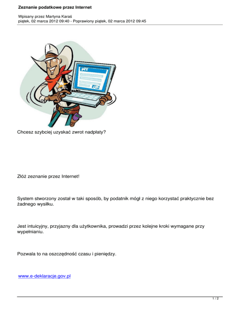 Zeznanie podatkowe przez Internet Wpisany przez Martyna Karaś piątek, 02 marca 2012 09:40 - Poprawiony piątek, 02 marca 2012 09:45 Chcesz szybciej uzyskać zwrot nadpłaty? Złóż zeznanie przez Internet! System stworzony został w taki sposób, by podatnik mógł z niego korzystać praktycznie bez żadnego wysiłku. Jest intuicyjny, przyjazny dla użytkownika, prowadzi przez kolejne kroki wymagane przy wypełnianiu. Pozwala to na oszczędność czasu i pieniędzy. www.e-deklaracje.gov.pl 1/2 Zeznanie podatkowe przez Internet Wpisany przez Martyna Karaś piątek, 02 marca 2012 09:40 - Poprawiony piątek, 02 marca 2012 09:45 2/2