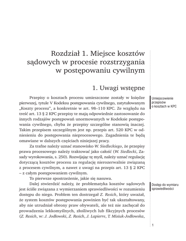 Rozdział 1. Miejsce kosztów sądowych w procesie rozstrzygania w postępowaniu cywilnym 1. Uwagi wstępne Przepisy o kosztach procesu umieszczone zostały w księdze pierwszej, tytule V Kodeksu postępowania cywilnego, zatytułowanym „Koszty procesu”, a konkretnie w art. 98–110 KPC. Ze względu na treść art. 13 § 2 KPC przepisy te mają odpowiednie zastosowanie do innych rodzajów postępowań unormowanych w Kodeksie postępowania cywilnego, chyba że przepisy szczególne stanowią inaczej. Takim przepisem szczególnym jest np. przepis art. 520 KPC w odniesieniu do postępowania nieprocesowego. Zagadnienia te będą omawiane w dalszych częściach niniejszej pracy. Za trafne należy uznać stanowisko W. Siedleckiego, że przepisy prawa procesowego należy traktować jako całość (W. Siedlecki, Zasady wyrokowania, s. 250). Rozwijając tę myśl, należy uznać regulację dotyczącą kosztów procesu za regulację nierozerwalnie związaną z procesem cywilnym, a nawet z uwagi na przepis art. 13 § 2 KPC – z całym postępowaniem cywilnym. To pierwsze spostrzeżenie, jakie się nasuwa. Dalej stwierdzić należy, że problematyka kosztów sądowych jest ściśle związana z wymierzaniem sprawiedliwości w rozumieniu dostępu do niego. Problem ten dostrzegał Z. Resich, który uważał, że system kosztów postępowania powinien być tak ukształtowany, aby nie utrudniał obrony praw obywateli, ale też nie zachęcał do prowadzenia lekkomyślnych, złośliwych lub fikcyjnych procesów (Z. Resich, w: J. Jodłowski, Z. Resich, J. Lapierre, T. Misiuk-Jodłowska, Umiejscowienie przepisów o kosztach w KPC Dostęp do wymiaru sprawiedliwości 1 Rozdział 1. Miejsce kosztów sądowych w procesie... K. Weitz, Postępowanie cywilne, s. 300 i n.). Niewątpliwie wysokie koszty sądowe mogą stanowić skuteczną barierę w realizowaniu przez obywateli prawa do sądu (A. Zieliński, Postępowanie cywilne, 2014, s. 23). Kwestia ta została również dostrzeżona przez Unię Europejską i znalazła swój wyraz w Zaleceniu Nr(81) 7 (Komitetu Ministrów państw członkowskich) dotyczącym środków ułatwiających dostęp do wymiaru sprawiedliwości (przyjęte przez Komitet Ministrów 14.5.1981 r. na 68 posiedzeniu). W zasadzie 12 tego Zalecenia stwierdza się, że opłaty sądowe wnoszone do kasy państwowej powinny być możliwie najmniejsze. Podaje się tutaj przykład Francji, która ustawą z 30.12.1977 r. zniosła wszelkie opłaty sądowe. W Polsce już przed wojną zwrócono uwagę, że skoro państwo ma obowiązek zorganizować wymiar sprawiedliwości i umożliwić do niego dostęp wszystkim, to w zasadzie wymiar sprawiedliwości powinien być bezpłatny (F. Zadarowski, Na marginesie nowelizacji, s. 93). Warto w tym miejscu przypomnieć, że w okresie zaborów, a i po wywalczeniu niepodległości, na części ziem polskich (zaborów pruskich i austriackich) postępowanie cywilne było bezpłatne, tzn. wolne od opłat sądowych. Jednak, jak zazwyczaj, względy fiskalne spowodowały zmianę w tym zakresie i obowiązek uiszczania opłat sądowych w procesach cywilnych, wzorem ziem zaboru rosyjskiego, „wprowadzono w całej Polsce” (F. Zadarowski, Na marginesie nowelizacji, s. 93). Obecnie u nas panuje tendencja odwrotna do zaleceń Unii Europejskiej, czego wyrazem jest ustawa z 28.11.2005 r. o kosztach sądowych w sprawach cywilnych (t.j. Dz.U. z 2016 r. poz. 623 ze zm.). Rozstrzygając o kosztach procesu, w każdej sprawie sąd musi indywidualizować poszczególne sytuacje procesowe (por. Z. Senator, Koszty postępowania, s. 63). Nie oznacza to, że do orzeczenia o kosztach sądowych mają również zastosowanie ogólne zasady orzekania (por. W. Siedlecki, Zasady orzekania, s. 587). Wreszcie stwierdzić trzeba, że rozstrzyganie o kosztach sądowych stanowi zawsze integralną część orzeczenia (materialnego lub formalnego) kończącego daną sprawę w każdej instancji, przepis art. 108 § 1 KPC bowiem stanowi, że sąd rozstrzyga o kosztach w każdym orzeczeniu kończącym sprawę w instancji. 2 2 . Po j ę c i e k o s z t ó w s ą d o w y c h w p o s t ę p o w a n i u c y w i l n y m 2. Pojęcie kosztów sądowych w postępowaniu cywilnym Ustawową definicję kosztów sądowych zawiera przepis art. 98 § 1 KPC, według którego koszty sądowe są to koszty niezbędne do celowego dochodzenia praw i celowej obrony [por. I. Gil, w: E. Marszałkowska-Krześ (red.), Postępowanie cywilne, s. 228]. Z kolei przepis art. 2 ust. 1 KSCU stanowi, że koszty sądowe obejmują opłaty i wydatki. Regulacja w przedmiocie kosztów sądowych i ich zwrotu jest wyłącznie instytucją procesową określoną w Kodeksie postępowania cywilnego w sposób wyczerpujący. Dlatego zgodzić się należy ze stanowiskiem Sądu Najwyższego, według którego uregulowanie rozłożenia kosztów postępowania między stronami oraz określania wysokości należnych kosztów zostało dokonane przez przepisy prawa formalnego (art. 98 i n. KPC) w sposób „automatyczny”, wyłączający zatem dopuszczalność potraktowania zasądzonych z tego tytułu sum jako roszczenia podlegającego przepisom prawa materialnego (wyr. SN z 12.12.1996 r., I CKU 40/96, OSNC 1997, Nr 5, poz. 52). Koszty sądowe stanowią ciężar procesowy, który muszą ponieść strony i uczestnicy postępowania cywilnego. Niewątpliwie regulacja instytucji kosztów sądowych jest określona polityką państwa w zakresie wymiaru sprawiedliwości. Obecnie w Polsce regulacja ta ma charakter wyłącznie restrykcyjny, opłaty sądowe w sprawach cywilnych są bowiem u nas najwyższe w Europie. Regulacja w szczególności opłat sądowych jest w Polsce łagodzona ze względów społecznych instytucją zwolnienia od kosztów sądowych (w całości lub w części), i to z mocy ustawy lub na podstawie orzeczenia sądu. Koszty postępowania cywilnego sensu stricto dzielą się na: 1) koszty sądowe, 2) koszty działania pełnomocnika, 3) koszty działania 