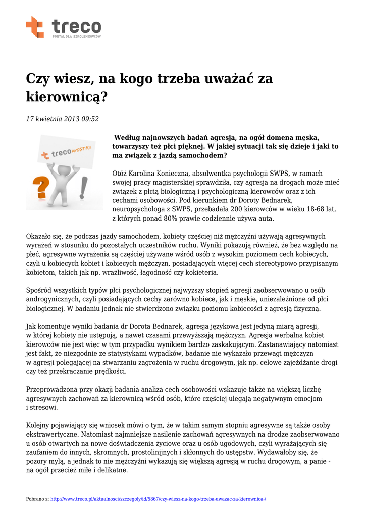 Czy wiesz, na kogo trzeba uważać za kierownicą? 17 kwietnia 2013 09:52 Według najnowszych badań agresja, na ogół domena męska, towarzyszy też płci pięknej. W jakiej sytuacji tak się dzieje i jaki to ma związek z jazdą samochodem? Otóż Karolina Konieczna, absolwentka psychologii SWPS, w ramach swojej pracy magisterskiej sprawdziła, czy agresja na drogach może mieć związek z płcią biologiczną i psychologiczną kierowców oraz z ich cechami osobowości. Pod kierunkiem dr Doroty Bednarek, neuropsychologa z SWPS, przebadała 200 kierowców w wieku 18-68 lat, z których ponad 80% prawie codziennie używa auta. Okazało się, że podczas jazdy samochodem, kobiety częściej niż mężczyźni używają agresywnych wyrażeń w stosunku do pozostałych uczestników ruchu. Wyniki pokazują również, że bez względu na płeć, agresywne wyrażenia są częściej używane wśród osób z wysokim poziomem cech kobiecych, czyli u kobiecych kobiet i kobiecych mężczyzn, posiadających więcej cech stereotypowo przypisanym kobietom, takich jak np. wrażliwość, łagodność czy kokieteria. Spośród wszystkich typów płci psychologicznej najwyższy stopień agresji zaobserwowano u osób androgynicznych, czyli posiadających cechy zarówno kobiece, jak i męskie, uniezależnione od płci biologicznej. W badaniu jednak nie stwierdzono związku poziomu kobiecości z agresją fizyczną. Jak komentuje wyniki badania dr Dorota Bednarek, agresja językowa jest jedyną miarą agresji, w której kobiety nie ustępują, a nawet czasami przewyższają mężczyzn. Agresja werbalna kobiet kierowców nie jest więc w tym przypadku wynikiem bardzo zaskakującym. Zastanawiający natomiast jest fakt, że niezgodnie ze statystykami wypadków, badanie nie wykazało przewagi mężczyzn w agresji polegającej na stwarzaniu zagrożenia w ruchu drogowym, jak np. celowe zajeżdżanie drogi czy też przekraczanie prędkości. Przeprowadzona przy okazji badania analiza cech osobowości wskazuje także na większą liczbę agresywnych zachowań za kierownicą wśród osób, które częściej ulegają negatywnym emocjom i stresowi. Kolejny pojawiający się wniosek mówi o tym, że w takim samym stopniu agresywne są także osoby ekstrawertyczne. Natomiast najmniejsze nasilenie zachowań agresywnych na drodze zaobserwowano u osób otwartych na nowe doświadczenia życiowe oraz u osób ugodowych, czyli wyrażających się zaufaniem do innych, skromnych, prostolinijnych i skłonnych do ustępstw. Wydawałoby się, że pozory mylą, a jednak to nie mężczyźni wykazują się większą agresją w ruchu drogowym, a panie na ogół przecież miłe i delikatne. Pobrano z: http://www.treco.pl/aktualnosci/szczegoly/id/5867/czy-wiesz-na-kogo-trzeba-uwazac-za-kierownica-/ Pozdrawiam, Katarzyna Michalak Zespół Treco źródło: charaktery.eu Pobrano z: http://www.treco.pl/aktualnosci/szczegoly/id/5867/czy-wiesz-na-kogo-trzeba-uwazac-za-kierownica-/