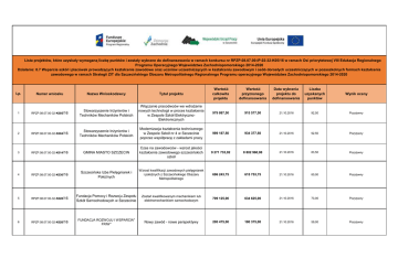 Lista projektów, które uzyskały wymaganą liczbę punktów i zostały wybrane do dofinansowania w ramach konkursu nr RPZP.08.07.00-IP.02-32-K05/16 w ramach Osi priorytetowej VIII Edukacja Regionalnego Programu Operacyjnego Województwa Zachodniopomorskiego 2014-2020 Działanie: 8.7 Wsparcie szkół i placówek prowadzących kształcenie zawodowe oraz uczniów uczestniczących w kształceniu zawodowym i osób dorosłych uczestniczących w pozaszkolnych formach kształcenia zawodowego w ramach Strategii ZIT dla Szczecińskiego Obszaru Metropolitalnego Regionalnego Programu operacyjnego Województwa Zachodniopomorskiego 2014-2020 Lp. Numer wniosku Nazwa Wnioskodawcy Tytuł projektu Wartość całkowita projektu Wartość przyznanego dofinansowania Data wybrania projektu do dofinansowania Liczba uzyskanych punktów Wynik oceny 1 RPZP.08.07.00-32-K005/16 Stowarzyszenie Inżynierów i Techników Mechaników Polskich Włączanie pracodwców we wdrażanie nowych technologii w proces kształcenia w Zespole Szkół ElektrycznoElektronicznych 979 887,50 915 577,50 21.10.2016 92,50 Pozytywny 2 RPZP.08.07.00-32-K004/16 Stowarzyszenie Inżynierów i Techników Mechaników Polskich Modernizacja kształcenia technicznego w Zespole Szkół nr 4 w Szczecinie poprzez współpracę z zakładami pracy 999 187,50 934 377,50 21.10.2016 92,50 Pozytywny 3 RPZP.08.07.00-32-K014/16 GMINA MIASTO SZCZECIN Czas na zawodowców - wzrost jakości kształcenia zawodowego szczecińskich szkół 9 271 733,92 8 802 960,90 21.10.2016 83,50 Pozytywny 4 RPZP.08.07.00-32-K030/16 Szczecińska Izba Pielęgniarek i Położnych Wzrost kwalifikacji zawodowych pielęgniarek i położnych z Szczecińskiego Obszaru Metropolitalnego 696 243,75 615 753,75 21.10.2016 80,00 Pozytywny 5 RPZP.08.07.00-32-K028/16 Fundacja Pomocy i Rozwoju Zespołu Szkół Samochodowych w Szczecinie Zostań kwalifikowanym mechanikiem lub elektromechanikiem samochodowym 709 125,00 634 625,00 21.10.2016 73,00 Pozytywny 6 RPZP.08.07.00-32-K020/16 FUNDACJA ROZWOJU I WSPARCIA" FRIW" Nowy zawód - nowe perspektywy 200 475,00 180 375,00 21.10.2016 59,00 Pozytywny
