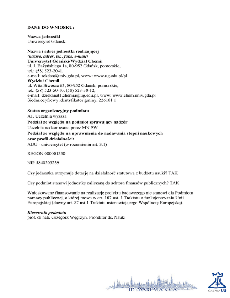 DANE DO WNIOSKU: Nazwa jednostki Uniwersytet Gdański Nazwa