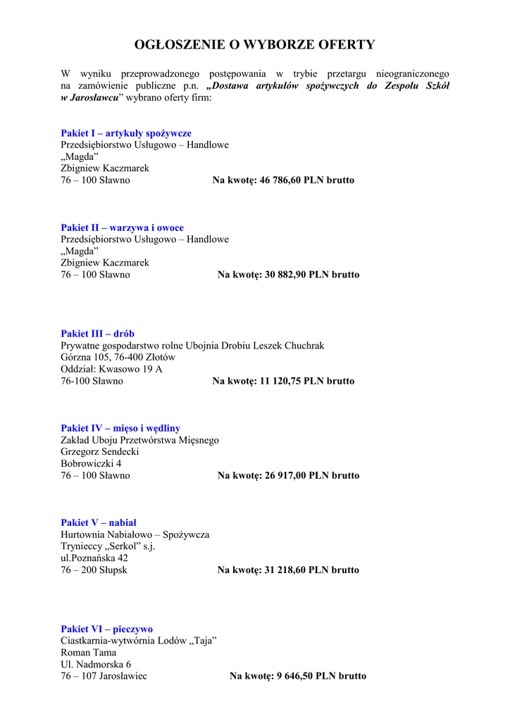 OGŁOSZENIE O WYBORZE OFERTY W wyniku przeprowadzonego postępowania w trybie przetargu nieograniczonego na zamówienie publiczne p.n. „Dostawa artykułów spożywczych do Zespołu Szkół w Jarosławcu” wybrano oferty firm: Pakiet I – artykuły spożywcze Przedsiębiorstwo Usługowo – Handlowe „Magda” Zbigniew Kaczmarek 76 – 100 Sławno Na kwotę: 46 786,60 PLN brutto Pakiet II – warzywa i owoce Przedsiębiorstwo Usługowo – Handlowe „Magda” Zbigniew Kaczmarek 76 – 100 Sławno Na kwotę: 30 882,90 PLN brutto Pakiet III – drób Prywatne gospodarstwo rolne Ubojnia Drobiu Leszek Chuchrak Górzna 105, 76-400 Złotów Oddział: Kwasowo 19 A 76-100 Sławno Na kwotę: 11 120,75 PLN brutto Pakiet IV – mięso i wędliny Zakład Uboju Przetwórstwa Mięsnego Grzegorz Sendecki Bobrowiczki 4 76 – 100 Sławno Na kwotę: 26 917,00 PLN brutto Pakiet V – nabiał Hurtownia Nabiałowo – Spożywcza Trynieccy „Serkol” s.j. ul.Poznańska 42 76 – 200 Słupsk Na kwotę: 31 218,60 PLN brutto Pakiet VI – pieczywo Ciastkarnia-wytwórnia Lodów „Taja” Roman Tama Ul. Nadmorska 6 76 – 107 Jarosławiec Na kwotę: 9 646,50 PLN brutto Pakiet VII – jaja Prywatne gospodarstwo rolne Ubojnia Drobiu Leszek Chuchrak Górzna 105, 76-400 Złotów Oddział: Kwasowo 19 A 76-100 Sławno Na kwotę: 3 510,00 PLN brutto Pakiet VIII – ziemniaki Gospodarstwo Rolne Joanna i Zenon Lech Wszędzień 2 76-113 Postomino Na kwotę: 4 862,00 PLN brutto Pakiet IX – mrożonki J.Witkowski, P.Witkowski PH LODIMEX UL. Pomorska 112a, 70-812 Szczecin Oddział: Bohaterów Warszawy 4 75-211 Koszalin Na kwotę: 7 643,90 PLN brutto Pakiet X – produkty gotowe Zakład Gastronomiczny „U Szwagra” s.c Dariusz Mizerski, Roman Bujko Warszkowo 172c 76 – 100 Sławno Na kwotę: 53 219,00 PLN brutto Pakiet XI – ryby mrożone J.Witkowski, P.Witkowski PH LODIMEX UL. Pomorska 112a, 70-812 Szczecin Oddział: Bohaterów Warszawy 4 75-211 Koszalin Na kwotę: 7 100,00 PLN brutto Pakiet XII – ryby wędzone Family – Ice Grzegorz Szczepański ul. Wodna 15 76-251 Kobylnica Na kwotę: 1 300,00 PLN brutto