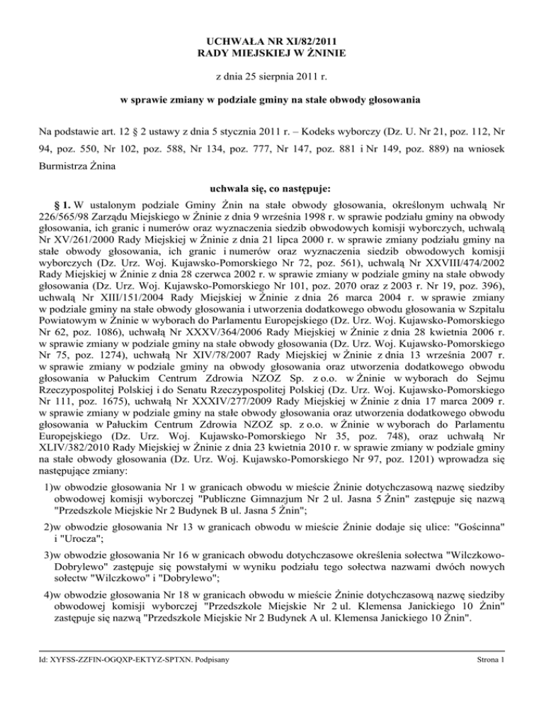 UCHWAŁA NR XI/82/2011 RADY MIEJSKIEJ W ŻNINIE z dnia 25 sierpnia 2011 r. w sprawie zmiany w podziale gminy na stałe obwody głosowania Na podstawie art. 12 § 2 ustawy z dnia 5 stycznia 2011 r. – Kodeks wyborczy (Dz. U. Nr 21, poz. 112, Nr 94, poz. 550, Nr 102, poz. 588, Nr 134, poz. 777, Nr 147, poz. 881 i Nr 149, poz. 889) na wniosek Burmistrza Żnina uchwala się, co następuje: § 1. W ustalonym podziale Gminy Żnin na stałe obwody głosowania, określonym uchwalą Nr 226/565/98 Zarządu Miejskiego w Żninie z dnia 9 września 1998 r. w sprawie podziału gminy na obwody głosowania, ich granic i numerów oraz wyznaczenia siedzib obwodowych komisji wyborczych, uchwalą Nr XV/261/2000 Rady Miejskiej w Żninie z dnia 21 lipca 2000 r. w sprawie zmiany podziału gminy na stałe obwody głosowania, ich granic i numerów oraz wyznaczenia siedzib obwodowych komisji wyborczych (Dz. Urz. Woj. Kujawsko-Pomorskiego Nr 72, poz. 561), uchwalą Nr XXVIII/474/2002 Rady Miejskiej w Żninie z dnia 28 czerwca 2002 r. w sprawie zmiany w podziale gminy na stałe obwody głosowania (Dz. Urz. Woj. Kujawsko-Pomorskiego Nr 101, poz. 2070 oraz z 2003 r. Nr 19, poz. 396), uchwalą Nr XIII/151/2004 Rady Miejskiej w Żninie z dnia 26 marca 2004 r. w sprawie zmiany w podziale gminy na stałe obwody głosowania i utworzenia dodatkowego obwodu głosowania w Szpitalu Powiatowym w Żninie w wyborach do Parlamentu Europejskiego (Dz. Urz. Woj. Kujawsko-Pomorskiego Nr 62, poz. 1086), uchwałą Nr XXXV/364/2006 Rady Miejskiej w Żninie z dnia 28 kwietnia 2006 r. w sprawie zmiany w podziale gminy na stałe obwody głosowania (Dz. Urz. Woj. Kujawsko-Pomorskiego Nr 75, poz. 1274), uchwałą Nr XIV/78/2007 Rady Miejskiej w Żninie z dnia 13 września 2007 r. w sprawie zmiany w podziale gminy na obwody głosowania oraz utworzenia dodatkowego obwodu głosowania w Pałuckim Centrum Zdrowia NZOZ Sp. z o.o. w Żninie w wyborach do Sejmu Rzeczypospolitej Polskiej i do Senatu Rzeczypospolitej Polskiej (Dz. Urz. Woj. Kujawsko-Pomorskiego Nr 111, poz. 1675), uchwałą Nr XXXIV/277/2009 Rady Miejskiej w Żninie z dnia 17 marca 2009 r. w sprawie zmiany w podziale gminy na stałe obwody głosowania oraz utworzenia dodatkowego obwodu głosowania w Pałuckim Centrum Zdrowia NZOZ sp. z o.o. w Żninie w wyborach do Parlamentu Europejskiego (Dz. Urz. Woj. Kujawsko-Pomorskiego Nr 35, poz. 748), oraz uchwałą Nr XLIV/382/2010 Rady Miejskiej w Żninie z dnia 23 kwietnia 2010 r. w sprawie zmiany w podziale gminy na stałe obwody głosowania (Dz. Urz. Woj. Kujawsko-Pomorskiego Nr 97, poz. 1201) wprowadza się następujące zmiany: 1)w obwodzie głosowania Nr 1 w granicach obwodu w mieście Żninie dotychczasową nazwę siedziby obwodowej komisji wyborczej "Publiczne Gimnazjum Nr 2 ul. Jasna 5 Żnin" zastępuje się nazwą "Przedszkole Miejskie Nr 2 Budynek B ul. Jasna 5 Żnin"; 2)w obwodzie głosowania Nr 13 w granicach obwodu w mieście Żninie dodaje się ulice: "Gościnna" i "Urocza"; 3)w obwodzie głosowania Nr 16 w granicach obwodu dotychczasowe określenia sołectwa "WilczkowoDobrylewo" zastępuje się powstałymi w wyniku podziału tego sołectwa nazwami dwóch nowych sołectw "Wilczkowo" i "Dobrylewo"; 4)w obwodzie głosowania Nr 18 w granicach obwodu w mieście Żninie dotychczasową nazwę siedziby obwodowej komisji wyborczej "Przedszkole Miejskie Nr 2 ul. Klemensa Janickiego 10 Żnin" zastępuje się nazwą "Przedszkole Miejskie Nr 2 Budynek A ul. Klemensa Janickiego 10 Żnin". Id: XYFSS-ZZFIN-OGQXP-EKTYZ-SPTXN. Podpisany Strona 1 § 2. Numery i granice obwodów głosowania oraz wyznaczone siedziby obwodowych komisji wyborczych uwzględniające zmiany opisane w § 1 stanowią załącznik do niniejszej uchwały. § 3. Wykonanie uchwały powierza się Burmistrzowi Żnina. § 4. Uchwała podlega przekazaniu Wojewodzie Kujawsko-Pomorskiemu i Komisarzowi Wyborczemu w Bydgoszczy. § 5. Uchwała podlega ogłoszeniu w Dzienniku Urzędowym Województwa Kujawsko–Pomorskiego, Biuletynie Informacji Publicznej Urzędu Miejskiego w Żninie oraz zostaje podana do wiadomości publicznej w sposób zwyczajowo przyjęty na terenie Gminy Żnin. § 6. Uchwała wchodzi w życie z dniem podjęcia. PRZEWODNICZĄCA RADY Halina Rosiak Id: XYFSS-ZZFIN-OGQXP-EKTYZ-SPTXN. Podpisany Strona 2 Uzasadnienie Zgodnie z art. 13 § 1- 2 ustawy z dnia 5 stycznia 2011 r. – Kodeks wyborczy wójt (odpowiednio burmistrz) przedkłada radzie gminy wnioski w sprawie zmian w podziale na stałe obwody głosowania, jeżeli konieczność taka wynika ze zmian granic gminy, zmiany liczby mieszkańców w gminie lub w obwodzie głosowania. Natomiast w przypadkach innych niż wymienione w art. 13 § 1, czyli zmian dokonywanych w sytuacji konieczności aktualizacji granic obwodów, nazewnictwa miejscowości, ulic lub siedzib lokali wyborczych, zgodnie z opinią Państwowej Komisji Wyborczej, zmian dokonuje się w oparciu o art. 12 § 2 Kodeksu wyborczego. Podziału gminy na stałe obwody głosowania dokonuje rada gminy, w drodze uchwały, na wniosek wójta (odpowiednio burmistrza). Zmian w podziale na stałe obwody głosowania dokonuje się najpóźniej w 45 dniu przed dniem wyborów. W związku z powyższym podjęcie przedmiotowej uchwały jest w pełni uzasadnione. PRZEWODNICZĄCA RADY Halina Rosiak Id: XYFSS-ZZFIN-OGQXP-EKTYZ-SPTXN. Podpisany Strona 1 Załącznik do Uchwały Nr XI/82/2011 Rady Miejskiej w Żninie z dnia 25 sierpnia 2011 r. Nr Granice obwodu głosowania obwodu Siedziba Obwodowej Komisji Wyborczej 1 Miasto Żnin – ulice: 22-Lipca, Bolesława Chrobrego, Bolesława Śmiałego, Cicha, Czarnieckiego, Glicznera, Górska, Grunwaldzka, Gwardii Ludowej, Jana III Sobieskiego, Jasna, Kazimierza Wielkiego, Klemensa Janickiego od Nr 1 do Nr 34, Nr 34A, Nr 36,38,40,42,42A, Leszka Białego, Lipowa, Majdanowa, Mieszka I, Miodowa, Nowa, Opłotkowa, Panoramiczna, Przemysława IV, Ptasia, Różana, Składowa, Skrajna, Sportowa, Ukośna, Władysława Jagiełły, Władysława Ł