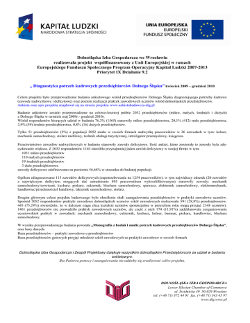 Dolnośląska Izba Gospodarcza we Wrocławiu realizowała projekt współfinansowany z Unii Europejskiej w ramach Europejskiego Funduszu Społecznego Program Operacyjny Kapitał Ludzki 2007-2013 Priorytet IX Działanie 9.2 „ Diagnostyka potrzeb kadrowych przedsiębiorców Dolnego Śląska” kwiecień 2009 – grudzień 2010 Celem projektu było przeprowadzenie badania ankietowego wśród przedsiębiorców Dolnego Śląska diagnozującego potrzeby kadrowe (zawody nadwyŜkowe i deficytowe) oraz poziom realizacji praktyk zawodowych uczniów wśród dolnośląskich przedsiębiorców. Ankieta oraz opis projektu znajdował się na stronie projektu www.ankietabadawcza-dig.pl Badanie ankietowe zostało przeprowadzone na celowo-losowej próbie 2052 przedsiębiorców (mikro, małych, średnich i duŜych) z Dolnego Śląska w terminie maj 2009r.- grudzień 2010r. Wśród respondentów biorących udział w badaniu 76,3% (1565) stanowiły mikro przedsiębiorstwa, 20,1% (412) małe przedsiębiorstwa, 2,9% (59) średnie przedsiębiorstwa, 0,8% (16) duŜych przedsiębiorstw. Tylko 51 przedsiębiorców (2%) z populacji 2052 miało w swoich firmach nadwyŜkę pracowników w 26 zawodach w tym: kelner, mechanik samochodowy, stolarz meblowy, technik obsługi turystycznej, introligator przemysłowy, księgowa. Przeciwieństwo zawodów nadwyŜkowych w badaniu stanowiły zawody deficytowe. Ilość ankiet, które zawierały te zawody była zdecydowanie większa. Z 2052 respondentów 1163 określiło przynajmniej jeden zawód deficytowy w swojej firmie w tym: 1031 mikro przedsiębiorstw 110 małych przedsiębiorstw 19 średnich przedsiębiorstw 3 duŜe przedsiębiorstwa zawody deficytowe zdefiniowano na poziomie 56,68% w stosunku do badanej populacji. Ogółem zdiagnozowano 115 zawodów deficytowych (zapotrzebowanie na 1254 pracowników), w tym największy odsetek (20 zawodów z największym deficytem mogących dać zatrudnienie 895 pracownikom wykwalifikowanym) stanowiły zawody: mechanik samochodowy/serwisant, kucharz, piekarz, cukiernik, blacharz samochodowy, spawacz, elektronik samochodowy, elektromechanik, handlowiec/przedstawiciel handlowy, lakiernik samochodowy, stolarz. Drugim głównym celem projektu badawczego było określenie skali zaangaŜowania przedsiębiorców w praktyki zawodowe uczniów. Spośród 2052 respondentów praktyki zawodowe dolnośląskich uczniów szkół zawodowych realizowało 591 (28,8%) przedsiębiorców. 445 (75,29%) stwierdziło, Ŝe w dalszym ciągu chcą kształcić uczniów (potencjalnie w przyszłym roku mogą przyjąć 2348 uczniów). 1461 przedsiębiorców nie prowadziło praktyk zawodowych uczniów, ale część z nich 174 (11,91%) zadeklarowała zorganizowanie uczniowskich praktyk w zawodach: mechanik samochodowy, cukiernik, kucharz, kelner, barman, piekarz, handlowiec, blacharz samochodowy. W wyniku przeprowadzonego badania powstała „Monografia z badań i analiz potrzeb kadrowych przedsiębiorców Dolnego Śląska”, oraz bazy danych: Baza przedsiębiorców – praktyki zawodowe u przedsiębiorców Baza przedsiębiorców gotowych przyjąć młodzieŜ szkół zawodowych na praktyki zawodowe w swoich firmach Dolnośląska Izba Gospodarcza i Zespół Projektowy dziękuje wszystkim dolnośląskim Przedsiębiorcom za udział w badaniu ankietowym. Bez Państwa pomocy i zaangaŜowania nie udałoby się zrealizować celów projektu. DOLNOŚLĄSKA IZBA GOSPODARCZA Lower Silesian Chamber of Commerce ul. Świdnicka 39 50-029 Wrocław tel. (+48 71) 372 44 91 fax. (+48 71) 343 45 97 www.dig.wroc.pl