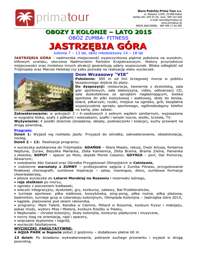 Biuro Podróży Prima Tour s.c. ul. Staszica 1/205, 25-008 Kielce tel/fax 041 344 53 29, kom. 509 222 026 e-mail: [email protected] www.primatour.pl REON 260135098, NIP 959 17 64 282 OBOZY I KOLONIE – LATO 2015 OBÓZ ZUMBA- FITNESS JASTRZĘBIA GÓRA kolonia 7 – 13 lat, obóz młodzieżowy 14 – 18 lat JASTRZĘBIA GÓRA - nadmorska miejscowość wypoczynkowa pięknie położona na wysokim, klifowym urwisku, otoczona Nadmorskim Parkiem Krajobrazowym. Walory przyrodnicze miejscowości oraz mnóstwo innych atrakcji gwarantują udany wypoczynek. Bliska odległość od Trójmiasta oraz Mierzei Helskiej czy Łeby pozwala na realizację wielu wycieczek. Dom Wczasowy "VIS" Położenie: 300 m od linii brzegowej morza w pobliżu bezpiecznego dojścia do plaży. Do dyspozycji: restauracja, kawiarnia z dyskoteką, sala gier sportowych, sala telewizyjna, video, odtwarzacz CD, sala dyskotekowa ze sprzętem nagłaśniającym, boiska sportowe do piłki koszykowej i siatkowej, stoły do tenisa, bilard, piłkarzyki, rzutki, miejsce na ognisko, grill, bezpłatna wypożyczalnia sprzętu sportowego, ogólnodostępny telefon na kartę, plac zabaw. Zakwaterowanie: w pokojach 3 i 4–osobowych z pełnym węzłem sanitarnym, wyposażone w wygodne łóżka, szafy z półkami i wieszakami, szafki i lampki nocne, stoliki, krzesła, TV. Wyżywienie: 4 posiłki dziennie (śniadania, obiady, podwieczorki i kolacje), suchy prowiant na drogę powrotną. Program: Dzień 1: Wyjazd wg rozkładu jazdy. Przyjazd do ośrodka, zakwaterowanie, obiadokolacja, nocleg. Dzień 2 – 12: Realizacja programu: • wycieczka autokarowa do Trójmiasta: GDAŃSK – Stare Miasto, ratusz, Dwór Artusa, fontanna Neptuna, Żuraw, Bazylika Mariacka, Złota Kamienica, Złota Brama, Brama Zielna, Panienka z okienka; SOPOT – spacer po Molo, deptak Monte Cassino; GDYNIA – port, Dar Pomorza, Akwarium; • zwiedzanie Alei Gwiazd oraz Ośrodka Przygotowań Olimpijskich w Cetniewie, • codzienne warsztaty z ZUMBY – profesjonalne zajęcia z Zumba Fitness, przygotowanie finałowej choreografii, zumbowe inspiracje – salsa, marengue, disco, zumbowa formacja cheerleaderska, • piesza wycieczka do Latarni Morskiej na Rozewiu i rezerwatu leśnego, • rejs statkiem po morzu, • ognisko z pieczeniem kiełbasek; • wieczór integracyjny, dyskoteki, gry, konkursy, zabawy, Bal Przebierańców, • turnieje sportowe: piłka siatkowa, koszykówka, ping-pong, piłka nożna, piłka plażowa, badminton, turnieje grup w czteroboju kolonijnym, Olimpiada Kolonijna – Jastrzębia Góra 2015, • kąpiele, plażowanie pod okiem ratownika, • programy: Mam Talent, Randka w Ciemno, Miliard w Rozumie, konkurs fryzur i makijażu, pokaz mody, wybory Miss i Mistera, konkurs Rzeźby w Piasku, • Neptunalia – chrzest kolonijny, śluby kolonijne, konkursy plastyczne i muzyczne, • nocny bieg na orientację, rajd i spacery, • wręczanie dyplomów i nagród, • wycieczki falultatywne. WYCIECZKI FAKULTATYWNE: • AQUA PARK w Sopocie pobyt 2 godzinny – dodatkowo płatne 60 zł. 13 dzień: Po śniadaniu wykwaterowanie, pobranie suchego prowiantu i wyjazd w drogę powrotną. Biuro Podróży Prima Tour s.c. ul. Staszica 1/205, 25-008 Kielce tel/fax 041 344 53 29, kom. 509 222 026 e-mail: [email protected] www.primatour.pl REGON 260135098, NIP 959 17 64 282 termin 16.07 – 28.07.2015 28.07 – 09.08.2015 Cena przy rezerwacji do 15.02.2015 do 15.03.2015 1 499 zł 1 559 zł 1 499 zł 1 559 zł Cena standard 1 599 zł 1 599 zł Dodatkowo płatne (dla chętnych): Ubezpieczenie od kosztów rezygnacji + 50 zł/os. Cena obejmuje: transport autokarem, 12 noclegów w pokojach z łazienkami, wyżywienie: 4 posiłki dziennie (śniadania, obiady, podwieczorki i kolacje), suchy prowiant na drogę powrotną, opiekę doświadczonej kadry pedagogicznej, instruktora fitness, stałą opiekę medyczna (lekarz i pielęgniarka), opiekę ratownika w czasie kąpieli morskich, realizację programu, ubezpieczenie NNW.