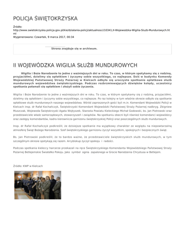 POLICJA ŚWIĘTOKRZYSKA Źródło: http://www.swietokrzyska.policja.gov.pl/kie/dzialania-policji/aktualnosci/10341,II-Wojewodzka-Wigilia-Sluzb-Mundurowych.ht ml Wygenerowano: Czwartek, 9 marca 2017, 00:34 Strona znajduje się w archiwum. II WOJEWÓDZKA WIGILIA SŁUŻB MUNDUROWYCH Wigilia i Boże Narodzenie to jedne z ważniejszych dni w roku. To czas, w którym spotykamy się z rodziną, przyjaciółmi, dzielimy się opłatkiem i życzymy sobie wszystkiego, co najlepsze. Dziś w budynku Komendy Wojewódzkiej Państwowej Straży Pożarnej w Kielcach odbyło się uroczyste spotkanie opłatkowe służb mundurowych województwa świętokrzyskiego. Podczas rozbrzmiewających dźwięków kolędy, uczestnicy spotkania połamali się opłatkiem i złożyli sobie życzenia. Wigilia i Boże Narodzenie to jedne z ważniejszych dni w roku. To czas, w którym spotykamy się z rodziną, przyjaciółmi, dzielimy się opłatkiem i życzymy sobie wszystkiego, co najlepsze. Po raz kolejny w tym właśnie okresie odbyło się spotkanie opłatkowe służb mundurowych naszego województwa. Wśród zaproszonych gości byli m.in. Komendant Wojewódzki Policji w Kielcach insp. dr Rafał Kochańczyk, Świętokrzyski Komendant Wojewódzki Państwowej Straży Pożarnej nadbryg. Zbigniew Muszczak, Wojewoda Świętokrzyski Agata Wojtyszek, Starosta Powiatu Kieleckiego Michał Godowski, bs. Jan Piotrowski oraz przedstawiciele władz samorządowych, stowarzyszeń i związków. Na spotkaniu obecni byli również komendanci wojewódzcy oraz zastępy komendantów, kadra kierownicza garnizonu świętokrzyskiej Policji oraz poszczególnych służb mundurowych. Insp. dr Rafał Kochańczyk podkreślił, że dzisiejsze spotkanie ma wyjątkowy charakter ze względu na niepowtarzalną atmosferę Świąt Bożego Narodzenia. Szef świętokrzyskiego garnizonu życzył wszystkim, spokojnych i bezpiecznych świąt. Bs. Jan Piotrowski podkreślił, że to bardzo ważne, że przedstawiciele świętokrzyskich służb mundurowych, w tym szczególnym okresie spotykają się razem. Arcybiskup życzył spokoju i radości. Podczas spotkania kieleccy harcerze przekazali na ręce Świętokrzyskiego Komendanta Wojewódzkiego Państwowej Straży Pożarnej Betlejemskie Światełko Pokoju. Jako symbol ognia zapalonego w Grocie Narodzenia Chrystusa w Betlejem. Źródło: KWP w Kielcach Ocena: 5/5 (1) Tweetnij
