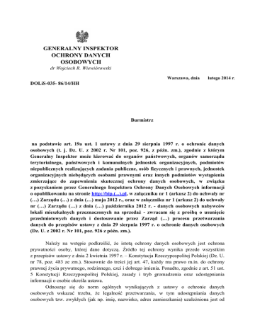 GENERALNY INSPEKTOR OCHRONY DANYCH OSOBOWYCH dr Wojciech R. Wiewiórowski Warszawa, dnia lutego 2014 r. DOLiS-035- 86/14/HH Burmistrz na podstawie art. 19a ust. 1 ustawy z dnia 29 sierpnia 1997 r. o ochronie danych osobowych (t. j. Dz. U. z 2002 r. Nr 101, poz. 926, z późn. zm.), zgodnie z którym Generalny Inspektor może kierować do organów państwowych, organów samorządu terytorialnego, państwowych i komunalnych jednostek organizacyjnych, podmiotów niepublicznych realizujących zadania publiczne, osób fizycznych i prawnych, jednostek organizacyjnych niebędących osobami prawnymi oraz innych podmiotów wystąpienia zmierzające do zapewnienia skutecznej ochrony danych osobowych, w związku z pozyskaniem przez Generalnego Inspektora Ochrony Danych Osobowych informacji o opublikowaniu na stronie http://bip.(...).pl, w załączniku nr 1 (arkusz 2) do uchwały nr (…) Zarządu (…) z dnia (…) maja 2012 r., oraz w załączniku nr 1 (arkusz 2) do uchwały nr (…) Zarządu (…) z dnia (…) października 2012 r. - danych osobowych nabywców lokali mieszkalnych przeznaczonych na sprzedaż - zwracam się z prośbą o usunięcie przedmiotowych danych i dostosowanie przez Zarząd (…) procesu przetwarzania danych do przepisów ustawy z dnia 29 sierpnia 1997 r. o ochronie danych osobowych (Dz. U. z 2002 r. Nr 101, poz. 926 z późn. zm.). Należy na wstępie podkreślić, że istotą ochrony danych osobowych jest ochrona prywatności osoby, której dane dotyczą. Źródło tej ochrony wynika przede wszystkim z przepisów ustawy z dnia 2 kwietnia 1997 r. – Konstytucja Rzeczypospolitej Polskiej (Dz. U. nr 78, poz. 483 ze zm.). Stosownie do treści jej art. 47, każdy ma prawo m.in. do ochrony prawnej życia prywatnego, rodzinnego, czci i dobrego imienia. Ponadto, zgodnie z art. 51 ust. 5 Konstytucji Rzeczypospolitej Polskiej, zasady i tryb gromadzenia oraz udostępniania informacji o osobie określa ustawa. Odnosząc się do norm ogólnych wynikających z ustawy o ochronie danych osobowych wskazać trzeba, że legalność przetwarzania, w tym udostępniania danych osobowych tzw. zwykłych (jak np. imię, nazwisko, adres zamieszkania) uzależniona jest od spełnienia jednej z przesłanek wymienionych w art. 23 ust. 1 pkt 1-5 ustawy o ochronie danych osobowych. Mocą ww. przepisu, przetwarzanie danych osobowych „zwykłych” (tj. dotyczących informacji, które nie są szczególnie chronione w rozumieniu art. 27 ust. 1 ustawy o ochronie danych osobowych) jest dopuszczalne, po spełnieniu jednego z następujących warunków: osoba, której dane dotyczą, wyrazi na to zgodę, chyba że chodzi o usunięcie dotyczących jej danych (pkt 1), jest to niezbędne dla zrealizowania uprawnienia lub spełnienia obowiązku wynikającego z przepisu prawa (pkt 2), jest to konieczne do realizacji umowy, gdy osoba, której dane dotyczą, jest jej stroną lub gdy jest to niezbędne do podjęcia działań przed zawarciem umowy na żądanie osoby, której dane dotyczą (pkt 3), jest niezbędne do wykonania określonych prawem zadań realizowanych dla dobra publicznego (pkt 4), jest to niezbędne dla wypełnienia prawnie usprawiedliwionych celów realizowanych przez administratorów danych albo odbiorców danych, a przetwarzanie nie narusza praw i wolności osoby, której dane dotyczą (pkt 5). Przesłanki legalizujące przetwarzanie danych osobowych mają charakter autonomiczny oraz rozłączny i co do zasady są równoprawne, dlatego też spełnienie jednej z nich stanowi o zgodnym z prawem przetwarzaniu danych osobowych. Przepisy ustawy z dnia 21 sierpnia 1997 r. o gospodarce nieruchomościami (Dz. U. z 2010 r., Nr 102 poz. 651 ze zm.) regulują w art. 34 i 35 prawo pierwszeństwa nabycia lokalu mieszkalnego m.in. przez jego najemcę i procedurę sporządzania i podania do publicznej wiadomości wykazu nieruchomości przeznaczonych do sprzedaży, do oddania w użytkowanie wieczyste, użytkowanie, najem lub dzierżawę. Przepisy te jednak nie przewidują upubliczniania danych osobowych osób, które wykupiły przedmiotowe lokale mieszkalne. Zwrócić uwagę należy, iż również zapisy uchwały Nr (…) Rady miasta (…) z dnia (…) grudnia 2004 r. nie przewidują upubliczniania takich danych osobowych. Mając na uwadze powyższe uprzejmie proszę Pana Burmistrza o wnikliwe przeanalizowanie zgłoszonych niniejszym pismem uwag, oraz ustosunkowanie się do niniejszego pisma, w tym poprzez podjęcie niezbędnych działań mających na celu usunięcie danych upublicznionych bez podstawy prawnej i doprowadzenie do przetwarzania danych zgodnie z obowiązującymi przepisami prawa. Jednocześnie, stosownie do art. 19a ust. 3 ustawy o ochronie danych osobowych, proszę o przekazanie Generalnemu Inspektorowi informacji o podjętych działaniach w sygnalizowanej sprawie w terminie 30 dni od dnia jego otrzymania. Informuję przy tym, że treść niniejszego wystąpienia wraz z udzieloną odpowiedzią opublikowana będzie na stronie internetowej Generalnego Inspektora Ochrony Danych Osobowych.