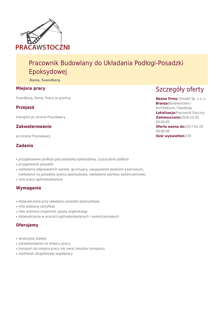 Pracownik Budowlany do Układania Podłogi-Posadzki Epoksydowej Dania, Svendborg Miejsce pracy Szczegóły oferty Svendborg, Dania. Praca za granicą. Nazwa firmy: Dimakt Sp. z o. o. Branża:Budownictwo / Architektura / Geodezja Lokalizacja:Pracownik fizyczny Zamieszczono:2016-12-20 00:00:00 Oferta ważna do:2017-01-20 00:00:00 Ilość wyświetleń:370 Przejazd transport po stronie Pracodawcy Zakwaterowanie po stronie Pracodawcy Zadania ● ● ● ● przygotowanie podłoża pod posadzkę epoksydową, czyszczenie podłoża przygotwanie posadzki nakładanie odpowiednich warstw: gruntująca, zasypywanie piaskiem kwarcowym, nakładanie na posadzkę żywicy epoksydowej, nakładanie warstwy wykończeniowej inne prace ogólnobudowlane Wymagania ● ● ● ● doświadczenie przy układaniu posadzki epoksydowej mile widziany certyfikat mile widziana znajomość języka angielskiego doświadczenie w pracach ogólnobudowlanych i wykończeniowych Oferujemy ● ● ● ● atrakcyjną stawkę zakwaterowanie na miejscu pracy transport do miejsca pracy lub zwrot kosztów transportu możliwość długofalowej współpracy