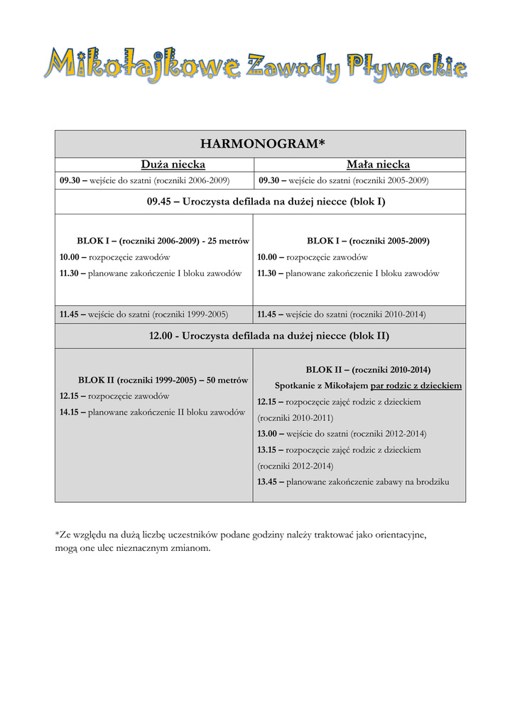 HARMONOGRAM* Duża niecka 09.30 – wejście do szatni (roczniki 2006-2009) Mała niecka 09.30 – wejście do szatni (roczniki 2005-2009) 09.45 – Uroczysta defilada na dużej niecce (blok I) BLOK I – (roczniki 2006-2009) - 25 metrów BLOK I – (roczniki 2005-2009) 10.00 – rozpoczęcie zawodów 10.00 – rozpoczęcie zawodów 11.30 – planowane zakończenie I bloku zawodów 11.30 – planowane zakończenie I bloku zawodów 11.45 – wejście do szatni (roczniki 1999-2005) 11.45 – wejście do szatni (roczniki 2010-2014) 12.00 - Uroczysta defilada na dużej niecce (blok II) BLOK II (roczniki 1999-2005) – 50 metrów 12.15 – rozpoczęcie zawodów 14.15 – planowane zakończenie II bloku zawodów BLOK II – (roczniki 2010-2014) Spotkanie z Mikołajem par rodzic z dzieckiem 12.15 – rozpoczęcie zajęć rodzic z dzieckiem (roczniki 2010-2011) 13.00 – wejście do szatni (roczniki 2012-2014) 13.15 – rozpoczęcie zajęć rodzic z dzieckiem (roczniki 2012-2014) 13.45 – planowane zakończenie zabawy na brodziku *Ze względu na dużą liczbę uczestników podane godziny należy traktować jako orientacyjne, mogą one ulec nieznacznym zmianom.