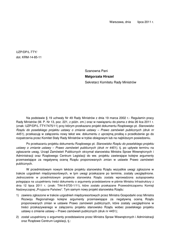 Warszawa, dnia lipca 2011 r. UZP/DP/L-TTY/ dot. KRM-14-85-11 Szanowna Pani Małgorzata Hirszel Sekretarz Komitetu Rady Ministrów Na podstawie § 19 uchwały Nr 49 Rady Ministrów z dnia 19 marca 2002 r.- Regulamin pracy Rady Ministrów (M. P. Nr 13, poz. 221, z późn. zm.) oraz w nawiązaniu do pisma z dnia 26 lica 2011 r. (znak: UZP/DP/L-TTY/7475/11) przy którym przekazano projekt dokumentu Rządowego pt. Stanowisko Rządu do poselskiego projektu ustawy o zmianie ustawy – Prawo zamówień publicznych (druk nr 4451), przekazuję w załączeniu nowy tekst ww. dokumentu z uprzejmą prośbą o przedłożenie go do rozpatrzenia przez Komitet Stały Rady Ministrów w trybie obiegowym lub na najbliższym posiedzeniu. Po przekazaniu projektu dokumentu Rządowego pt. Stanowisko Rządu do poselskiego projektu ustawy o zmianie ustawy – Prawo zamówień publicznych (druk nr 4451), tj. po upływie terminu na zgłaszanie uwag, Urząd Zamówień Publicznych otrzymał stanowiska Ministra Spraw Wewnętrznych i Administracji oraz Rządowego Centrum Legislacji do ww. projektu zawierające kolejne argumenty przemawiające za negatywną oceną Rządu proponowanych zmian w ustawie Prawo zamówień publicznych. W przedmiotowym nowym tekście projektu stanowiska Rządu wszystkie uwagi zgłoszone w trakcie uzgodnień międzyresortowych, w tym uwagi przekazane po terminie, zostały uwzględnione. Jednocześnie w przedmiotowym projekcie stanowiska Rządu została wprowadzona autopoprawka polegająca na uzupełnieniu treści dokumentu o argumenty przedstawione w piśmie Ministra Infrastruktury z dnia 12 lipca 2011 r. (znak: TA4-Ił-0720-1/11), które zostało przekazane Przewodniczącemu Komisji Nadzwyczajnej „Przyjazne Państwo”. Tym samym nowy projekt stanowiska Rządu: 1) zawiera zgłoszone w trakcie uzgodnień międzyresortowych przez Ministra Gospodarki oraz Ministra Rozwoju Regionalnego kolejne argumenty przemawiające za negatywną oceną Rządu proponowanych zmian w ustawie Prawo zamówień publicznych, które zostały uwzględnione w treści przekazywanego w załączeniu projektu stanowisko Rządu wobec poselskiego projektu ustawy o zmianie ustawy – Prawo zamówień publicznych (druk nr 4451); 2) został uzupełniony o argumenty przedstawione przez Ministra Spraw Wewnętrznych i Administracji oraz Rządowe Centrum Legislacji, tj.: a) w części II treść pkt 1 otrzymała brzmienie: „1) obowiązek określenia terminu, w którym wykonawca powinien udzielić wyjaśnień, ma na celu zapewnienie sprawnego przebiegu postępowania o udzielenie zamówienia, usunięcie tego obowiązku spowoduje brak pewności zamawiającego co do możliwości wskazania takiego terminu, a także brak wiedzy wykonawcy co do czasu, w którym wyjaśnienia złożyć. Sytuacja taka może doprowadzić do zahamowania postępowania o udzielenie zamówienia publicznego bowiem do momentu złożenia wyjaśnień przez wykonawcę, oferta nie będzie mogła zostać odrzucona, jak również nie będzie mogła zostać wybrana jako najkorzystniejsza. Z drugiej strony, obecnie przewidziane w przepisie art. 90 ust. 1 Prawa zamówień publicznych odniesienie do terminu złożenia wyjaśnień ma służyć zapewnieniu wykonawcy odpowiedniego okresu na przygotowania i złożenia przekonywujących wyjaśnień dotyczących rażąco niskiej ceny złożonej przez niego oferty. Tym samym usunięcie z brzmienia przepisu art. 90 ust. 1 zwrotu: „w określonym terminie” może pociągnąć za sobą wyznaczanie przez zamawiających terminów niewystarczających do przedstawienia odpowiednich wyjaśnień, co będzie miało szczególne znaczenie wobec proponowanych zmian przepisu art. 90 ust. 3, tj. w sytuacji przyjęcia, iż w przypadku zwrócenia się przez zamawiającego do wykonawcy w sprawie rażąco niskiej ceny, to na wykonawcy ciąży obowiązek wykazania, iż wadą tą nie jest obarczona jego oferta. Jednakże przede wszystkim podkreślenia wymaga fakt, iż obecnie obowiązujące brzmienie przepisu art. 90 ust. 1 Prawa zamówień publicznych pozwala zamawiającemu na wielokrotne zwracanie się do wykonawcy o udzielenie wyjaśnień odnośnie rażąco niskiej ceny, co więcej zamawiający jest obowiązany do kontynuowania wyjaśnień aż do momentu usunięcia wszelkich wątpliwości albo potwierdzenia istnienia rażąco niskiej ceny;”, b) w części II pkt 2 został uzupełniony o następującą treść: „Projektowany przepis nie odnosi się również do kosztów pracy podwykonawców uczestniczących w realizacji zamówienia. Dodatkowo zauważyć należy, iż omawiany przepis nie spełnia wymogu określoności przepisów prawa, bowiem użyto w nim niezdefiniowanego zarówno w przedmiotowym projekcie ustawy, jak i w systemie prawa, pojęcia „koszty pracy”. W potocznym rozumieniu pojęcie to może być interpretowane dwojako, albo jako koszty wynikające ze stosunku pracy łączącego pracownika i pracodawcę (rozumienie sensu stricto) albo jako generalnie koszty „siły roboczej” ponoszone w związku z wykonaniem zamówienia (rozumienie sensu largo). W tym miejscu zauważyć należy, iż przy zastosowaniu szerokiej interpretacji ww. pojęcia pojawia się wątpliwość czy należ brać pod uwagę wartość całej umowy cywilnej czy też wyłącznie część wartości stanowiącą pokrycie kosztów „robocizny”.;”; c) w części II pkt 4 został uzupełniony o następującą treść: „Równocześnie należy zauważyć, iż w przypadku zamówień na roboty budowlane, tj. w sytuacji gdy zamawiający dokonuje szczegółowego opisu przedmiotu zamówienia i precyzyjnie określa zarówno termin wykonania zamówienia, warunki gwarancji, parametry techniczne i jakościowe, określanie dodatkowego, poza ceną, kryterium oceny ofert, jest bezprzedmiotowe – albowiem kwestie te są bezwzględnie wymagane od każdego z wykonawców przystępujących do postępowania o udzielenie zamówienia. Tym samym w przedstawionej sytuacji jedynym kr