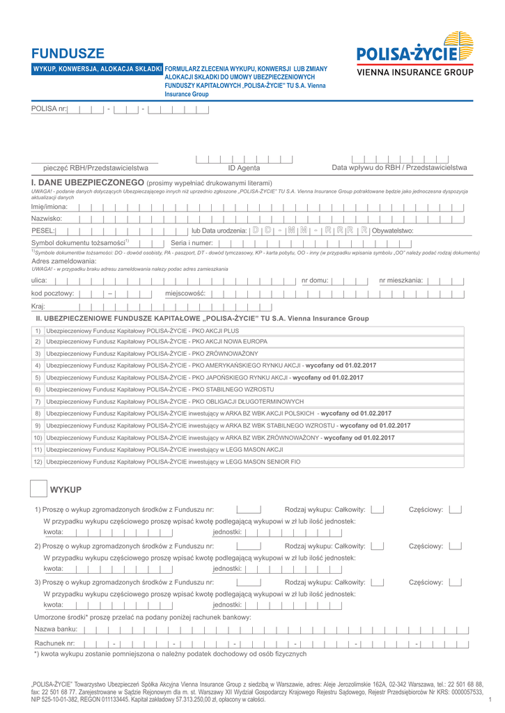 FUNDUSZE WYKUP, KONWERSJA, ALOKACJA SKŁADKI F ORMULARZ ZLECENIA WYKUPU, KONWERSJI LUB ZMIANY ALOKACJI SKŁADKI DO UMOWY UBEZPIECZENIOWYCH FUNDUSZY KAPITAŁOWYCH „POLISA-ŻYCIE” TU S.A. Vienna Insurance Group POLISA nr: - - pieczęć RBH/Przedstawicielstwa Data wpływu do RBH / Przedstawicielstwa ID Agenta I. DANE UBEZPIECZONEGO (prosimy wypełniać drukowanymi literami) UWAGA! - podanie danych dotyczących Ubezpieczającego innych niż uprzednio zgłoszone „POLISA-ŻYCIE” TU S.A. Vienna Insurance Group potraktowane będzie jako jednoczesna dyspozycja aktualizacji danych Imię/imiona: Nazwisko: PESEL: lub Data urodzenia: Symbol dokumentu tożsamości 1) 1) Obywatelstwo: Seria i numer: Symbole dokumentów tożsamości: DO - dowód osobisty, PA - paszport, DT - dowód tymczasowy, KP - karta pobytu, OO - inny (w przypadku wpisania symbolu „OO” należy podać rodzaj dokumentu) Adres zameldowania: UWAGA! - w przypadku braku adresu zameldowania nalezy podac adres zamieszkania ulica: nr domu: kod pocztowy: – nr mieszkania: miejscowość: Kraj: II. Ubezpieczeniowe Fundusze Kapitałowe „POLISA-ŻYCIE” TU S.A. Vienna Insurance Group 1) Ubezpieczeniowy Fundusz Kapitałowy POLISA-ŻYCIE - PKO AKCJI PLUS 2) Ubezpieczeniowy Fundusz Kapitałowy POLISA-ŻYCIE - PKO AKCJI NOWA EUROPA 3) Ubezpieczeniowy Fundusz Kapitałowy POLISA-ŻYCIE - PKO ZRÓWNOWAŻONY 4) Ubezpieczeniowy Fundusz Kapitałowy POLISA-ŻYCIE - PKO AMERYKAŃSKIEGO RYNKU AKCJI - wycofany od 01.02.2017 5) Ubezpieczeniowy Fundusz Kapitałowy POLISA-ŻYCIE - PKO JAPOŃSKIEGO RYNKU AKCJI - wycofany od 01.02.2017 6) Ubezpieczeniowy Fundusz Kapitałowy POLISA-ŻYCIE - PKO STABILNEGO WZROSTU 7) Ubezpieczeniowy Fundusz Kapitałowy POLISA-ŻYCIE - PKO OBLIGACJI DŁUGOTERMINOWYCH 8) Ubezpieczeniowy Fundusz Kapitałowy POLISA-ŻYCIE inwestujący w ARKA BZ WBK AKCJI POLSKICH - wycofany od 01.02.2017 9) Ubezpieczeniowy Fundusz Kapitałowy POLISA-ŻYCIE inwestujący w ARKA BZ WBK STABILNEGO WZROSTU - wycofany od 01.02.2017 10) Ubezpieczeniowy Fundusz Kapitałowy POLISA-ŻYCIE inwestujący w ARKA BZ WBK ZRÓWNOWAŻONY - wycofany od 01.02.2017 11) Ubezpieczeniowy Fundusz Kapitałowy POLISA-ŻYCIE inwestujący w LEGG MASON AKCJI 12) Ubezpieczeniowy Fundusz Kapitałowy POLISA-ŻYCIE inwestujący w LEGG MASON SENIOR FIO WYKUP 1) Proszę o wykup zgromadzonych środków z Funduszu nr: Rodzaj wykupu: Całkowity: Częściowy: W przypadku wykupu częściowego proszę wpisać kwotę podlegającą wykupowi w zł lub ilość jednostek: kwota: jednostki: 2) Proszę o wykup zgromadzonych środków z Funduszu nr: Rodzaj wykupu: Całkowity: Częściowy: W przypadku wykupu częściowego proszę wpisać kwotę podlegającą wykupowi w zł lub ilość jednostek: kwota: jednostki: 3) Proszę o wykup zgromadzonych środków z Funduszu nr: Rodzaj wykupu: Całkowity: Częściowy: W przypadku wykupu częściowego proszę wpisać kwotę podlegającą wykupowi w zł lub ilość jednostek: kwota: jednostki: Umorzone środki* proszę przelać na podany poniżej rachunek bankowy: Nazwa banku: Rachunek nr: *) kwota wykupu zostanie pomniejszona o należny podatek dochodowy od osób fizycznych - - „POLISA-ŻYCIE” Towarzystwo Ubezpieczeń Spółka Akcyjna Vienna Insurance Group z siedzibą w Warszawie, adres: Aleje Jerozolimskie 162A, 02-342 Warszawa, tel.: 22 501 68 88, fax: 22 501 68 77. Zarejestrowane w Sądzie Rejonowym dla m. st. Warszawy XII Wydział Gospodarczy Krajowego Rejestru Sądowego, Rejestr Przedsiębiorców Nr KRS: 0000057533, NIP 525-10-01-382, REGON 011133445. Kapitał zakładowy 57.313.250,00 zł, opłacony w całości. 1 KONWERSJA 1) Proszę o przeniesienie zgromadzonych środków z Funduszu nr: Rodzaj konwersji: Całkowita: na Fundusz nr: Częściowa: W przypadku konwersji częściowej proszę wpisać kwotę podlegającą konwersji w zł lub ilość jednostek: kwota: jednostki: 2) Proszę o przeniesienie zgromadzonych środków z Funduszu nr: Rodzaj konwersji: Całkowita: na Fundusz nr: Częściowa: W przypadku konwersji częściowej proszę wpisać kwotę podlegającą konwersji w zł lub ilość jednostek: kwota: jednostki: 3) Proszę o przeniesienie zgromadzonych środków z Funduszu nr: Rodzaj konwersji: Całkowita: na Fundusz nr: Częściowa: W przypadku konwersji częściowej proszę wpisać kwotę podlegającą konwersji w zł lub ilość jednostek: kwota: jednostki: OŚWIADCZENIE UBEZPIECZONEGO Niniejszym oświadczam, że otrzymałem Regulamin wybranego Ubezpieczeniowego Funduszu Kapitałowego „POLISA-ŻYCIE” TU S.A. Vienna Insurance Group, na który dokonałem konwersji zgromadzonych środków. Data podpisania podpis Ubezpieczonego / Ubezpieczanego pieczęć i podpis przedstawiciela „POLISA-ŻYCIE” TU S.A. Vienna Insurance Group ZMIANA ALOKACJI SKŁADKI Proszę o zmianę alokacji składki regularnej zgodnie z następującym podziałem: Składka: w% kwota** Nr Funduszu Nr Funduszu Nr Funduszu Nr Funduszu Nr Funduszu Zmiana alokacji składki nastąpi od pierwszego dnia roboczego następującego po dniu wpływu do Centrali „POLISA-ŻYCIE” TU S.A. Vienna Insurance Group powyższego oświadczenia o zmianie alokacji składki. **) Zgodnie z postanowieniami ogólnych warunków Umowy Ubezpieczeniowych Funduszy Kapitałowych „POLISA-ŻYCIE” TU S.A. Vienna Insurance Group minimalna wysokość miesięcznej składki z tytułu inwestowania w ramach jednego z Funduszu wynosi 30,00 zł Data podpisania podpis Ubezpieczonego / Ubezpieczanego pieczęć i podpis przedstawiciela „POLISA-ŻYCIE” TU S.A. Vienna Insurance Group 2