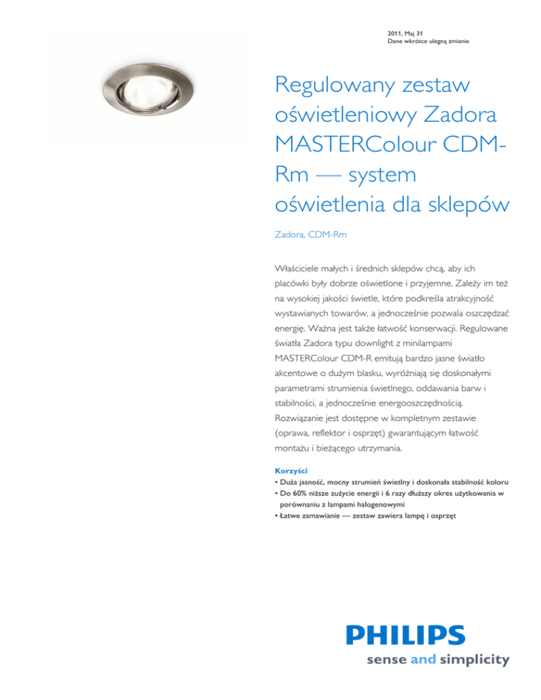 2011, Maj 31 Dane wkrótce ulegną zmianie Regulowany zestaw oświetleniowy Zadora MASTERColour CDMRm — system oświetlenia dla sklepów Zadora, CDM-Rm Właściciele małych i średnich sklepów chcą, aby ich placówki były dobrze oświetlone i przyjemne. Zależy im też na wysokiej jakości świetle, które podkreśla atrakcyjność wystawianych towarów, a jednocześnie pozwala oszczędzać energię. Ważna jest także łatwość konserwacji. Regulowane światła Zadora typu downlight z minilampami MASTERColour CDM-R emitują bardzo jasne światło akcentowe o dużym blasku, wyróżniają się doskonałymi parametrami strumienia świetlnego, oddawania barw i stabilności, a jednocześnie energooszczędnością. Rozwiązanie jest dostępne w kompletnym zestawie (oprawa, reflektor i osprzęt) gwarantującym łatwość montażu i bieżącego utrzymania. Korzyści • Duża jasność, mocny strumień świetlny i doskonała stabilność koloru • Do 60% niższe zużycie energii i 6 razy dłuższy okres użytkowania w porównaniu z lampami halogenowymi • Łatwe zamawianie — zestaw zawiera lampę i osprzęt Zadora, CDM-Rm 2 Cechy • Lampy CDM-R Mini zastępują lampy halogenowe • Doskonała jasność i bardzo dobre oddawanie barw • System „przekręć i zablokuj” (twist and lock) bardzo ułatwia wymianę i konserwację • Kompletny zestaw zapewniający łatwość instalacji Wniosek • Małe i średnie sklepy Specyfikacje • Typ MBG570 • Materiał Odlew aluminiowy i stal • Źródło światła 1 x MASTERColour CDM-R Mini/ GX10/20, 35 W • Kolor Biały (WH) i aluminium szczotkowane (ALU) • Kąt rozsyłu Wiązki: 25 º, 40º • Instalacja • Zawiera lampę Tak (barwa lampy: 830 lub 930) • Pozycja lampy Pionowa Mocowanie za pomocą łączników sprężystych Pochylane: 30º od położenia pionowego • Statecznik Elektroniczny, typu HF, 220 - 240 V / 50 - 60 Hz: Osprzęt elektroniczny HID • Konserwacja Bezpośredni dostęp do lampy • Uwagi Wersja z zestawem: zawiera źródło światła i osprzęt • Zastosowania główne Sklepy: odzież • Złączka Szybkozłączka (lub szybkozłączki) push-in z 3 biegunami i zwolnieniem napięcia Produkty powiązane Zadora MBG570 adjustable downlight Zadora MBG570 adjustable downlight Rysunki techniczne MBG570 2011, Maj 31 Dane wkrótce ulegną zmianie Zadora, CDM-Rm 3 Porównaj tabeli Kod zamówienia Rodzina produktów Ilość źródeł światła Kod rodziny źródła światła Moc lampy Barwa światła lampy Kolor Napięcie Kod IP Osprzęt Klasa ochrony Temperatura otoczenia 740413 99 MBG570 1 CDM-Rm 20 830 WH 220-240 IP20 EB CLI NT 740437 99 MBG570 1 CDM-Rm 20 830 WH 220-240 IP20 EB CLI NT 740451 99 MBG570 1 CDM-Rm 35 930 WH 220-240 IP20 EB CLI NT 740475 99 MBG570 1 CDM-Rm 35 930 WH 220-240 IP20 EB CLI NT 740420 99 MBG570 1 CDM-Rm 20 830 ALU 220-240 IP20 EB CLI NT 740468 99 MBG570 1 CDM-Rm 35 930 ALU 220-240 IP20 EB CLI NT 740482 99 MBG570 1 CDM-Rm 35 930 ALU 220-240 IP20 EB CLI NT Porównaj tabeli Kod zamówienia Rodzina produktów Znak bezpieczeństwa Test 850 °C 740413 99 MBG570 F 850/5 740437 99 MBG570 F 850/5 740451 99 MBG570 F 850/5 740475 99 MBG570 F 850/5 740420 99 MBG570 F 850/5 740468 99 MBG570 F 850/5 740482 99 MBG570 F 850/5 © 2011 Koninklijke Philips Electronics N.V. Wszelkie prawa zastrzeżone Dane mogą ulec zmianie bez uprzedniego powiadomienia. Znak towarowy jest własnością Koninklijke Philips Electronics N.V. lub odpowiednich podmiotów . www.philips.com/lighting 2011, Maj 31 Dane wkrótce ulegną zmianie