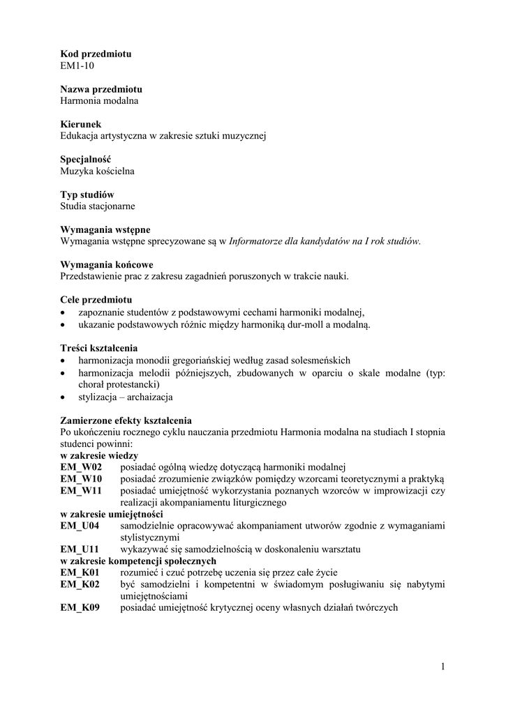 1 Kod przedmiotu EM1-10 Nazwa przedmiotu Harmonia modalna