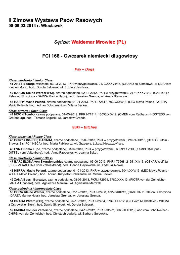 II Zimowa Wystawa Psów Rasowych 08-09.03.2014 r. Włocławek Sędzia: Waldemar Mrowiec (PL) FCI 166 - Owczarek niemiecki długowłosy Psy – Dogs Klasa młodzieży / Junior Class 41 ARES Badorja, wilczaste, 03-03-2013, PKR w przygotowaniu, 2172/XXXVII/13, (GRAND ze Słomkowa - EIDDA vom Kleinen Mohr), hod. Dorota Balcerak, wł. Elżbieta Jasińska. 42 BARON Kleine Werder (FCI), czarne podpalane, 02-12-2012, PKR w przygotowaniu, 2171/XXXVII/12, (CASTOR z Peletonu Skorpiona - DARZA Marino Haus), hod. Jarosław Grenda, wł. Aneta Błaszczyk. 43 HARRY Mavic Poland, czarne podpalane, 01-01-2013, PKR.I-72617, 6039/XXV/13, (LEO Mavic Poland - WIERA Mavic Poland), hod. Adrian Dobrzański, wł. Milena Becker. Klasa otwarta / Open Class 44 NIXON Tombo, czarne podpalane, 31-05-2012, PKR.I-71514, 13050/XIX/12, (OMEN vom Radhaus - HOSTESS von Grafenburg), hod. Tomasz Bogucki, wł. Jarosław Grenda. Suki – Bitches Klasa szczeniąt / Puppy Class 45 Brawos Bis (FCI) CANADA, czarne podpalane, 02-09-2013, PKR w przygotowaniu, 21674/XII/13, (BLACK Lutolu Brawos Bis (FCI) HECA), hod. Marta Falkiewicz, wł. Grzegorz, Łukasz Kleszczcyńscy. 46 EVRA Primo Lupo, czarne podpalane, 03-07-2013, PKR w przygotowaniu, 6059/XXV/13, (XAMBO Kalupus GITTEL vom Valtenberg), hod. Anna Rzepecka, wł. Joanna Sykut. Klasa młodzieży / Junior Class 47 BARCELONA von Skorpionenblut, czarne podpalane, 03-06-2013, PKR.I-73568, 21551/XII/13, (OSKAR Wolf Jar (FCI) - ZERAPHINA vom Zellwaldrand), hod. Hanna Gajtkowska, wł. Tadeusz Nowak. 48 HERRA Mavic Poland, czarne podpalane, 01-01-2013, PKR w przygotowaniu, 6044/XXV/13, (LEO Mavic Poland WIERA Mavic Poland), hod. Adrian, Krzysztof Dobrzański, wł. Milena Becker. 49 ŻANA Boss i Bursztyn, czarne podpalane, 08-06-2013, PKR.I-72991, 6780/XXX/13, (PIOTR von der Zenteiche LARISA Linabero), hod. Agnieszka Marczak, wł. Agnieszka Marczak. Klasa pośrednia / Intermediate Class 50 BORA Kleine Werder, czarne podpalane, 02-12-2012, PKR.I-72488, 13228/XIX/12, (CASTOR z Peletonu Skorpiona - DARZA Marino Haus), hod. Jarosław Grenda, wł. Jarosław Grenda. 51 DRAGA Witaro (FCI), czarne podpalane, 25-10-2012, PKR.I-72454, 6739/XXX/12, (GIO vom Muhlenteich - WILMA z Ostrowskiej Sfory), hod. Dawid Skrzypek, wł. Dorota Balcerak. 52 UMBRA von der Zenteiche, czarne podpalane, 04-12-2012, PKR.I-73592, 5666/XLII/12, (Labo vom Schollweiher CHIPSi von der Zenteiche), hod. Christoph Ludwig, wł. Barbara Sulewska. Sędzia: Waldemar Mrowiec (PL) FCI 166 - Owczarek niemiecki krótkowłosy Psy – Dogs Klasa otwarta / Open Class 53 KRONOS Woj-Bas, czarne podpalane, 06-04-2011, PKR.I-70413, 2098/XXXVII/11, (ZIBU von der Freiheit Wester Holt - TRIXI Woj-Bas), hod. A.Kucharska, W.Pustelnik, wł. Wojciech Antonowicz. 54 ZALO Asarko Lordana, czarne podpalane, 02-05-2011, PKR.I-70764, 47252/VIII/11, (RAPTORS Asarko Lordana MASUMI Asarko Lordana), hod. Grzegorz Okrasa, Ireneusz Paradziński, wł. Paweł Kornacki. Klasa użytkowa / Working Class 55 TONY von der Wilhelmswarte, (IPO-I), czarne podpalane, 25-01-2012, PKR.I-73746, 89902/I/12, (LUCA von der Wilhelmswarte - CHANEl von der Wilhelmswarte), hod. Gunter Schwedes, wł. Wojciech Skoneczny, P.Gołębiewski. Suki – Bitches Klasa szczeniąt / Puppy Class 56 ORA z Krywlan, czarne podpalane, 16-08-2013, PKR w przygotowaniu, 4117/XI/13, (FRITZ vom Kuckucksland ZORA z Krywlan), hod. J.R. Gesinowski, wł. Piotr Sadowski. 57 TOKSA Rodiaz, czarne podpalane, 08-08-2013, PKR w przygotowaniu, 48374/VIII/13, (ASTIZ Rodiaz - IGA Rodiaz), hod. Piotr Szkalski, wł.Tymon, Małgorzata Musiał. Klasa pośrednia / Intermediate Class 58 ATENA Asarko Lordana, czarne podpalane, 19-08-2012, PKR.I-73767, 48375/VIII/12, (FLOX Asarko Lordana MASUMI Asarko Lordana), hod. Grzegorz Okrasa, Ireneusz Paradziński, wł. Paweł Kornacki. 59 AZJA Sga Team (FCI), wilczaste, 07-06-2012, PKR.I-71768, 13084/XIX/12, (BLACK-JACK v.d Teufelskehle BANDA Team Let`s Go), hod. Grzegorz Stryjewski, wł. Grzegorz Stryjewski. 60 CELI Dobrzyków, czarne podpalane, 05-11-2012, PKR.I-71787, 14650/XV/12, (JENNO von Panoniansee - NORMA vom Aspenhaus), hod. Bernard Famuła, wł. Stanisław Bonczyński. 61 DIANA Konin-Warta, czarne podpalane, 20-10-2012, PKR.I-73463, 6840/XXX/12, (NERON Wan-Hen - LENA Pilers), hod. Henryk Włodara, wł. Henryk Włodara. 62 MONA z Ujazdowskiego Jaru, (PT-I), czarne podpalane, 10-03-2012, PKR.I-71754, 4011/XI/12, (DOLLAR vom Zellwaldrand - HARA z Ujazdowskiego Jaru), hod. Paweł Ujazda, wł. Joanna Rozwadowska. 63 TASKA Mavic Poland, czarne podpalane, 12-05-2012, PKR.I-71978, 3076/XXXIII/12, (LEO Mavic Poland - MARIT v. Haus Galli), hod. Adrian Dobrzański, wł. Krzysztof Dobrzański, J. Mielnikiewicz. Klasa otwarta / Open Class 64 AMBRA Atrius Team, czarne podpalane, 05-01-2012, PKR.I-70939, 3965/XI/12, (BAX ze Spręcowa - AXA z Hordy Kajetana), hod. Piotr Bednarek, wł. Piotr Bednarek. 65 PERKI vom Schwarzwald Poland, wilczaste, 26-01-2012, PKR.I-72003, 9991/XVIII/12, (CANYON von der Lars aue - CHANEL Mis-Maz), hod. Joanna Filipecka, wł. Radosław Ożóg. 66 QUEEN vom Muhlenblick, czarne podpalane, 05-09-2008, PKR.I-70838, 89194/I/08, (BRUNO von Vierhundert Hertz - JUDY vom Muhlenblick), hod. Andreas Oltmann, wł. Adrian Witas. 67 ZYTA Asarko Lordana, czarne podpalane, 02-05-2011, PKR.I-70794, 47251/VIII/11, (RAPTORS Asarko Lordana MASUMI Asarko Lordana), hod. Grzegorz Okrasa, Ireneusz Paradziński, wł. Paweł Kornacki.