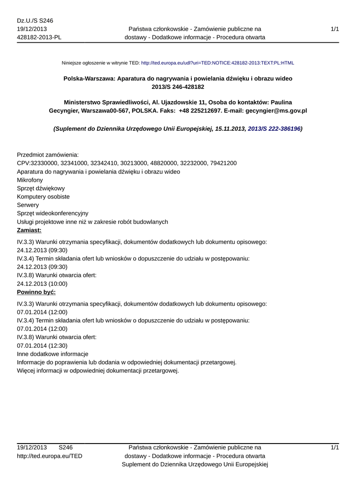Dz.U./S S246 19/12/2013 428182-2013-PL Państwa członkowskie - Zamówienie publiczne na dostawy - Dodatkowe informacje - Procedura otwarta 1/1 Niniejsze ogłoszenie w witrynie TED: http://ted.europa.eu/udl?uri=TED:NOTICE:428182-2013:TEXT:PL:HTML Polska-Warszawa: Aparatura do nagrywania i powielania dźwięku i obrazu wideo 2013/S 246-428182 Ministerstwo Sprawiedliwości, Al. Ujazdowskie 11, Osoba do kontaktów: Paulina Gecyngier, Warszawa00-567, POLSKA. Faks: +48 225212697. E-mail: [email protected] (Suplement do Dziennika Urzędowego Unii Europejskiej, 15.11.2013, 2013/S 222-386196) Przedmiot zamówienia: CPV:32330000, 32341000, 32342410, 30213000, 48820000, 32232000, 79421200 Aparatura do nagrywania i powielania dźwięku i obrazu wideo Mikrofony Sprzęt dźwiękowy Komputery osobiste Serwery Sprzęt wideokonferencyjny Usługi projektowe inne niż w zakresie robót budowlanych Zamiast: IV.3.3) Warunki otrzymania specyfikacji, dokumentów dodatkowych lub dokumentu opisowego: 24.12.2013 (09:30) IV.3.4) Termin składania ofert lub wniosków o dopuszczenie do udziału w postępowaniu: 24.12.2013 (09:30) IV.3.8) Warunki otwarcia ofert: 24.12.2013 (10:00) Powinno być: IV.3.3) Warunki otrzymania specyfikacji, dokumentów dodatkowych lub dokumentu opisowego: 07.01.2014 (12:00) IV.3.4) Termin składania ofert lub wniosków o dopuszczenie do udziału w postępowaniu: 07.01.2014 (12:00) IV.3.8) Warunki otwarcia ofert: 07.01.2014 (12:30) Inne dodatkowe informacje Informacje do poprawienia lub dodania w odpowiedniej dokumentacji przetargowej. Więcej informacji w odpowiedniej dokumentacji przetargowej. 19/12/2013 S246 http://ted.europa.eu/TED Państwa członkowskie - Zamówienie publiczne na dostawy - Dodatkowe informacje - Procedura otwarta Suplement do Dziennika Urzędowego Unii Europejskiej 1/1
