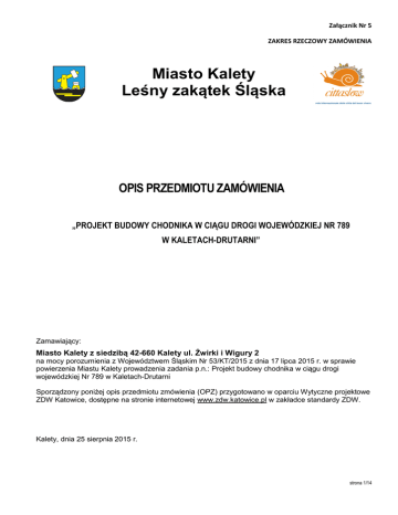 Załącznik Nr 5 ZAKRES RZECZOWY ZAMÓWIENIA Miasto Kalety Leśny zakątek Śląska OPIS PRZEDMIOTU ZAMÓWIENIA „PROJEKT BUDOWY CHODNIKA W CIĄGU DROGI WOJEWÓDZKIEJ NR 789 W KALETACH-DRUTARNI” Zamawiający: Miasto Kalety z siedzibą 42-660 Kalety ul. Żwirki i Wigury 2 na mocy porozumienia z Województwem Śląskim Nr 53/KT/2015 z dnia 17 lipca 2015 r. w sprawie powierzenia Miastu Kalety prowadzenia zadania p.n.: Projekt budowy chodnika w ciągu drogi wojewódzkiej Nr 789 w Kaletach-Drutarni Sporządzony poniżej opis przedmiotu zmówienia (OPZ) przygotowano w oparciu Wytyczne projektowe ZDW Katowice, dostępne na stronie internetowej www.zdw.katowice.pl w zakładce standardy ZDW. Kalety, dnia 25 sierpnia 2015 r. strona 1/14 I. Przedmiot zamówienia. Przedmiotem zamówienia jest: 1) opracowanie kompletnej dokumentacji projektowej budowy chodnika w ciągu drogi wojewódzkiej nr 789 w Kaletach-Drutarni wraz z uzgodnieniami, opiniami i pozwoleniami niezbędnymi do uzyskania decyzji o zezwoleniu na realizację inwestycji drogowej w trybie przepisów ustawy o szczególnych zasadach przygotowania i realizacji inwestycji w zakresie dróg publicznych, 2) przygotowanie dokumentacji geodezyjnej niezbędnej do regulacji stanu własności pasa drogowego drogi wojewódzkiej nr 789 na rzecz Województwa Śląskiego, dotyczącej odcinka objętego projektem, 3) przygotowanie kompletnego wniosku o wydanie decyzji o zezwoleniu na realizację inwestycji drogowej dla zamierzenia budowlanego będącego przedmiotem niniejszego zamówienia, zawierającego niezbędne załączniki wymagane ustawą o szczególnych zasadach przygotowania i realizacji inwestycji w zakresie dróg publicznych. Dokumentacja projektowa budowy chodnika obejmuje odcinek o długości około 800 mb, szerokości 2,0 m, wraz z odwodnieniem, od skrzyżowania z ulicą Koszęcińską (w nawiązaniu do istniejącego chodnika przy rondzie) po stronie południowej, do skrzyżowania na wysokości ulicy Sportowej. II. Charakterystyka zadania: Opis stanu istniejącego. Przedmiot opracowania zlokalizowany jest przy drodze wojewódzkiej nr 789, ul. 3 Maja w Kaletach -Drutarni, na odcinku o długości około 800 mb, od skrzyżowania z ulicą Koszęcińską (w nawiązaniu do istniejącego chodnika przy rondzie) po stronie południowej, do skrzyżowania na wysokości ulicy Sportowej. Na przedmiotowym odcinku droga wojewódzka nr 789 posiada pobocze gruntowe. Ponadto na tym odcinku drogi zlokalizowane są zjazdy indywidualne. Odwodnienie jezdni w sąsiedztwie ronda poprzez wpusty do istniejącej kanalizacji deszczowej w ul. Koszęcińskiej, w dalszym przebiegu wpusty uliczne ze studzienkami chłonnymi, natomiast w pozostałym przebiegu drogi na odcinku objętym opracowaniem, od rzeki Mała Panew do skrzyżowania z ul. Sportową, wody deszczowe spływają na pobocza. Cel inwestycji: Podstawowe cele stawiane w ramach realizowanego zadania inwestycyjnego to: - poprawa bezpieczeństwa ruchu drogowego poprzez skierowanie ruchu pieszego z jezdni drogowej i poboczy gruntowych na chodnik, szczególnie dzieci poruszających się w drodze do i ze szkoły, - kontynuacja budowy ciągów pieszych wzdłuż dróg wojewódzkich, dróg o dużym natężeniu ruchu, przebiegających w granicach administracyjnych m. Kalety. III. Elementy, które powinna zawierać dokumentacja projektowa. 1. Mapa do celów projektowych (1 egz. z klauzulą dla Zamawiającego + egzemplarze dla potrzeb projektowania). Mapę do celów projektowych należy opracować w postaci wektorowej przyjętej do państwowego zasobu geodezyjno-kartograficznego zgodnie z obowiązującymi przepisami. Nie dopuszcza się mapy jednostkowej w postaci rastrowej lub hybrydowej. Mapę do celów projektowych należy opracować w skali 1:500 lub 1:1000. Mapa powinna zawierać w swojej treści przebieg projektowanych i uzgodnionych przez właściwy PZUDP sieci uzbrojenia terenu, lub informację o braku takich uzgodnień w zakresie objętym opracowaniem. Granice działek ewidencyjnych, wchodzących w zakres planowanej inwestycji, mają być przedstawione na mapie do celów projektowych na podstawie dokumentacji geodezyjnej, przyjętej do państwowego zasobu geodezyjnego i kartograficznego po przeprowadzonej analizie, potwierdzającej zgodność tej dokumentacji z obowiązującymi standardami technicznymi. W przypadku braku takiej dokumentacji lub danych niespełniających standardów technicznych, dane dotyczące przebiegu granic ewidencyjnych należy pozyskać w wyniku terenowych pomiarów geodezyjnych, poprzedzonych ustaleniem przebiegu tych granic na gruncie, zgodnie z obowiązującymi strona 2/14 przepisami. Sposób określenia przebiegu granic działek ewidencyjnych ma zostać opisany w legendzie mapy w oryginale, poświadczony przez właściwy miejscowo ośrodek dokumentacji geodezyjno-kartograficznej, oraz wersję numeryczną w formatach .dxf i .pdf na zewnętrznym nośniku danych. W wersji cyfrowej mapy należy oznaczyć sposób stabilizacji punktów granicznych. Mapę do celów projektowych, należy opracować zgodnie z obowiązującymi przepisami i Wytycznymi Projektowymi ZDW w Katowicach, załącznik E. 2. Dokumentacja do regulacji prawnej nieruchomości zajętych istniejącym pasem drogowym drogi wojewódzkiej Dokumentację należy sporządzić w zakresie niezbędnym do złożenia wniosku o uzyskanie decyzji Wojewody Śląskiego o nabyciu z mocy prawa, własności działek położonych w pasach drogowych dróg wojewódzkich na rzecz Województwa Śląskiego, wydanej na podstawie art. 60 lub art. 73 ustawy z dnia 13 października 1998 r. Przepisy wprowadzające ustawy reformujące administrację publiczną lub w zakresie niezbędnym do uzyskania decyzji o podziale nieruchomości na podstawie ustawy z dnia 21 sierpnia 1997 r. o gospodarce nieruchomościami. Zadanie obejmuje również wykonanie kompletnej dokumentacji geodezyjnej dla działek, które tylko częściowo znajdują się w granicach opracowywanego 
