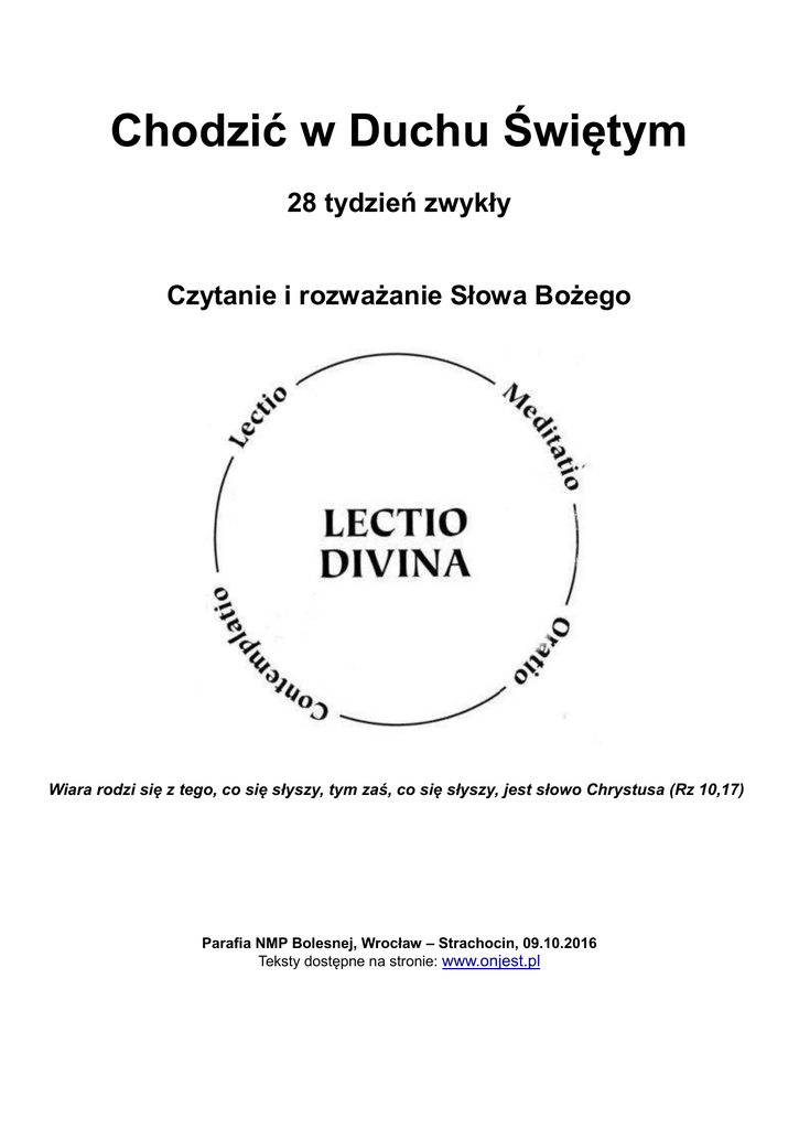 Chodzić w Duchu Świętym 28 tydzień zwykły Czytanie i rozważanie Słowa Bożego Wiara rodzi się z tego, co się słyszy, tym zaś, co się słyszy, jest słowo Chrystusa (Rz 10,17) Parafia NMP Bolesnej, Wrocław – Strachocin, 09.10.2016 Teksty dostępne na stronie: www.onjest.pl Rysunek tygodnia: Opracowanie rozważań: Korekta: Rysunek: Asysta kościelna: Aplikacja mobilna Android: Jolanta i Jerzy Prokopiuk, Łukasz Kneć, Monika Mosior, Jolanta i Krzysztof Mikos, Maria i Marcin Kusio, Przemek i Ewelina Rożnowscy, Dorota Chodor, Justyna i Marcin Miloch Jerzy Prokopiuk Marta Stańco ks. Wojciech Jaśkiewicz Tomek Romanowski Niniejsze rozważania przygotowują osoby ze wspólnoty „On Jest”, Ruchu Światło – Życie Czytania zamieszczone w aneksie: www.liturgia.wiara.pl Lectio divina – metoda osobistego studium Pisma Świętego Mnisi znali dwa sposoby medytacji Słowa Bożego: ruminatio – przetrawianie Słowa Bożego poprzez jego ciągłe powtarzanie oraz lectio divina – Bożą lekturę, w której chodziło o to, aby wszystkie słowa Biblii rozumieć jako drogę do Boga, jako opis drogi duchowej. Kluczowe jest tu pytanie: kim jestem, co jest tajemnicą mojego życia, kim i czym stałem się dzięki Jezusowi Chrystusowi? Kiedy bowiem poprzez medytację poczuję, kim jestem, zmieni się także moje działanie w świecie. Kilka uwag o miejscu modlitwy, czasie oraz pozycji modlitewnej. 1. Miejsce – idealne to kościół czy kaplica z wystawionym Najświętszym Sakramentem. W praktyce będzie to każde miejsce, w którym znajdziemy choć odrobinę wyciszenia. 2. Czas – przynajmniej kwadrans. Dobrze jeśli będzie to pół godziny. Pora dnia nie jest istotna, ważne tylko, byśmy byli przytomni i w czasie modlitwy nie zasnęli. 3. Pozycja w czasie modlitwy – godna i wygodna. Można klęczeć, siedzieć na małej ławeczce, można też zwyczajnie usiąść na wygodnym krześle przy stole. Przebieg lectio divina Istotą tej metody jest jej podział na kilka części: 1. Czytanie (lectio), 2. Medytację (meditatio), 3. Modlitwę (oratio) i trwanie przed Bogiem (contemplatio). 4. Działanie (actio) Całość powinna być poprzedzona chwilą wyciszenia, skupienia, prośbą skierowaną do Ducha Świętego o dobre owoce. Na zakończenie powinniśmy podziękować Bogu oraz dokonać refleksji nad naszą modlitwą – jak się czuliśmy, co było dobre w tej modlitwie a co należałoby w niej poprawić w przyszłości. Lectio – Czytaj z wiarą i uważnie święty tekst, jak gdyby dyktował go dla ciebie Duch Święty. Wybieramy dłuższy fragment tekstu. Nie zakładamy, że przeczytamy go w całości. Może się zdarzyć, że już pierwszy werset będzie tym fragmentem nad którym powinniśmy zatrzymać się dłużej. Czytam Pismo Święte powoli i uważnie, nie po to, by pomnożyć swoją wiedzę, lecz by spotkać Boga w Jego Słowie. W czytaniu chodzi bowiem o znalezienie takiego fragmentu (zwykle będzie to jeden werset), który nas poruszy. To poruszenie może mieć bardzo różny charakter. Może to być ciekawość, niezrozumienie, pociecha, piękno, niepokój. Poruszenie jest świadectwem, że ten werset jest dla nas osobiście ważny. Bardzo ważną informacją jest złość lub agresja rodząca się podczas czytania Słowa Bożego. Oznacza ona bowiem, że Jezus w Słowie Bożym dotyka jakiejś nieuporządkowanej dziedziny naszego życia. Jest bardzo istotne zwrócenie uwagi na uczucia, które nam towarzyszą. Nie mamy wpływu na uczucia, które się rodzą. Są ważne ponieważ, ukazują nam one stan naszego serca. Nie ma uczuć dobrych i złych, ponieważ są one obojętne moralnie. Jeżeli rodzi się uczucie zazdrości lub niechęci to nie jest to grzechem. Materią grzechu będzie dopiero nasza odpowiedź na to uczucie. Znalezienie tekstu, który Cię porusza jest sygnałem, że kończy się etap lectio. Meditatio – Staraj się zrozumieć dogłębnie tekst. Pytaj siebie: „Co Bóg mówi do mnie?”. Pierwotne, łacińskie znaczenie tego słowa to „powtarzanie”. W tej części koncentrujemy się na znalezionym urywku. Czytamy go wielokrotnie, powoli, jakby smakując – całość wersetu lub jego fragmenty. Czytając możemy akcentować różne części i wyrazy wersetu. Prawdopodobnie nauczymy się w ten sposób wersetu na pamięć. Powtarzajmy go zatem także w myśli – może nam pomóc zamknięcie oczu. Angażujmy na tym etapie nie tylko rozum ale także i serce. Można się zastanowić, dlaczego ten fragment mnie zainteresował, pytać się co ten fragment mi mówi, objawia, komunikuje. Ważne jest aby medytować tylko jeden fragment. Jeśli poruszyło cię więcej fragmentów, zatrzymaj się na pierwszym, pozostałe w tej medytacji cię nie interesują. Oratio – Teraz ty mów do Boga a jeśli zabraknie Ci słów to trwaj przed nim bez słów (contemplatio). Na pewnym etapie medytacji zamienia się ona w modlitwę. Będzie ona miała spontaniczny charakter. Otwórz przed Bogiem serce, aby mówić Mu o przeżyciach, które rodzi w tobie słowo. Módl się prosto i spontanicznie. Czasami będzie to nasza aktywność, ale możemy też być „porwani” przez Boże natchnienie. Wtedy modlitwa stanie się bardziej działaniem Boga w nas niż naszym działaniem. Trudno przewidzieć, co przyniesie modlitwa, jaki dokładnie charakter i kierunek przybierze. Może to być zarówno przebłaganie, prośba jak i dziękczynienie i uwielbienie. Może mieć także charakter krótkiej, żarliwej modlitwy, proszącej Boga, by ukoił moja tęsknotę, by pozwolił się doświadczyć i ujrzeć. Na lub po etapie oratio - Twojej modlitwy do Boga, którą wzbudziło rozważanie danego fragmentu - może przyjść czas, że braknie Ci słów. Trwaj wtedy przy Bogu bez słów - wtedy modlisz się samą swoją obecnością a Duch Święty działający w Tobie będzie kierował do Boga taką modlitwę, która Jemu się podoba: "Podobnie także Duch przychodzi z pomocą naszej s