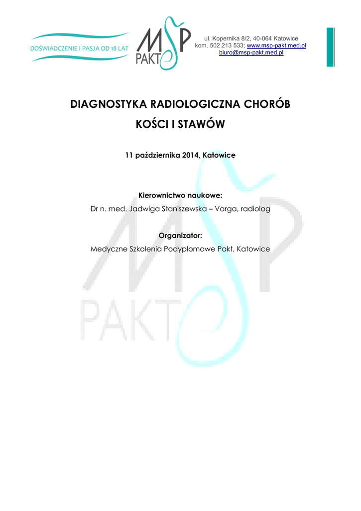 ul. Kopernika 8/2, 40-064 Katowice kom. 502 213 533; www.msp-pakt.med.pl [email protected] DIAGNOSTYKA RADIOLOGICZNA CHORÓB KOŚCI I STAWÓW 11 października 2014, Katowice Kierownictwo naukowe: Dr n. med. Jadwiga Staniszewska – Varga, radiolog Organizator: Medyczne Szkolenia Podyplomowe Pakt, Katowice ul. Kopernika 8/2, 40-064 Katowice kom. 502 213 533; www.msp-pakt.med.pl [email protected] PROGRAM KURSU: 9.00-10.30 Choroby układowe tkanki łącznej 1. Reumatoidalne zapalenie stawów 2. Młodzieńcze przewlekłe zapalenie stawów 3. Inne choroby układowe tkanki łącznej 10.30-12.00 Seronegatywne spondyloartropatie 1. Zesztywniające zapalenie stawów kręgosłupa 2. Łuszczycowe zapalenie stawów 3. Reaktywne zapalenie stawów 4. Zapalenie stawów towarzyszące enteropatiom 12.00-13.00 Przerwa obiadowa 13.00-14.30 Zmiany zwyrodnieniowo-wytwórcze stawów obwodowych. Zmiany zwyrodnieniowo-wytwórcze kręgosłupa. 14.30-16.00 Choroby stawów wywołane przez kryształy 1. Choroby metaboliczne kości (choroba osteomalacja, nadczynność przytarczyc) 2. Ochronoza, 3. Sarkoidoza 4. Nowotwory pageta, osteoporoza,