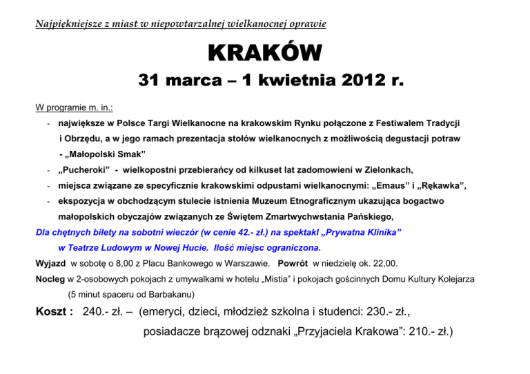 Najpiękniejsze z miast w niepowtarzalnej wielkanocnej oprawie KRAKÓW 31 marca – 1 kwietnia 2012 r. W programie m. in.: - największe w Polsce Targi Wielkanocne na krakowskim Rynku połączone z Festiwalem Tradycji i Obrzędu, a w jego ramach prezentacja stołów wielkanocnych z możliwością degustacji potraw - „Małopolski Smak” - „Pucheroki” - wielkopostni przebierańcy od kilkuset lat zadomowieni w Zielonkach, - miejsca związane ze specyficznie krakowskimi odpustami wielkanocnymi: „Emaus” i „Rękawka”, - ekspozycja w obchodzącym stulecie istnienia Muzeum Etnograficznym ukazująca bogactwo małopolskich obyczajów związanych ze Świętem Zmartwychwstania Pańskiego, Dla chętnych bilety na sobotni wieczór (w cenie 42.- zł.) na spektakl „Prywatna Klinika” w Teatrze Ludowym w Nowej Hucie. Ilość miejsc ograniczona. Wyjazd w sobotę o 8,00 z Placu Bankowego w Warszawie. Powrót w niedzielę ok. 22,00. Nocleg w 2-osobowych pokojach z umywalkami w hotelu „Mistia” i pokojach gościnnych Domu Kultury Kolejarza (5 minut spaceru od Barbakanu) Koszt : 240.- zł. – (emeryci, dzieci, młodzież szkolna i studenci: 230.- zł., posiadacze brązowej odznaki „Przyjaciela Krakowa”: 210.- zł.) Informacje i zapisy (dla osób zainteresowanych spektaklem „Prywatna klinika” – według kolejności zgłoszeń – nie później niż do 12 marca): w BP „Imperial” ul. Ogrodowa 67 (tel. 22 654-89-89) i u kierownika wycieczki - Marka Piaseckiego (tel. 603 404 213). Spektakl „Prywatna Klinika” to jeden z największych sukcesów w historii krakowskich teatrów. Grany nieprzerwanie od 10 lat, 63.000 widzów !!!!!, 200 spektakli. Sztuka, której autorami jest znakomity duet: John Chapman i Dave Freeman znalazła się w repertuarze kilkunastu teatrów w całej Polsce. Inne propozycje kulturalne na sobotni wieczór: - spektakl „Atrament dla leworęcznych” grany od wielu lat na scenie Teatru „KTO”, - koncert fortepianowy w Filharmonii Krakowskiej w wykonaniu Olgi Kern z towarzyszeniem orkiestry pod batutą Antoniego Wita (w repertuarze: A. Dvorak, R. Strauss, S. Rachmaninow), - największy koncert w ramach XVII-ych Dni Bachowskich w znanym ze znakomitych warunków akustycznych kościele OO. Bernardynów w pobliżu Wawelu, - koncert muzyki klezmerskiej w nowatorskich aranżacjach: „Di Galitzyaner Klezmorim”, - spektakl „Szyc” w Teatrze „Barakah” (Piwnica Klezmer- Hois na Kazimierzu).