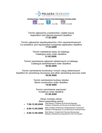 INTERNATIONAL TRADE FAIR OF FOOD PROCESSING TECHNOLOGIES 13-17.09 14-17.09 14-17.09 Termin zgłoszenia uczestnictwa i wpłaty kaucji Application and deposit payment deadline 17.03.2009 Termin zgłoszenia współwystawców i firm reprezentowanych Co-exhibitors and represented companies application deadline 17.03.2009 Termin nadesłania wpisu do katalogu Catalogue entry order deadline 31.05.2009. Termin zamówienia ogłoszeń reklamowych w katalogu Catalogue advertisement order deadline 30.06.2009 Termin zamówienia konstrukcji i innych usług reklamowych Deadline for advertising structures and other advertising services order 30.06.2009 Termin zamówienia budowy stoiska Stand construction order deadline 10.08.2009 Termin zamówienia zaproszeń Invitations order deadline 01.08.2009 Okres montaŜu stoisk Stand assembling period Salon Maszyn i Urządzeń dla Przemysłu Mięsnego 7.09-12.09.2009 Exhibition of Machines and Devices for the Meat Industry 8.09-13.09.2009 Salon Urządzeń Chłodniczych, Klimatyzacyjnych i Grzewczych Exhibition of Refrigerating, Air-Conditioning and Heating Devices 8.09-13.09.2009 Salon Maszyn i Urządzeń dla Przemysłu SpoŜywczego Exhibition of Machines and Equipment for the Food Industry