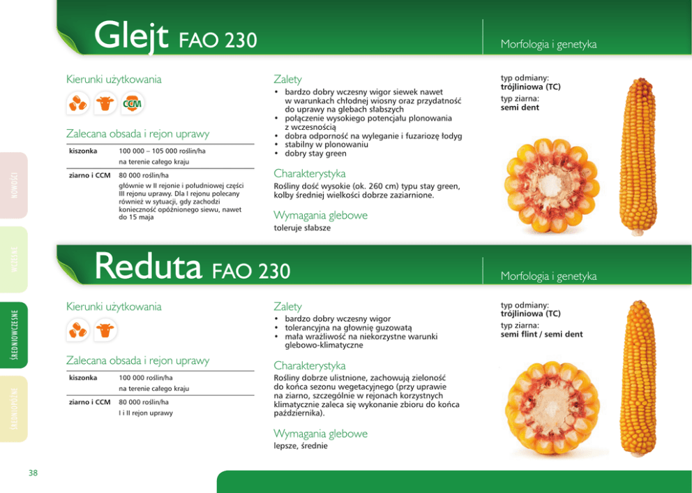 Glejt FAO 230 Kierunki użytkowania Zalecana obsada i rejon uprawy kiszonka 100 000 – 105 000 roślin/ha na terenie całego kraju NOWOŚCI ziarno i CCM 80 000 roślin/ha głównie w II rejonie i południowej części III rejonu uprawy. Dla I rejonu polecany również w sytuacji, gdy zachodzi konieczność opóźnionego siewu, nawet do 15 maja Morfologia i genetyka Zalety • bardzo dobry wczesny wigor siewek nawet w warunkach chłodnej wiosny oraz przydatność do uprawy na glebach słabszych • połączenie wysokiego potencjału plonowania z wczesnością • dobra odporność na wyleganie i fuzariozę łodyg • stabilny w plonowaniu • dobry stay green typ odmiany: trójliniowa (TC) typ ziarna: semi dent Charakterystyka Rośliny dość wysokie (ok. 260 cm) typu stay green, kolby średniej wielkości dobrze zaziarnione. Wymagania glebowe toleruje słabsze WCZESNE Reduta FAO 230 ŚREDNIOWCZESNE Kierunki użytkowania Zalety • bardzo dobry wczesny wigor • tolerancyjna na głownię guzowatą • mała wrażliwość na niekorzystne warunki glebowo-klimatyczne Zalecana obsada i rejon uprawy kiszonka 100 000 roślin/ha ŚREDNIOPÓŹNE na terenie całego kraju ziarno i CCM 80 000 roślin/ha I i II rejon uprawy Charakterystyka Rośliny dobrze ulistnione, zachowują zieloność do końca sezonu wegetacyjnego (przy uprawie na ziarno, szczególnie w rejonach korzystnych klimatycznie zaleca się wykonanie zbioru do końca października). Wymagania glebowe lepsze, średnie 38 Morfologia i genetyka typ odmiany: trójliniowa (TC) typ ziarna: semi flint / semi dent