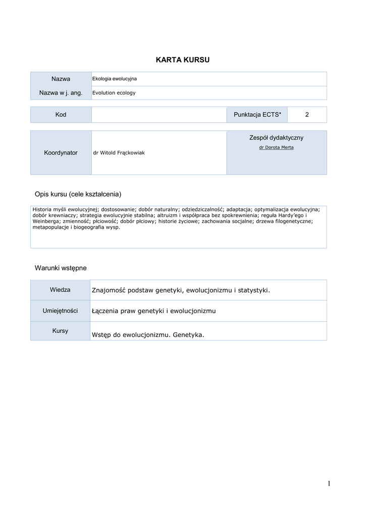 KARTA KURSU Nazwa Ekologia ewolucyjna Nazwa w j. ang. Evolution ecology Kod Punktacja ECTS* 2 Zespół dydaktyczny Koordynator dr Witold Frąckowiak dr Dorota Merta Opis kursu (cele kształcenia) Historia myśli ewolucyjnej; dostosowanie; dobór naturalny; odziedziczalność; adaptacja; optymalizacja ewolucyjna; dobór krewniaczy; strategia ewolucyjnie stabilna; altruizm i współpraca bez spokrewnienia; reguła Hardy’ego i Weinberga; zmienność; płciowość; dobór płciowy; historie życiowe; zachowania socjalne; drzewa filogenetyczne; metapopulacje i biogeografia wysp. Warunki wstępne Wiedza Umiejętności Kursy Znajomość podstaw genetyki, ewolucjonizmu i statystyki. Łączenia praw genetyki i ewolucjonizmu Wstęp do ewolucjonizmu. Genetyka. 1 Efekty kształcenia Efekt kształcenia dla kursu W01 Zna mechanizmy ewolucji Odniesienie do efektów kierunkowych K_W02 K_W07 Wiedza W02 Zna sposób matematycznego odwzorowania podstawowych praw ewolucji K_W01 K_W14 K_W15 W03 Potrafi scharakteryzować zależności organizmów i środowiska w aspekcie konkurencji wewnątrzgatunkowej K_W06 W04 Posiada wiedzę dotyczącą podstawowych praw ekologii ewolucyjnej K_W07 W05 Potrafi odróżnić mechanizmy genetyczne rządzące gatunkiem, populacją, osobnikiem K_W02 K_W08 K_W09 Efekt kształcenia dla kursu Umiejętności Odniesienie do efektów kierunkowych U01 Stosuje podstawowe elementy statystyki do określania zależności między osobnikami K_U01 U02 Stosuje zasady genetyki w analizie konkurencji między osobnikami K_U06 U03 Potrafi znaleźć przykłady praw ekologii ewolucyjnej w środowisku naturalnym K_U06 U04 Potrafi powiązać poszczególne pojedyncze obserwacje w wyprowadzaniu ogólnych zasad K_U07 U05 Potrafi konfrontować swoje myśli w grupie K_U07 2 Odniesienie do efektów kierunkowych Efekt kształcenia dla kursu Kompetencje społeczne K_K04 K01 Ma świadomość swojego własnego spojrzenia na pewne mechanizmy ewolucji Organizacja Forma zajęć Ćwiczenia w grupach Wykład (W) A Liczba godzin K L S P E 15 Opis metod prowadzenia zajęć Wykłady, prezentacje multimedialne. Dyskusje w grupie w zakresie omawianego przedmiotu. W01 W02 W03 W04 W05 U01 U02 U03 U04 U05 K01 Inne Egzamin pisemny Egzamin ustny Praca pisemna (esej) Referat Udział w dyskusji Projekt grupowy Projekt indywidualny Praca laboratoryjna Zajęcia terenowe Ćwiczenia w szkole Gry dydaktyczne E – learning Formy sprawdzania efektów kształcenia X X X X X X X X X X X 3 Egzamin pisemny Kryteria oceny Uwagi Treści merytoryczne (wykaz tematów) 1. Wprowadzenie do ekologii ewolucyjnej 2. Optymalizacja ewolucyjna 3. Altruizm i współpraca bez spokrewnienia 4. Dobór krewniaczy 5. Strategia ewolucyjnie stabilna 6. Reguła Hardy’ego i Weinberga 7. Płciowość i dobór płciowy 8. Zachowania socjalne w aspekcie ekologii ewolucyjnej 9. Drzewa filogenetyczne 10. Metapopulacje i biogeografia wysp . Wykaz literatury podstawowej 1. Ekologia ewolucyjna. Adam Łomnicki. PWN 2012. Wykaz literatury uzupełniającej 2. Samolubny gen. Dawkins Richard. Prószyński Media. 2012. 3. Bóg Dawkinsa. Wydawnictwo Uniwersytetu Jagiellońskiego, 2008 4. Eksperymentalna analiza rozmieszczenia i liczebności. Charles J. Krebs. Wydawnictwo Naukowe PWN, 2011 Bilans godzinowy zgodny z CNPS (Całkowity Nakład Pracy Studenta) Ilość godzin w kontakcie z prowadzącymi Ilość godzin pracy studenta bez kontaktu z prowadzącymi Wykład 15 Konwersatorium (ćwiczenia, laboratorium itd.) 0 Pozostałe godziny kontaktu studenta z prowadzącym 0 Lektura w ramach przygotowania do zajęć 30 Przygotowanie krótkiej pracy pisemnej lub referatu po zapoznaniu się z niezbędną literaturą przedmiotu 0 Przygotowanie projektu lub prezentacji na podany temat (praca w grupie) 0 Przygotowanie do egzaminu 15 Ogółem bilans czasu pracy 60 Ilość punktów ECTS w zależności od przyjętego przelicznika 2 4 5