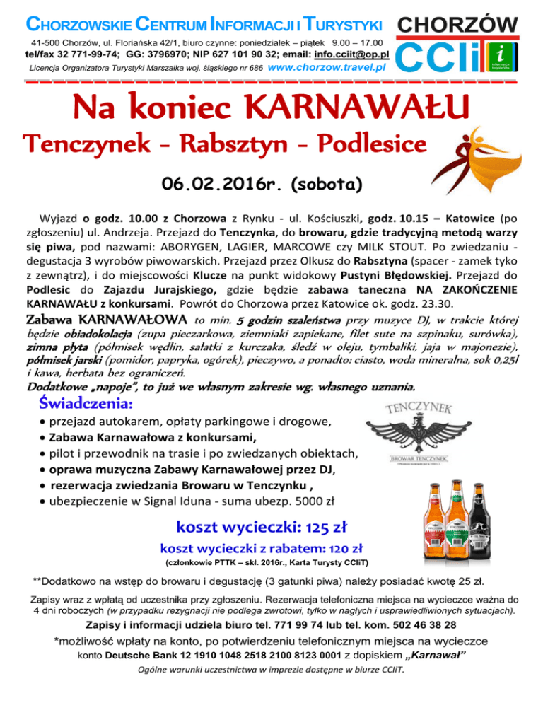 CHORZOWSKIE CENTRUM INFORMACJI I TURYSTYKI 41-500 Chorzów, ul. Floriańska 42/1, biuro czynne: poniedziałek – piątek 9.00 – 17.00 tel/fax 32 771-99-74; GG: 3796970; NIP 627 101 90 32; email: [email protected] Licencja Organizatora Turystyki Marszałka woj. śląskiego nr 686 www.chorzow.travel.pl Na koniec KARNAWAŁU Tenczynek - Rabsztyn - Podlesice 06.02.2016r. (sobota) Wyjazd o godz. 10.00 z Chorzowa z Rynku - ul. Kościuszki, godz. 10.15 – Katowice (po zgłoszeniu) ul. Andrzeja. Przejazd do Tenczynka, do browaru, gdzie tradycyjną metodą warzy się piwa, pod nazwami: ABORYGEN, LAGIER, MARCOWE czy MILK STOUT. Po zwiedzaniu degustacja 3 wyrobów piwowarskich. Przejazd przez Olkusz do Rabsztyna (spacer - zamek tyko z zewnątrz), i do miejscowości Klucze na punkt widokowy Pustyni Błędowskiej. Przejazd do Podlesic do Zajazdu Jurajskiego, gdzie będzie zabawa taneczna NA ZAKOŃCZENIE KARNAWAŁU z konkursami. Powrót do Chorzowa przez Katowice ok. godz. 23.30. Zabawa KARNAWAŁOWA to min. 5 godzin szaleństwa przy muzyce DJ, w trakcie której będzie obiadokolacja (zupa pieczarkowa, ziemniaki zapiekane, filet sute na szpinaku, surówka), zimna płyta (półmisek wędlin, sałatki z kurczaka, śledź w oleju, tymbaliki, jaja w majonezie), półmisek jarski (pomidor, papryka, ogórek), pieczywo, a ponadto: ciasto, woda mineralna, sok 0,25l i kawa, herbata bez ograniczeń. Dodatkowe „napoje”, to już we własnym zakresie wg. własnego uznania. Świadczenia: przejazd autokarem, opłaty parkingowe i drogowe, Zabawa Karnawałowa z konkursami, pilot i przewodnik na trasie i po zwiedzanych obiektach, oprawa muzyczna Zabawy Karnawałowej przez DJ, rezerwacja zwiedzania Browaru w Tenczynku , ubezpieczenie w Signal Iduna - suma ubezp. 5000 zł koszt wycieczki: 125 zł koszt wycieczki z rabatem: 120 zł (członkowie PTTK – skł. 2016r., Karta Turysty CCIiT) **Dodatkowo na wstęp do browaru i degustację (3 gatunki piwa) należy posiadać kwotę 25 zł. Zapisy wraz z wpłatą od uczestnika przy zgłoszeniu. Rezerwacja telefoniczna miejsca na wycieczce ważna do 4 dni roboczych (w przypadku rezygnacji nie podlega zwrotowi, tylko w nagłych i usprawiedliwionych sytuacjach). Zapisy i informacji udziela biuro tel. 771 99 74 lub tel. kom. 502 46 38 28 *możliwość wpłaty na konto, po potwierdzeniu telefonicznym miejsca na wycieczce konto Deutsche Bank 12 1910 1048 2518 2100 8123 0001 z dopiskiem „Karnawał” Ogólne warunki uczestnictwa w imprezie dostępne w biurze CCIiT.
